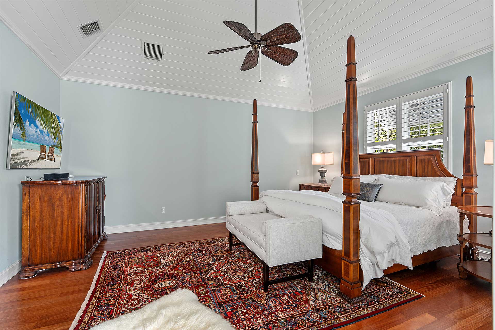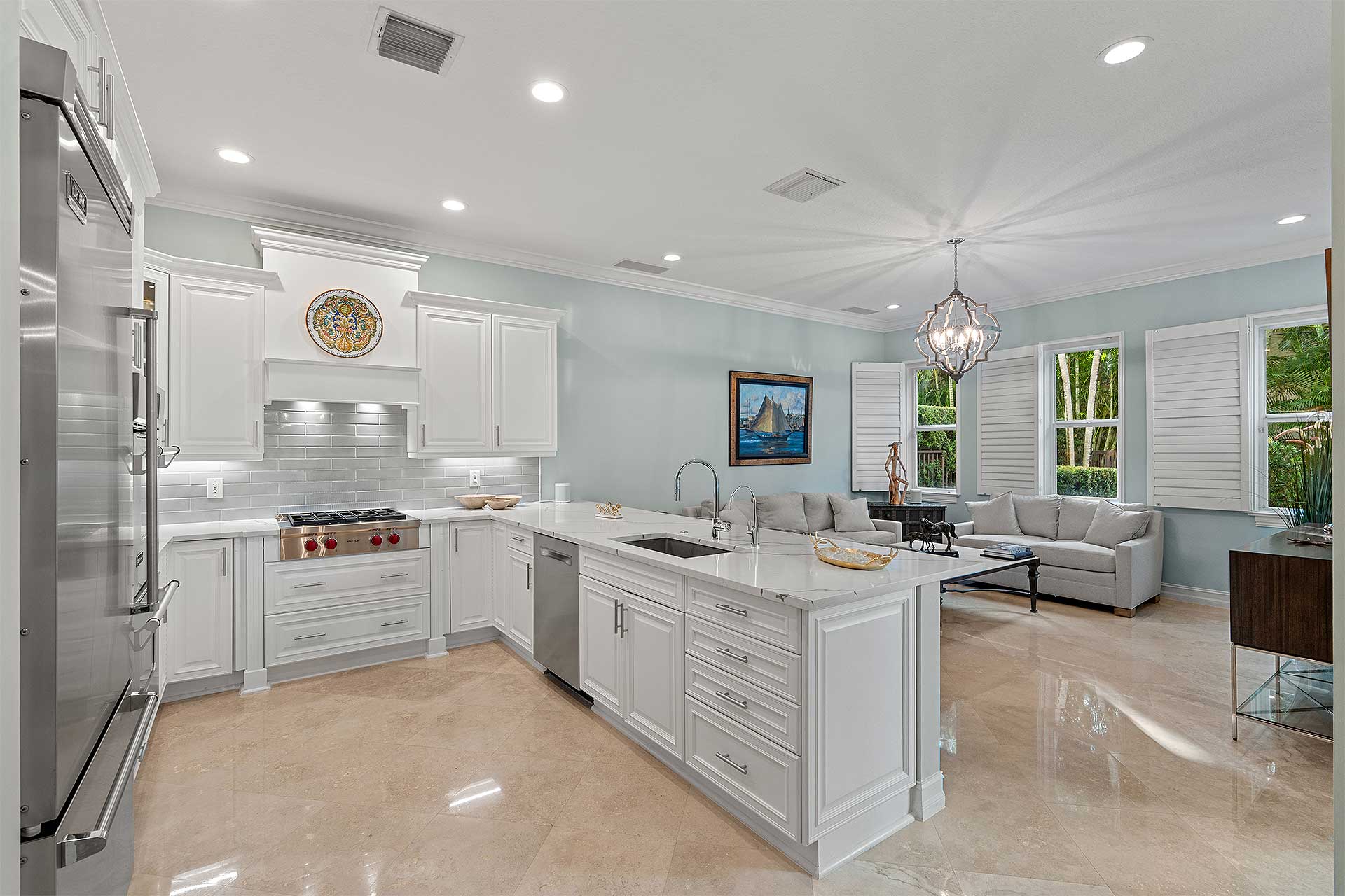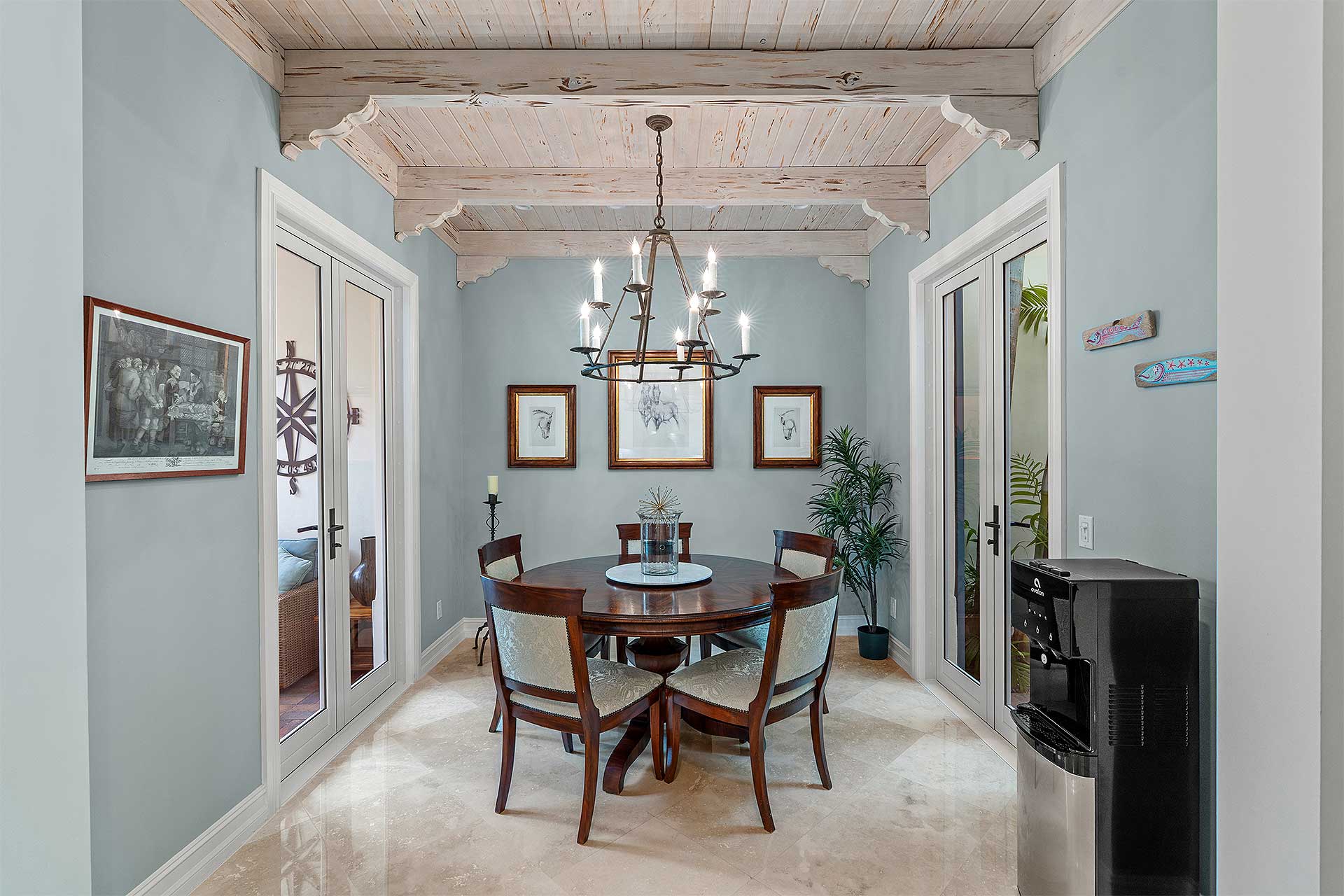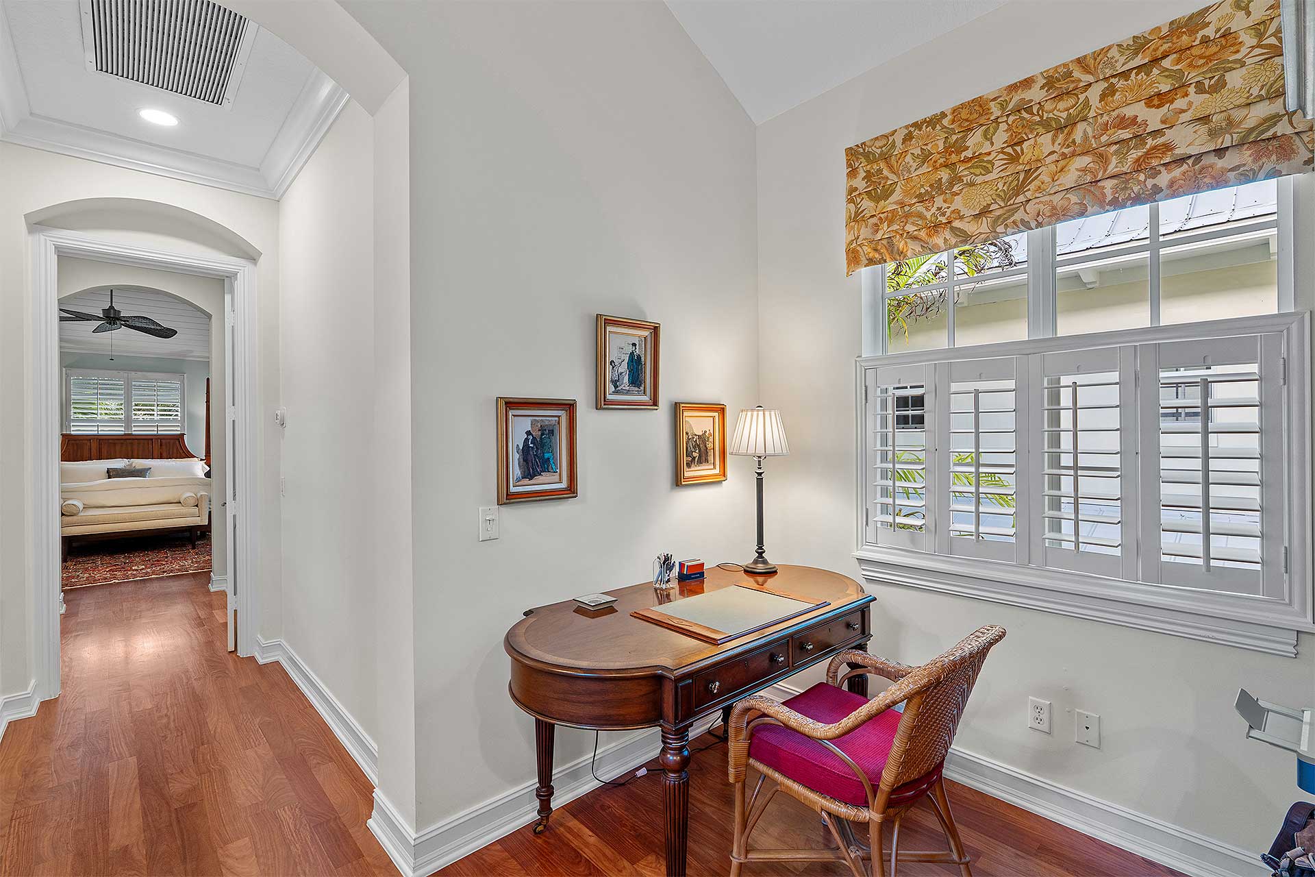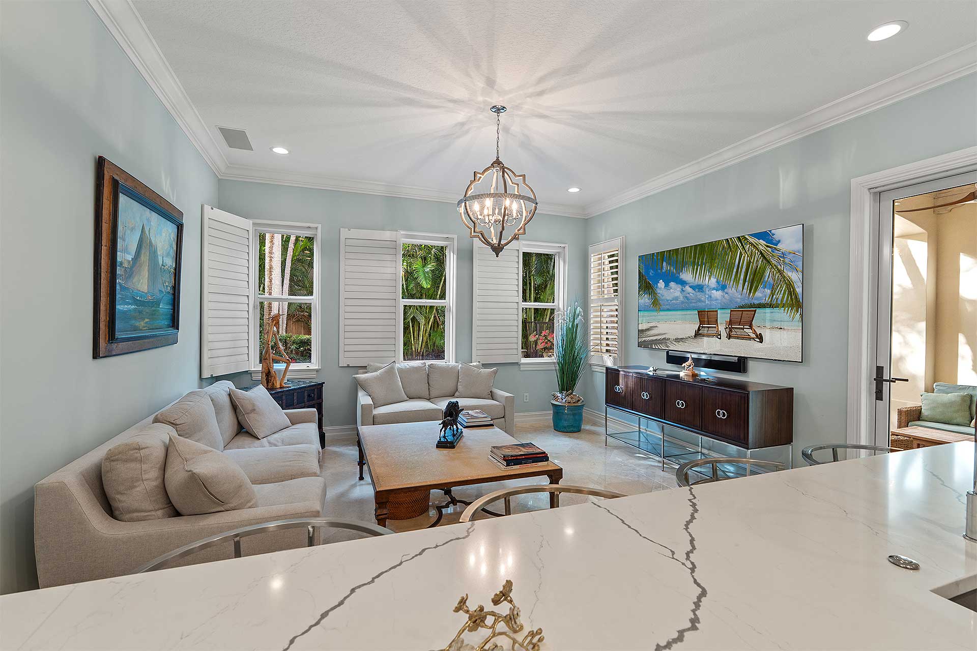 A tranquil seaside retreat, this coastal /contemporary three-bedroom townhome, with 3,863± total-square-feet under the roof area, was developed by Ironwood Properties, renowned for creating residents with elegant detail-oriented architecture distinguished by quality materials and fine craftsmanship. Designed to accommodate garden views and an indoor-outdoor aesthetic, the living room and dining room overlook the serene front courtyard. Additionally, the dining room adjoins the pool loggia, both highlighted by handsome pecky cypress ceilings. The renovated island kitchen is finished with custom cabinetry, quartz countertops and high-end appliances, while the family room, just adjacent, accesses the pool loggia. Upstairs, the hallway with an office area connects the primary suite to the two guest bedroom suites in a split-bedroom plan for privacy. Highlights in the primary bedroom include a tongue-and-groove peaked ceiling and a pool-view balcony. The suite comprises two walk-in closets, a shoe closet and a renovated bathroom finished with tile flooring, custom cabinets, quartz countertops, dual sinks, spa tub and a glass-eclosed multi-head shower. The two guest bedrooms share an updated bathroom, and completing the overall layout are a half-bath, laundry room with a breakfast bar and the two-car garage. Features include planation shutters, phantom screens and marble flooring downstairs, while new details throughout include LED lighting and impact-rated doors, along with new carpeting, baseboards and wood flooring upstairs.