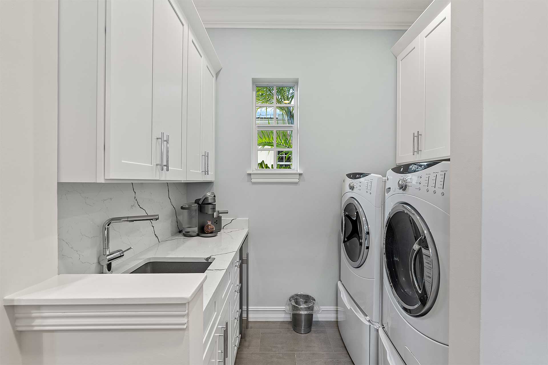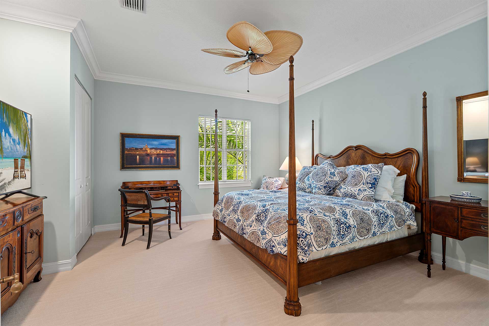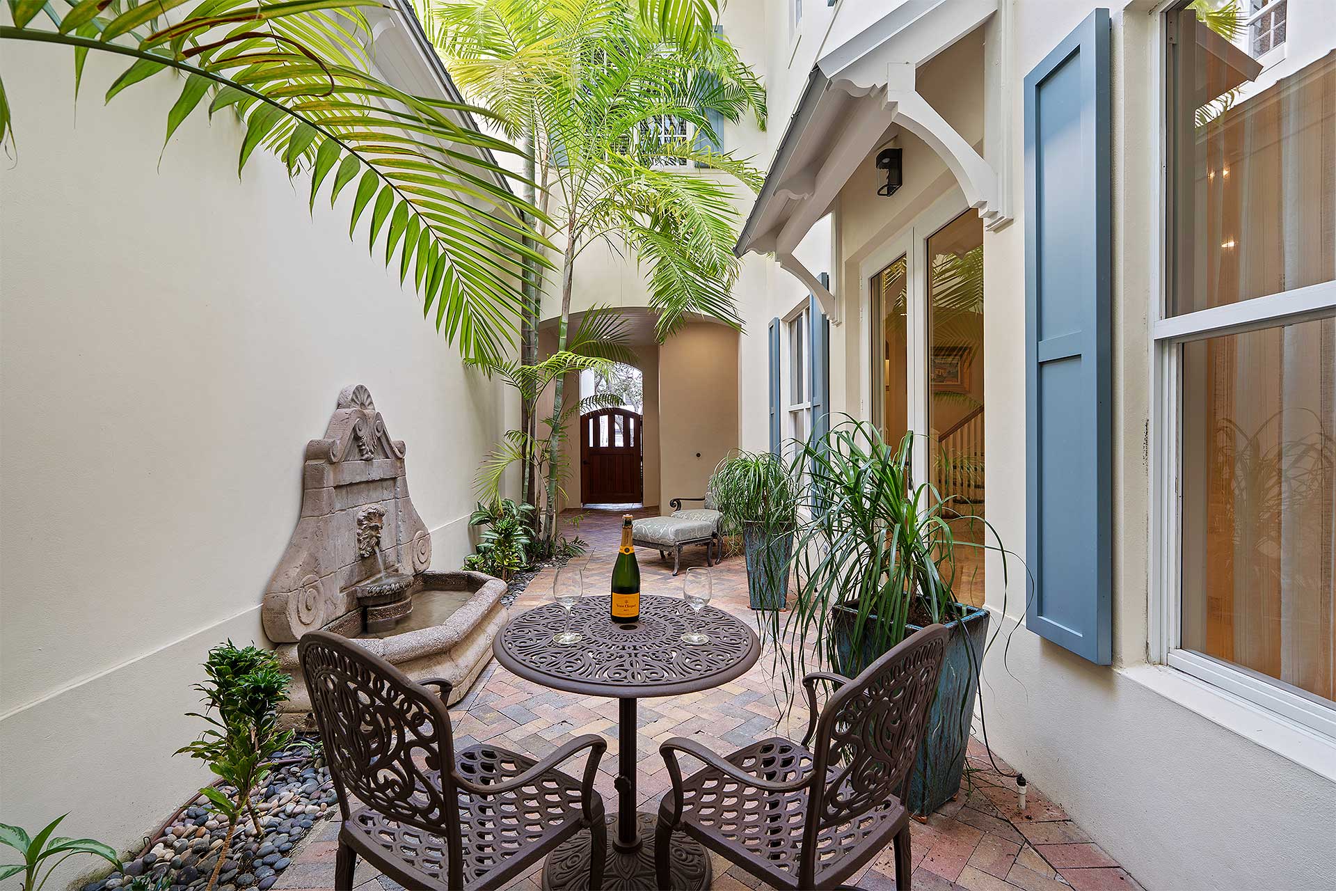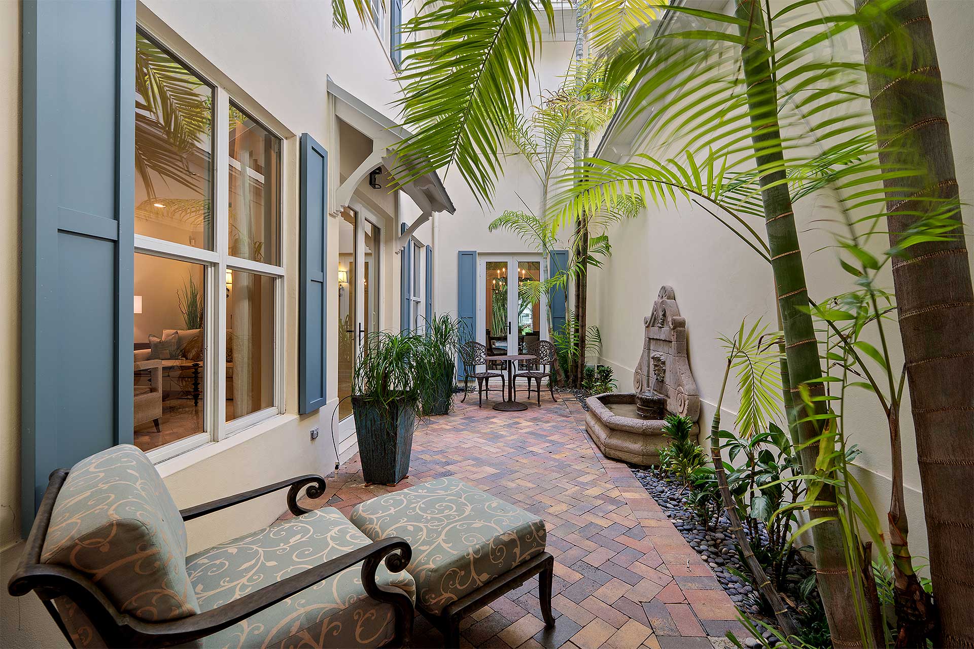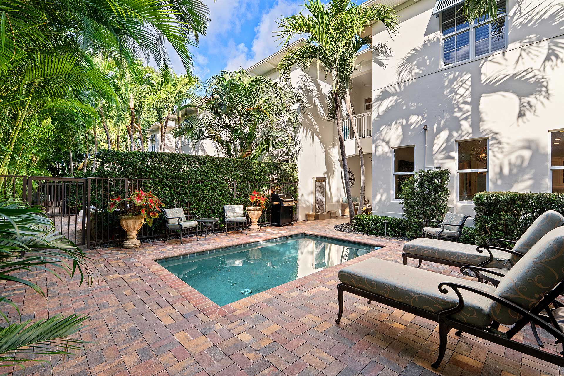 A tropically landscaped oasis, residents enjoy indoor/outdoor living in the gated front courtyard featuring a fountain, and on the inviting covered loggia overlooking a private heated pool, set within a brick patio and secluded by mature palms along the property line.