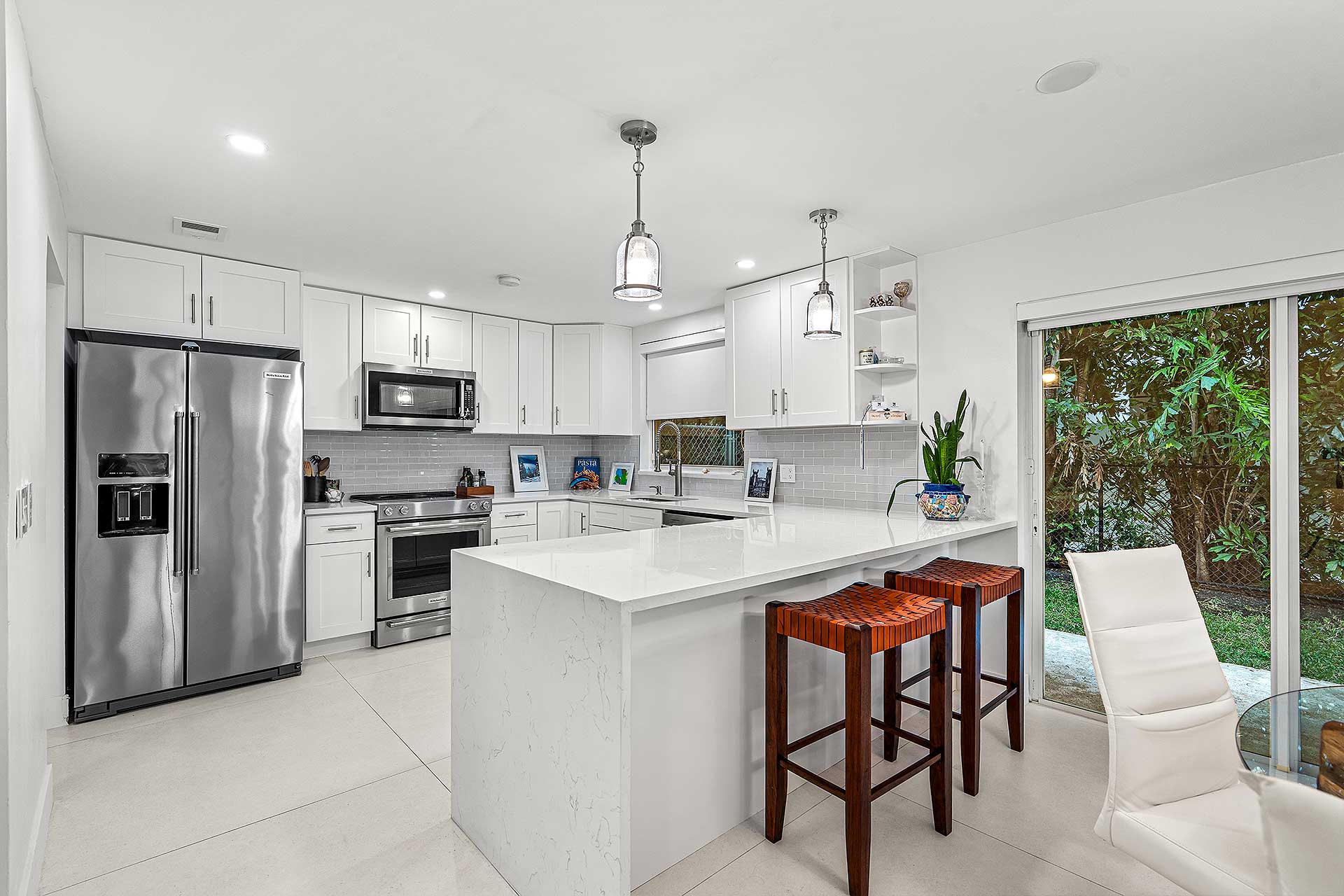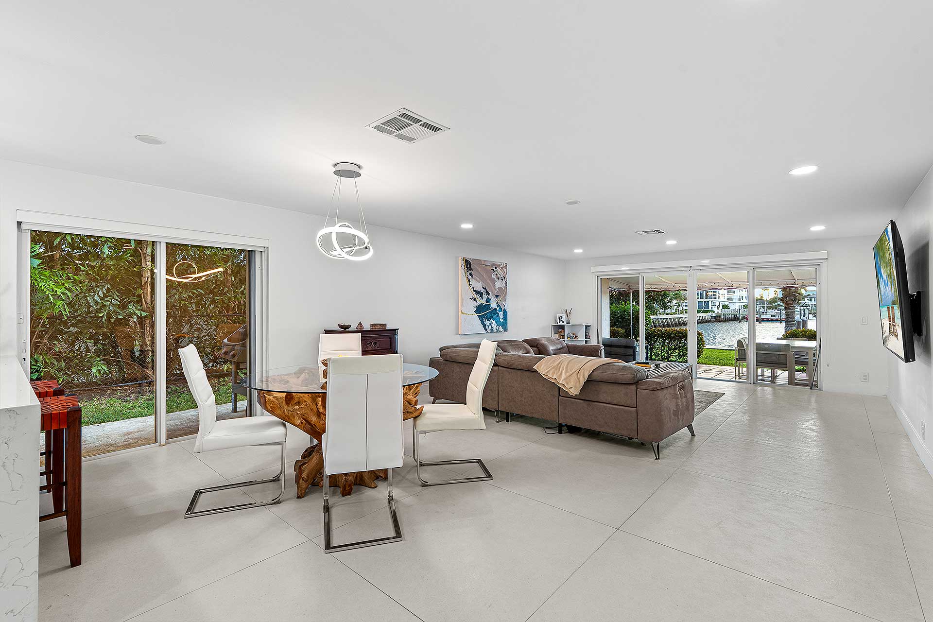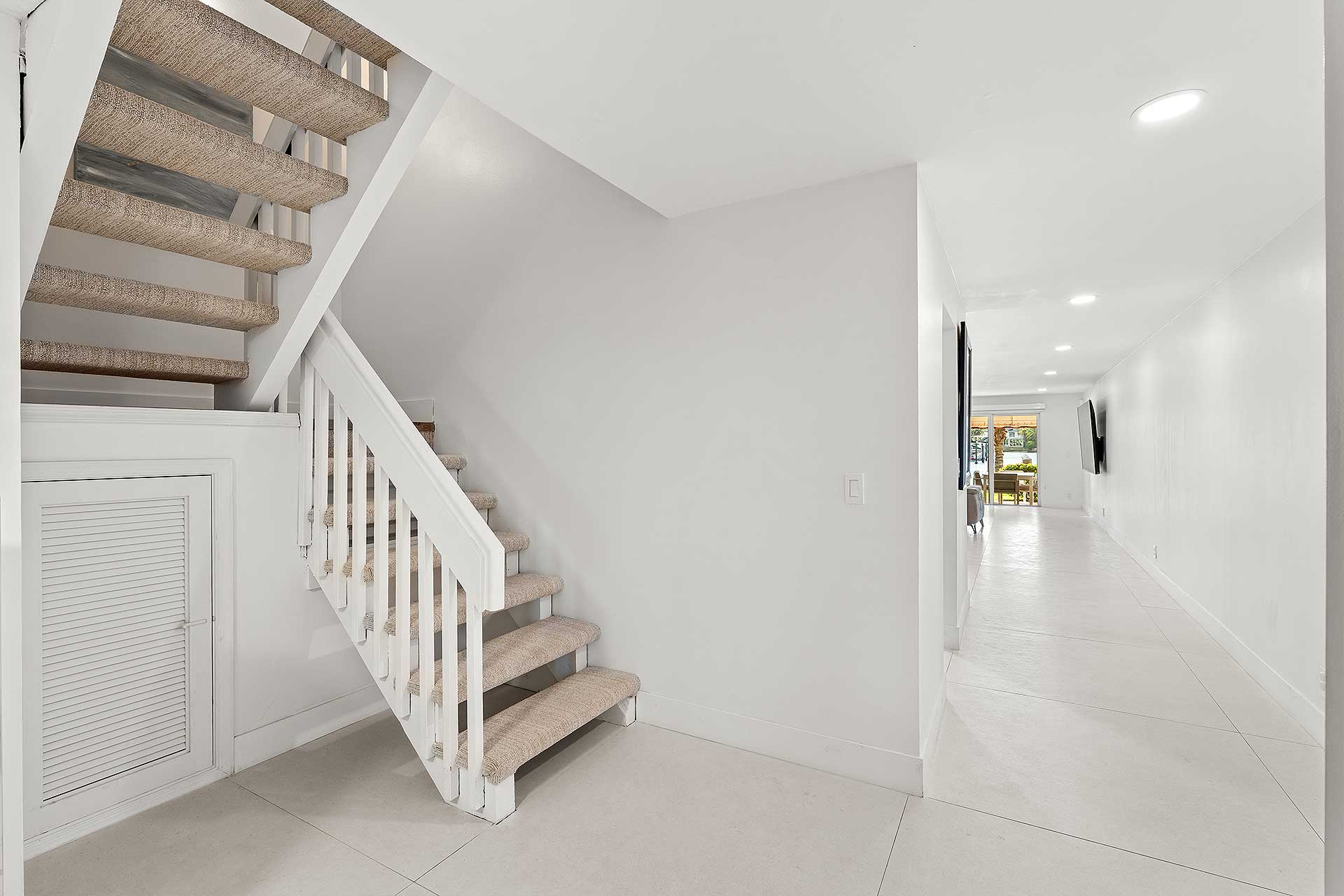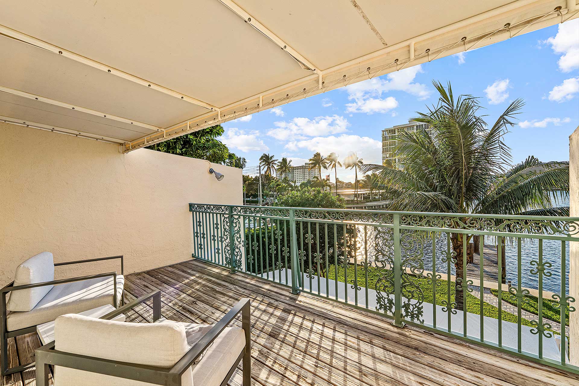 Perfect for indoor/outdoor living and boating, this completely renovated three-bedroom residence, with 2,048 total square feet, offers a prime no wake Intracoastal Waterway setting in the coveted Seagate neighborhood, close to the beach and Downtown Delray Beach’s vibrant Atlantic Avenue. With a light-filled ambience and oriented for water views, the living and dining area are designed in an open-concept plan, with one set of sliding doors opening to an awning-covered patio that flows out to the Intercoastal Waterway dock on, and a second set opening to a pocket garden. The adjacent kitchen is finished with custom cabinetry, quartz countertops, sea-glass tile backsplashes, a breakfast counter and high-end stainless-steel appliances. On the second floor, the primary suite includes a bedroom opening to a large awning-covered balcony overlooking Intracoastal sunset views, along with a custom-fitted walk-in closet and a bathroom with custom cabinetry, quartz countertops, dual sinks, a glass-enclosed shower and soaking tub. Of the two ensuite guest bedrooms, one accesses an east-facing balcony. Completing the floor plan are a half-bath, laundry and a one-car garage with an oversized driveway. Details throughout include wood and large-format tile flooring along with blinds and plantation shutter window coverings.
