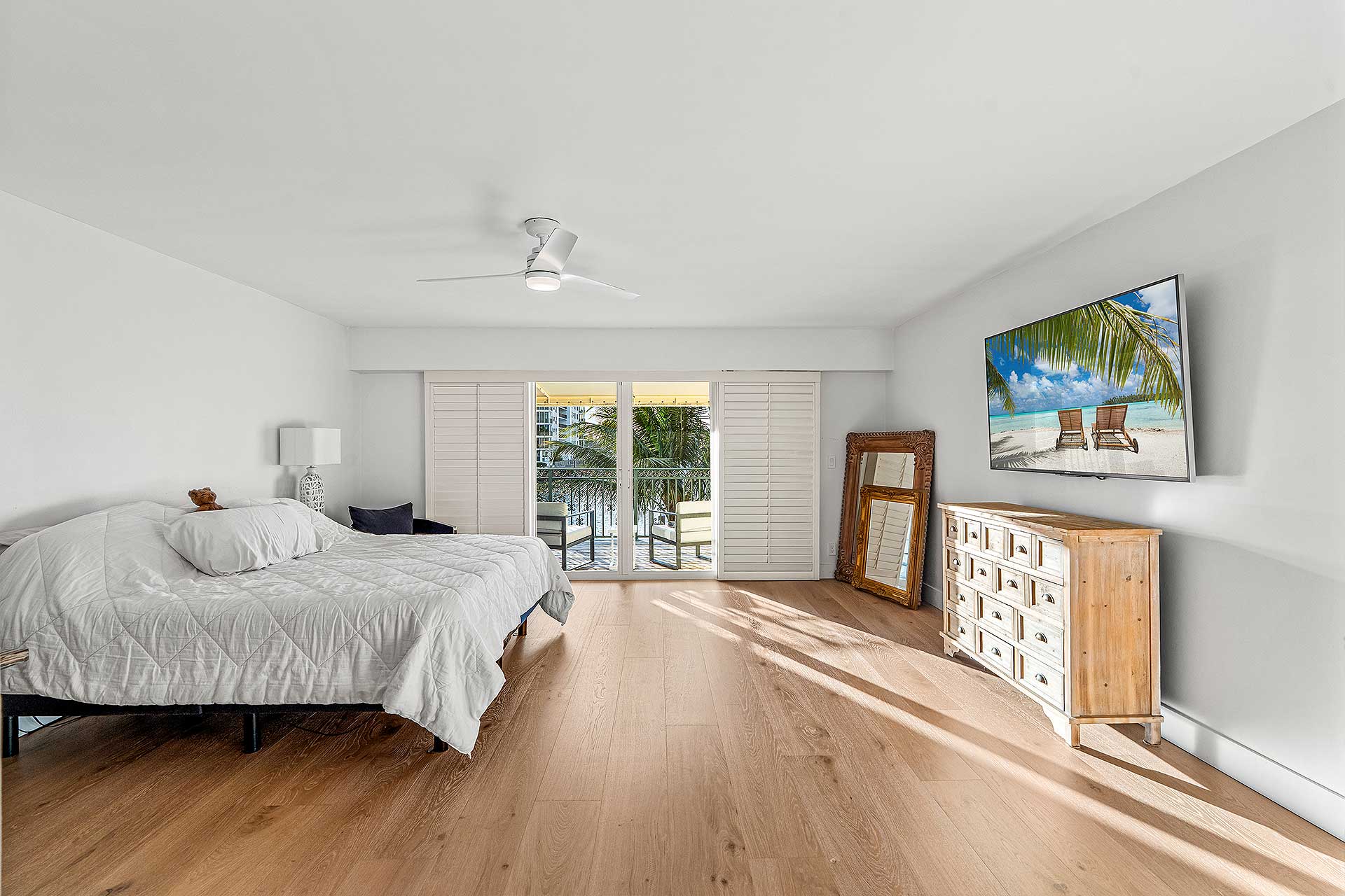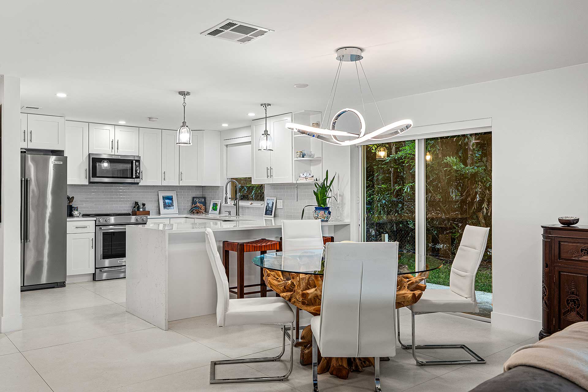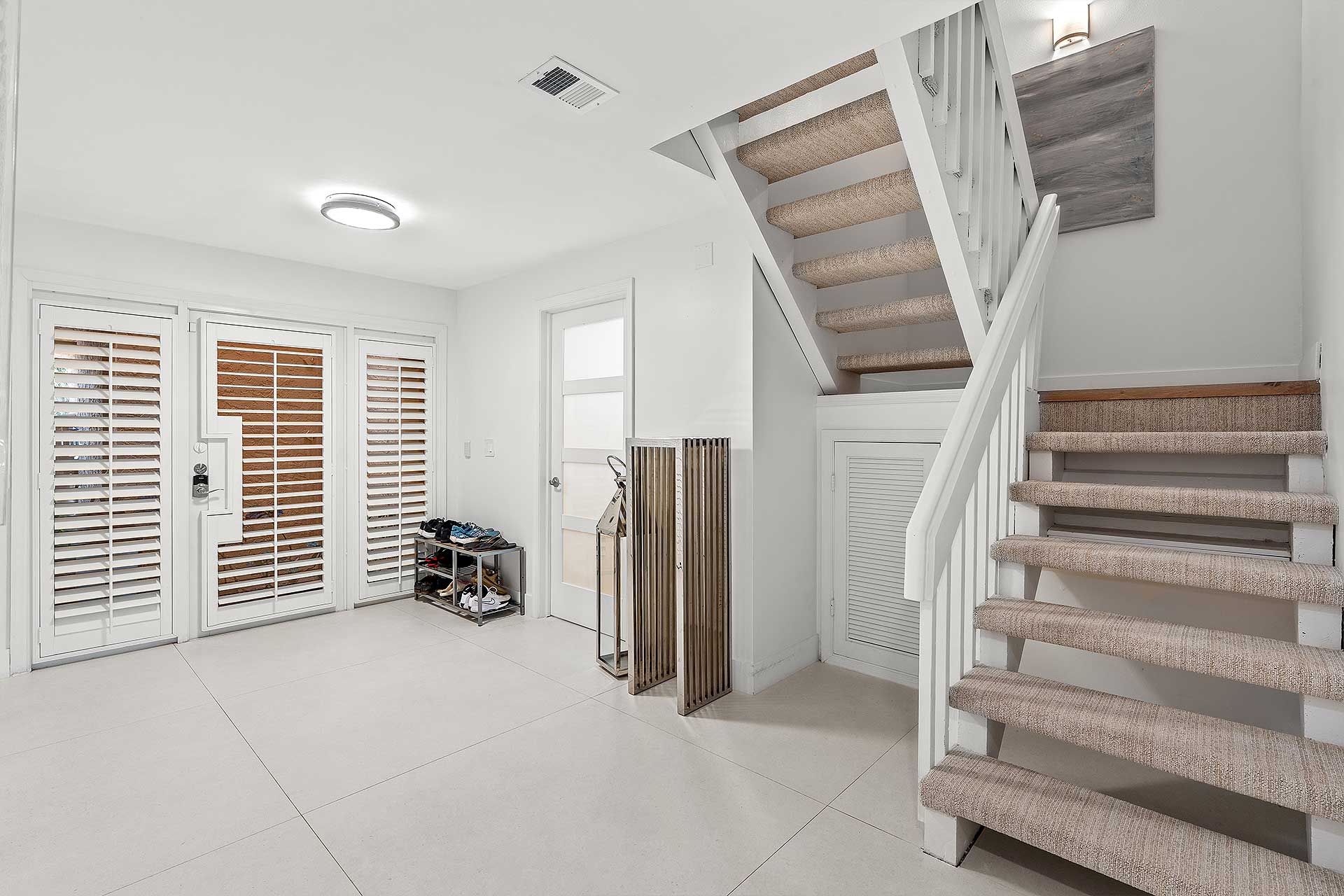 Perfect for indoor/outdoor living and boating, this completely renovated three-bedroom residence, with 2,048 total square feet, offers a prime no wake Intracoastal Waterway setting in the coveted Seagate neighborhood, close to the beach and Downtown Delray Beach’s vibrant Atlantic Avenue. With a light-filled ambience and oriented for water views, the living and dining area are designed in an open-concept plan, with one set of sliding doors opening to an awning-covered patio that flows out to the Intercoastal Waterway dock on, and a second set opening to a pocket garden. The adjacent kitchen is finished with custom cabinetry, quartz countertops, sea-glass tile backsplashes, a breakfast counter and high-end stainless-steel appliances. On the second floor, the primary suite includes a bedroom opening to a large awning-covered balcony overlooking Intracoastal sunset views, along with a custom-fitted walk-in closet and a bathroom with custom cabinetry, quartz countertops, dual sinks, a glass-enclosed shower and soaking tub. Of the two ensuite guest bedrooms, one accesses an east-facing balcony. Completing the floor plan are a half-bath, laundry and a one-car garage with an oversized driveway. Details throughout include wood and large-format tile flooring along with blinds and plantation shutter window coverings.