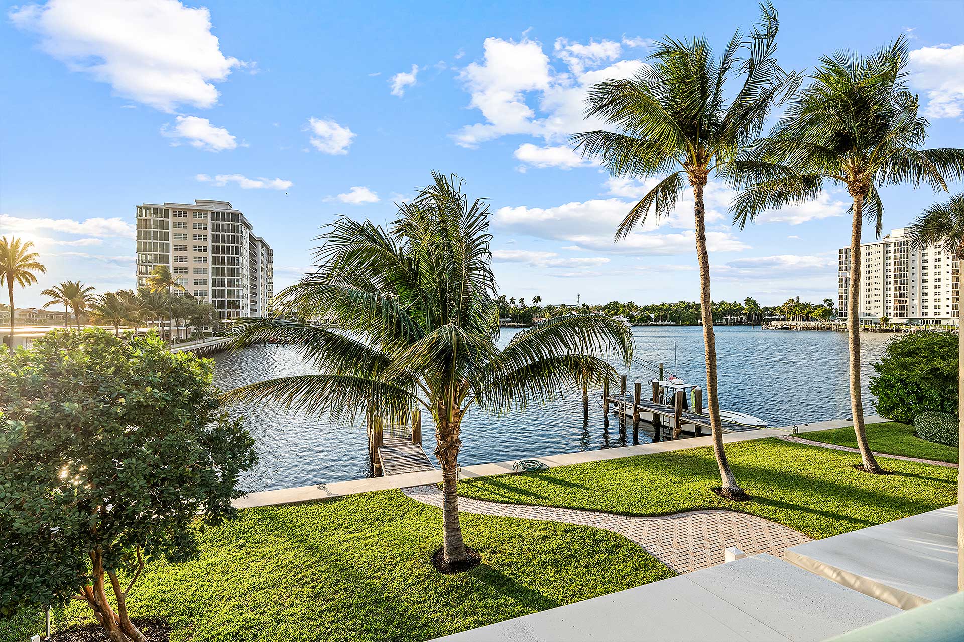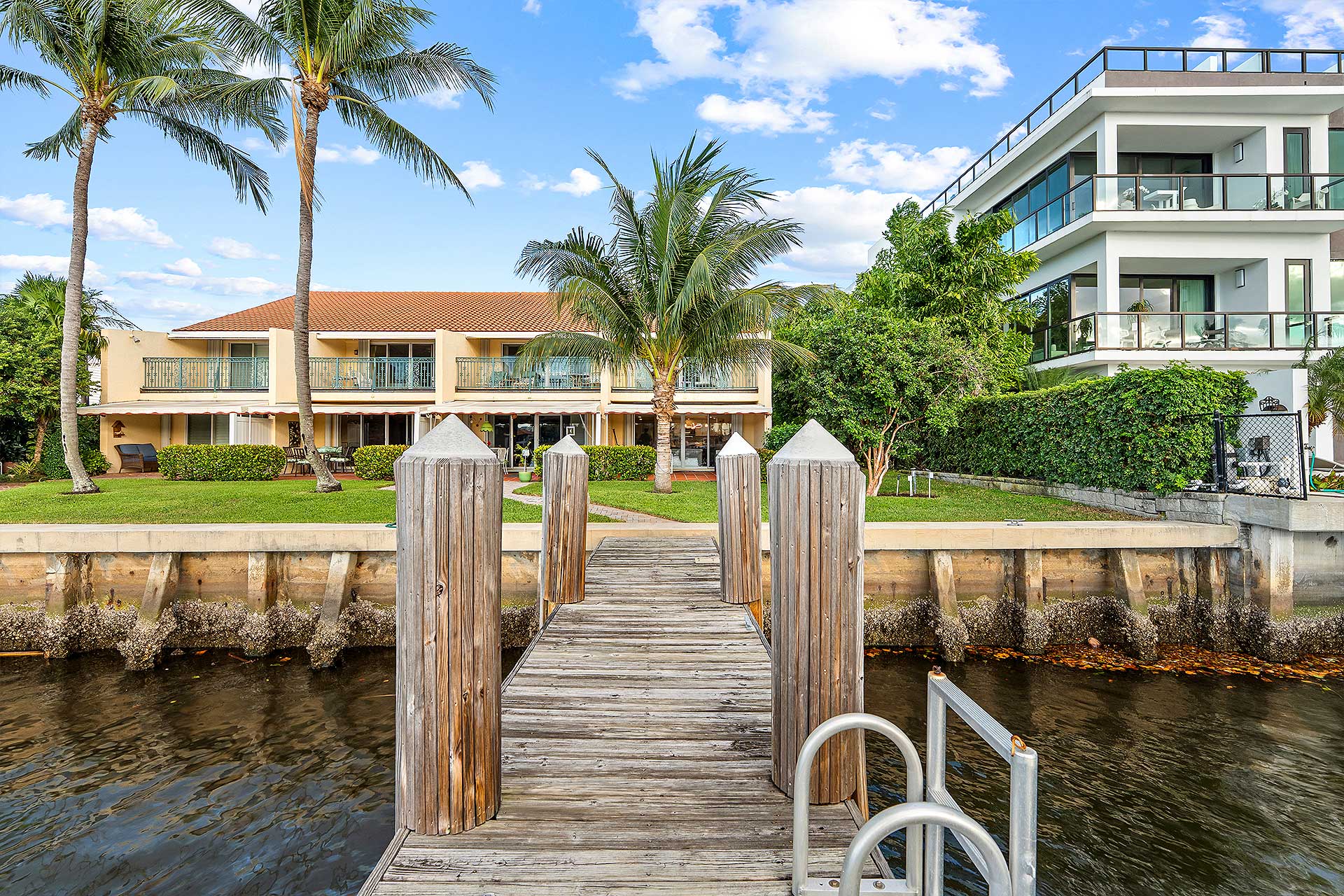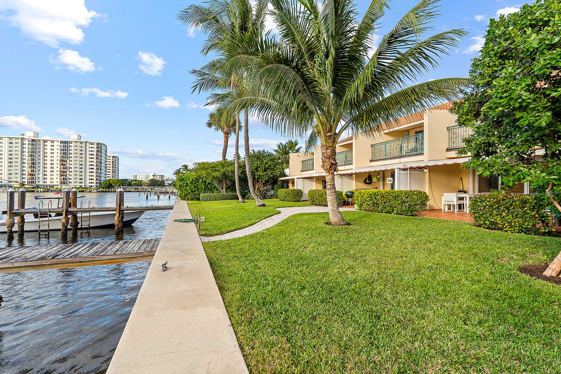 This Intracoastal townhome features a 30-foot dock extending from a rebuilt seawall. Currently, it can accommodate a vessel up to 40 feet, with the option of adding pilings to berth a larger yacht.