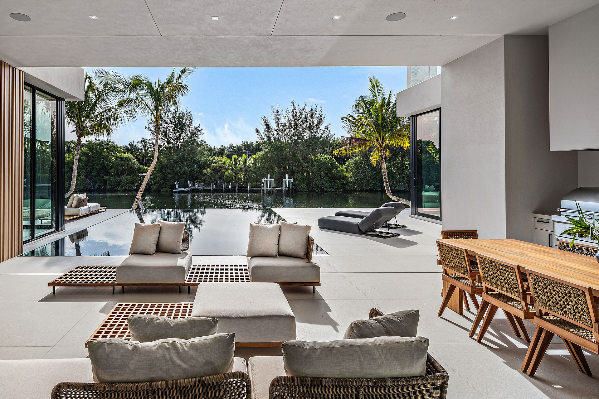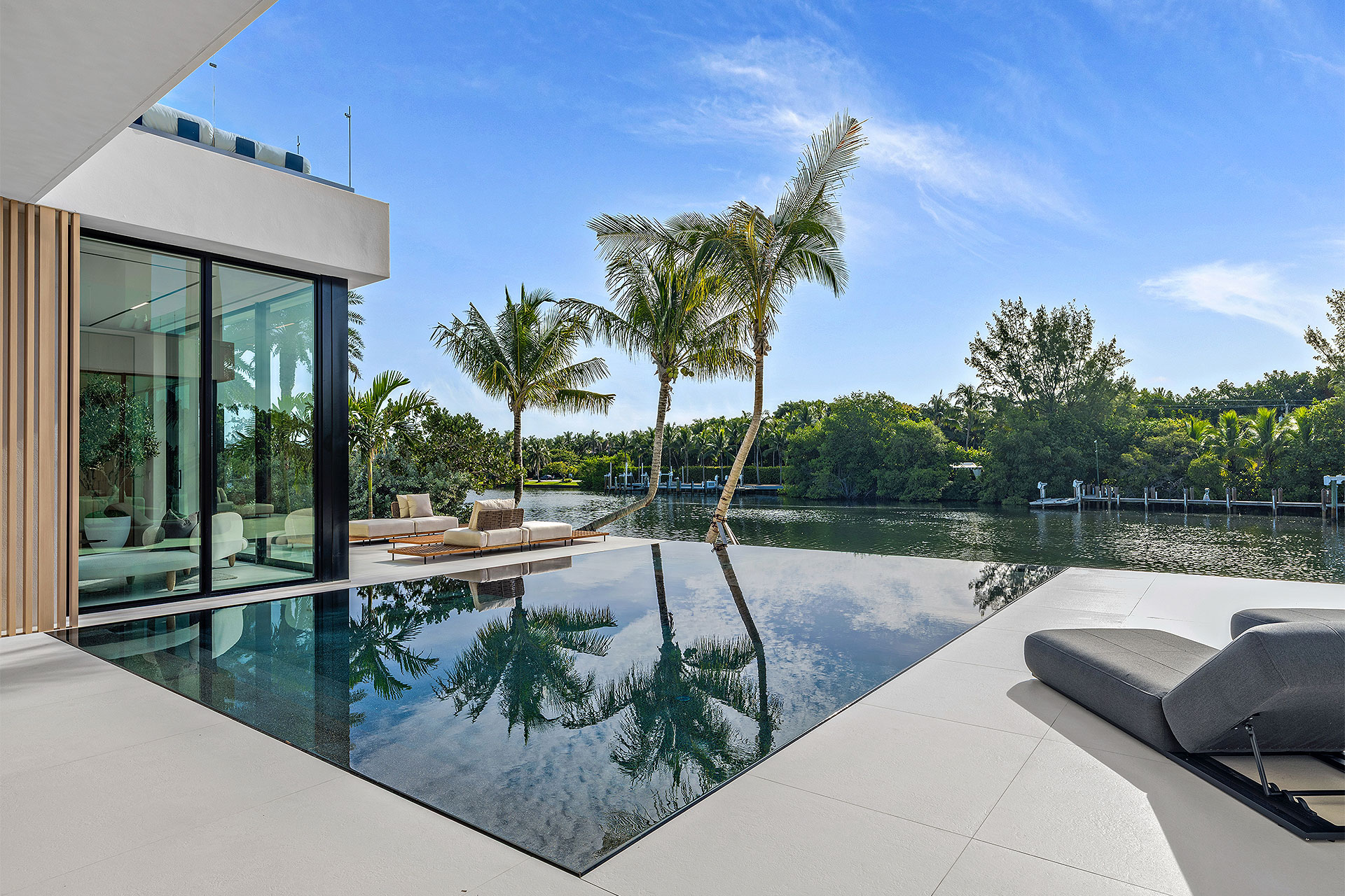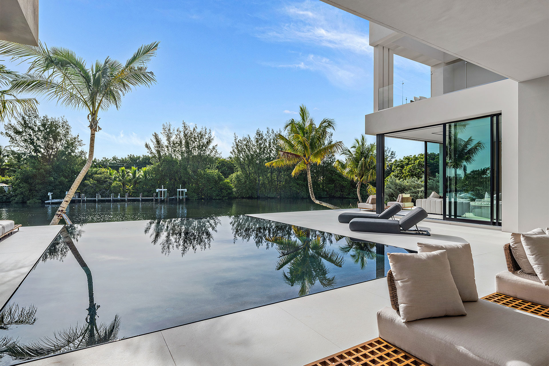 Completely private situated along a secluded basin of the Intracoastal Waterway with no visible neighbors, the sizeable loggia and summer kitchen overlook the sun-splashed, perimeter-overflow, infinity-edge pool with a spa and sunshelf. Bordering 111 feet of deepwater frontage and a new seawall cap, yacht enthusiasts will appreciate the full-service dock that can accommodate a vessel up to 60 feet, along with dedicated boat storage.