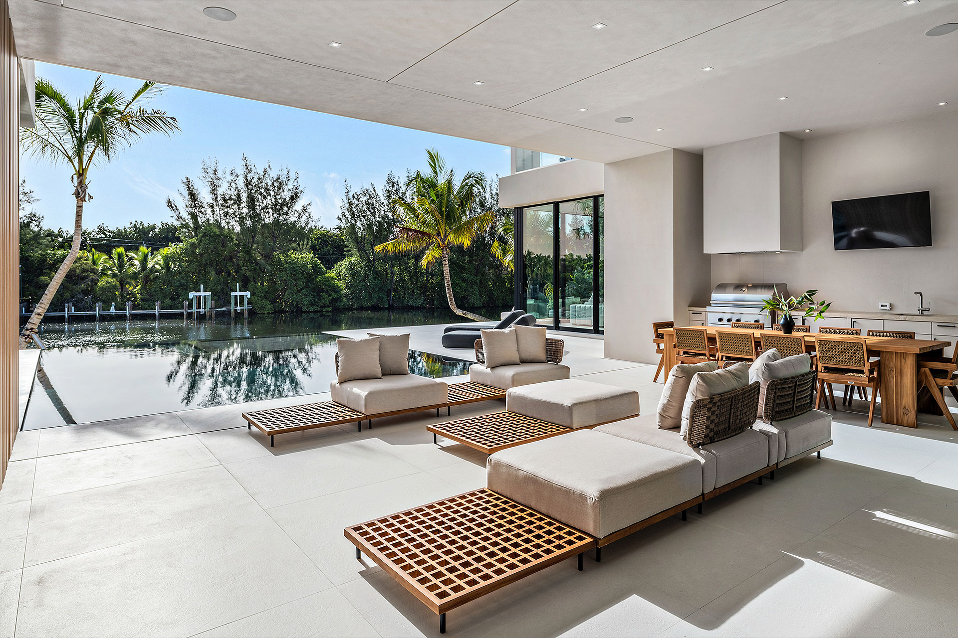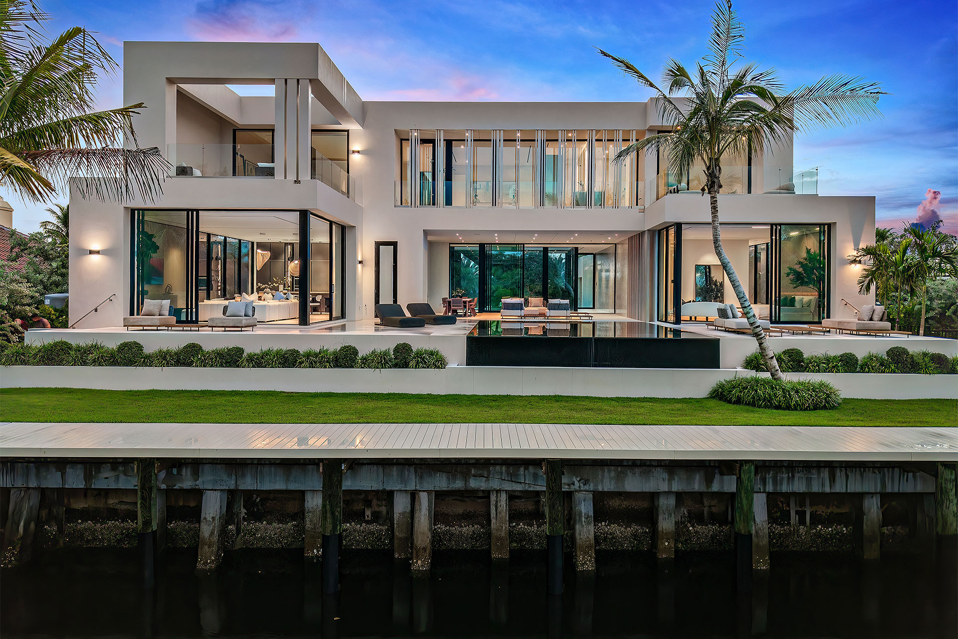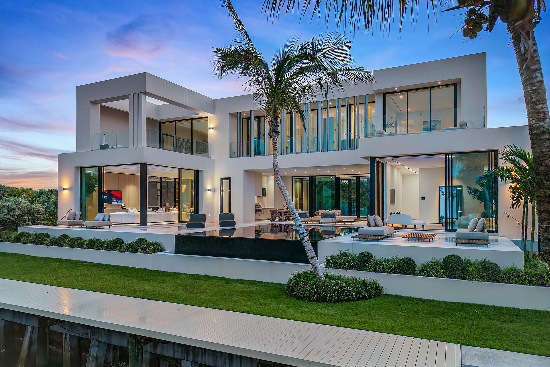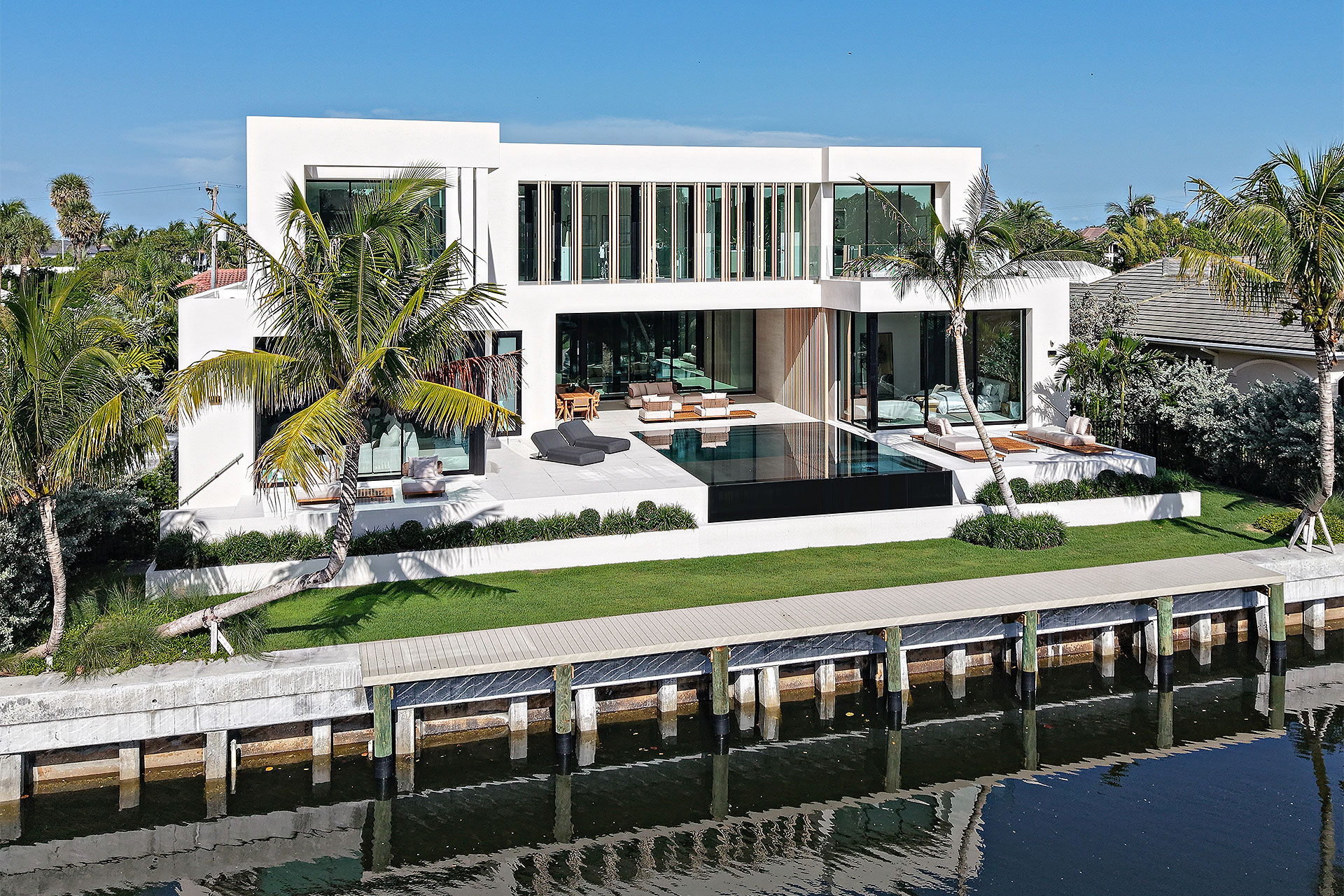 Completely private situated along a secluded basin of the Intracoastal Waterway with no visible neighbors, the sizeable loggia and summer kitchen overlook the sun-splashed, perimeter-overflow, infinity-edge pool with a spa and sunshelf. Bordering 111 feet of deepwater frontage and a new seawall cap, yacht enthusiasts will appreciate the full-service dock that can accommodate a vessel up to 60 feet, along with dedicated boat storage.