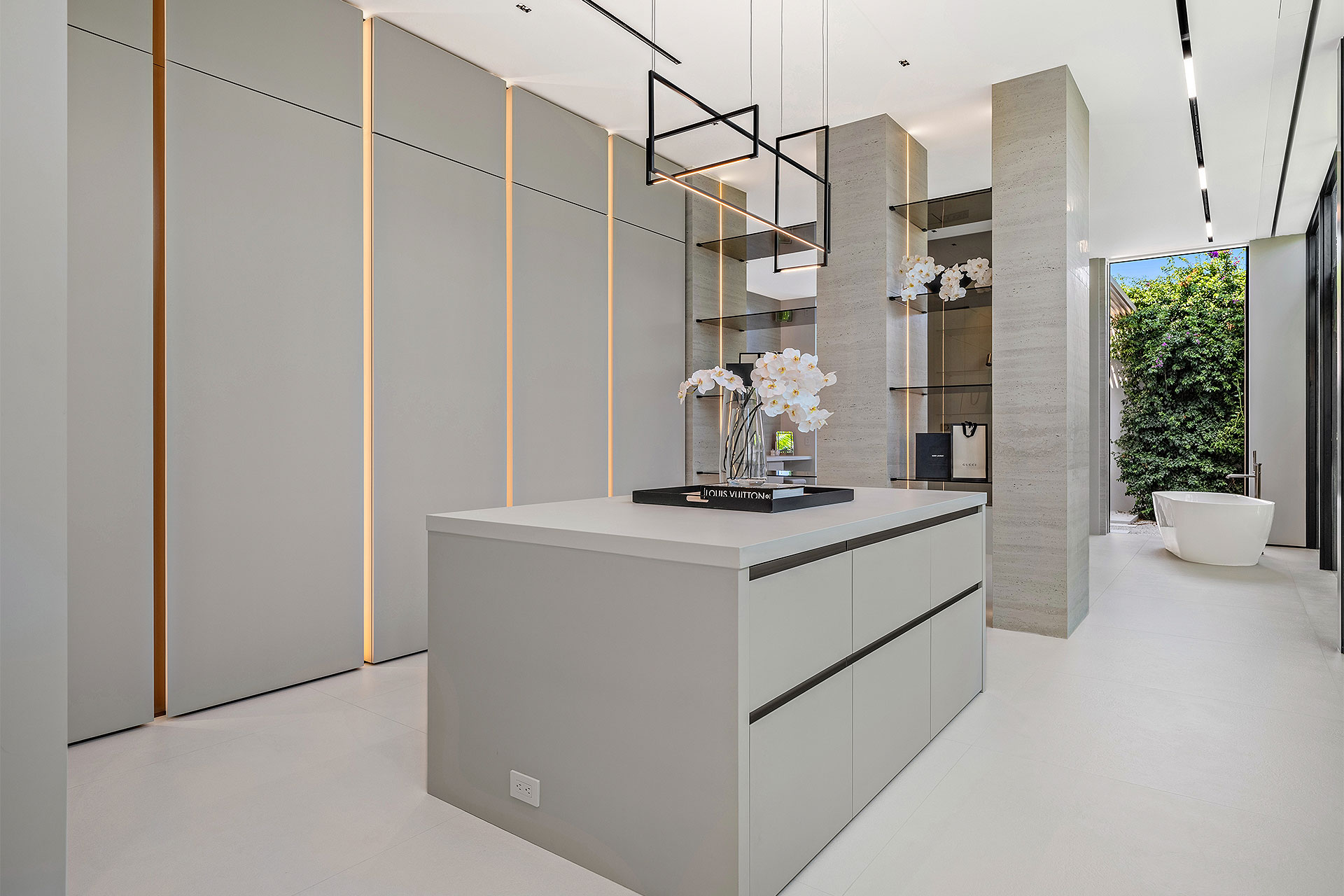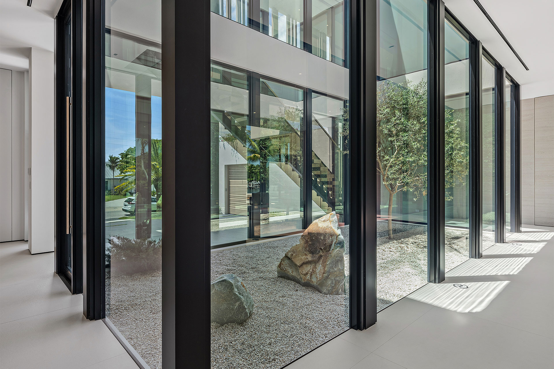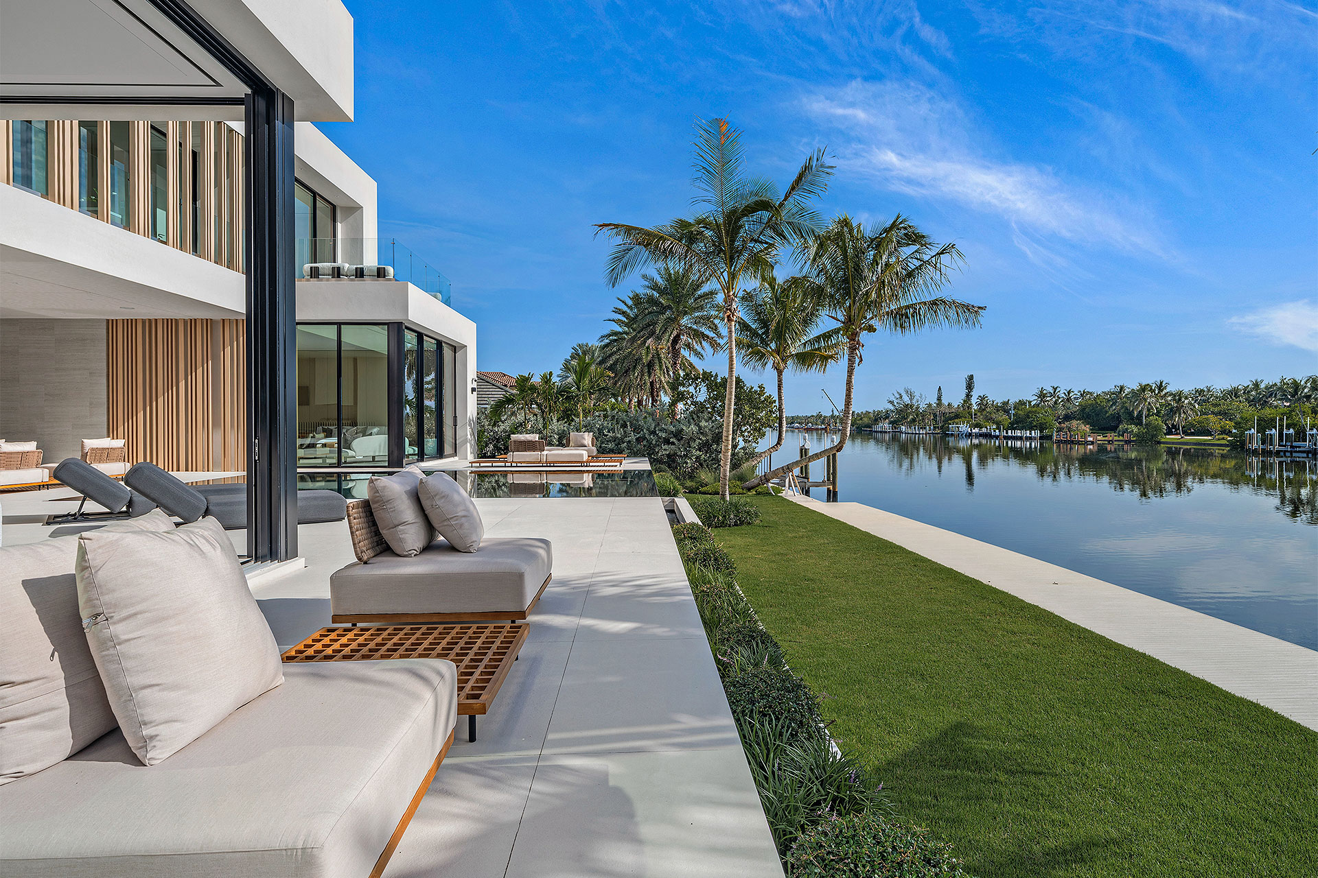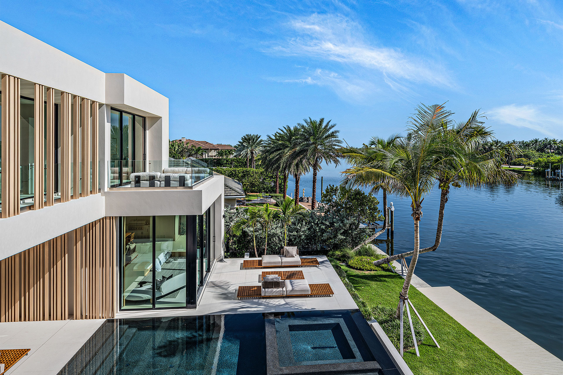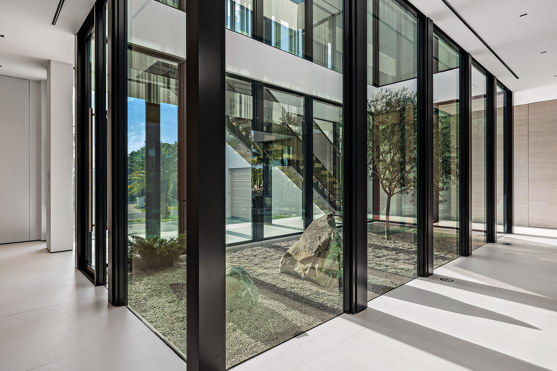 Pairing warm, contemporary styling with organic, ultra-luxurious finishes, this unique five-bedroom custom Estate, designed by B1 Architects, executed by Ocean Blue Custom Homes, and interior design by 610 Interiors, is imbued with layers of complexity that underlie its minimalistic design. Museum-like and super-clean, a simple geometry of rectilinear design elements, white-oak architectural-fins add visual interest to the façade while enhancing privacy. Within, custom reglets and trimless windows, lighting and air-conditioning vents augment the simplicity of the residence’s modern approach. Overall, ceilings are 11 feet-plus on the first floor, and 10± feet on the second floor, with the interiors clad in feature window-walls of glass that offer scenic water views. Central to the estate’s floorplan, and at its very heart, an olive tree and river rock are embraced within an open-air atrium. Amplifying this focal point, the atrium is bookended by a floating stairway with a bronze-framed glass balustrade and white-oak treads, along with a gallery that opens to a stunning loggia overlooking its beautiful natural surroundings as a core inspiration. In one wing, the great room invites entertaining, served by two kitchens. Fitted with a full complement of professional-grade appliances, both kitchens are finished with custom metallic cabinetry incorporating bronzed-glass doors. A special detail in the main kitchen is an InvisaCook invisible cooktop to maximize counter space on the oversized island, while a highlight in the catering kitchen is a floating wine column. In the opposite wing, the water-view bedroom of the primary suite is enriched with rift-cut, white-oak paneling and built-in millwork. The suite’s closet features an open concept with glass display shelving and closets, while the walk-through shower in the bathroom has sliding pocket doors on each side that lead to a private outdoor shower area and garden. On the second-floor are three luxurious guest bedrooms suites, along with a gym, a clubroom that opens to a spacious water-view balcony, and an office with a bronzed-glass wall. Completing the layout are an elevator, two laundry rooms, and two garages, with a total of three bays and high ceilings that can accommodate lifts, allowing covered parking for six cars.