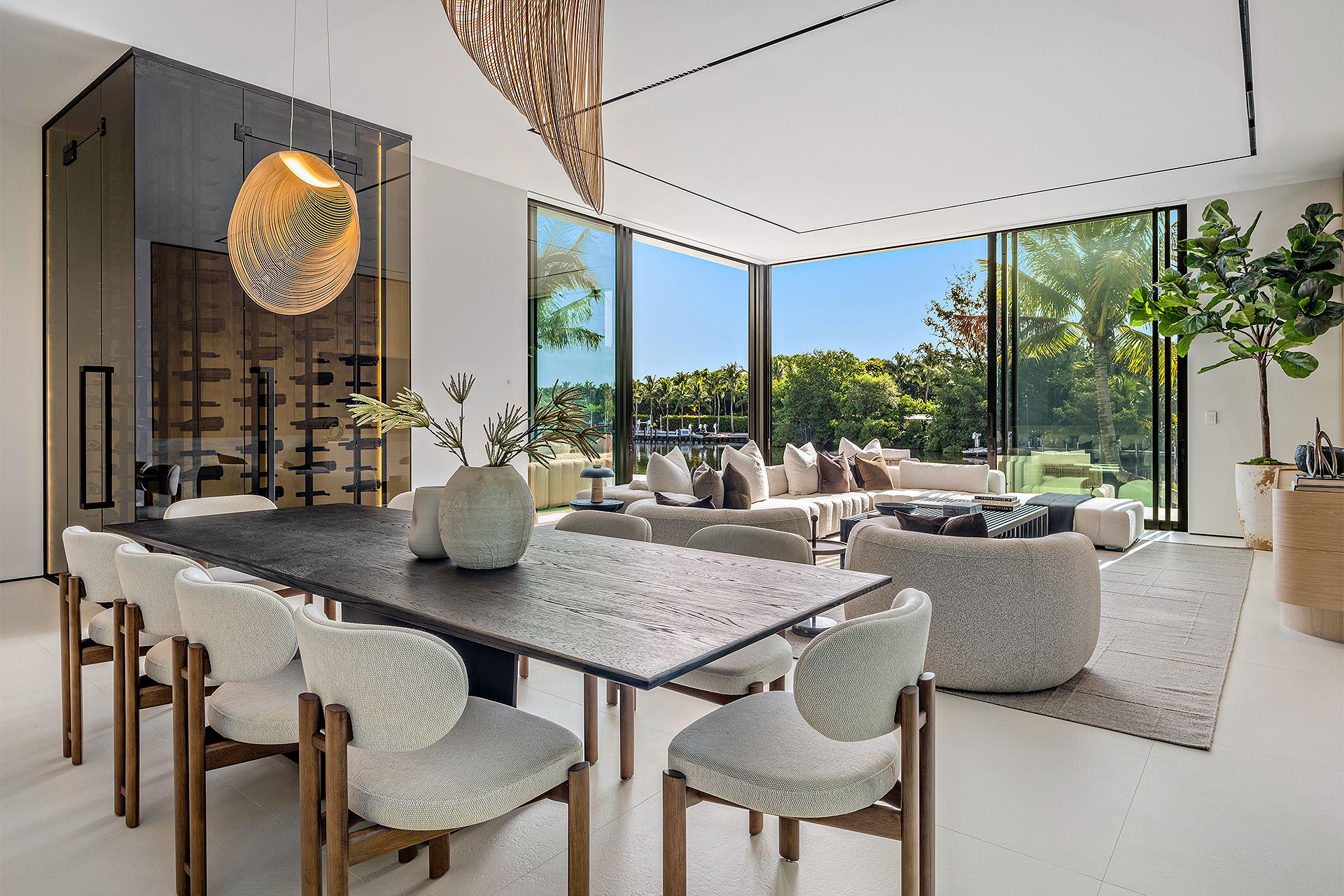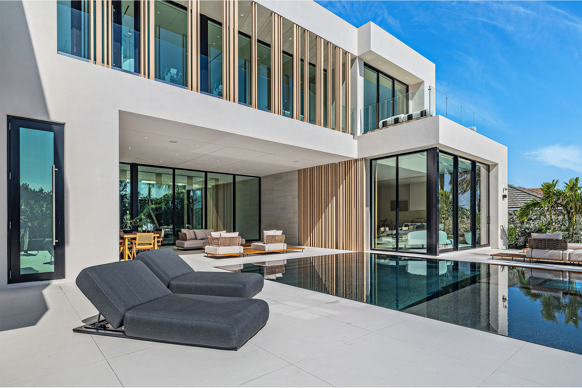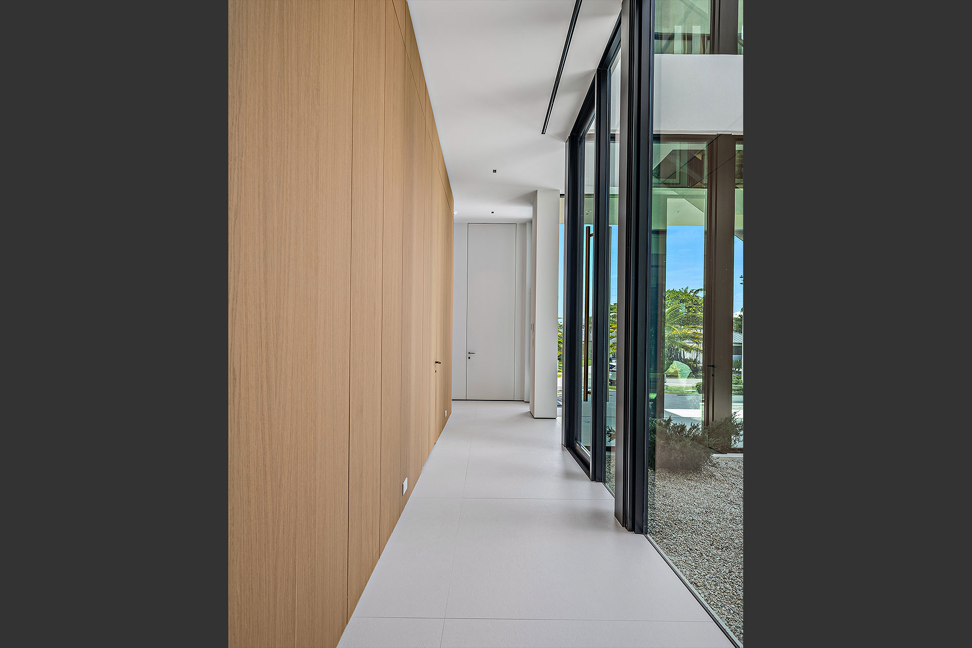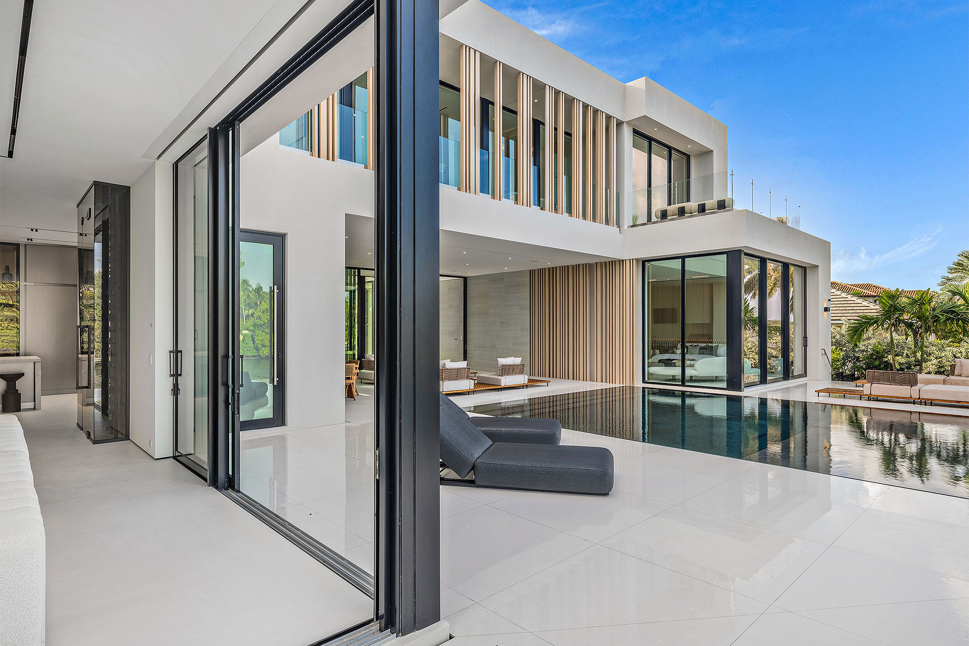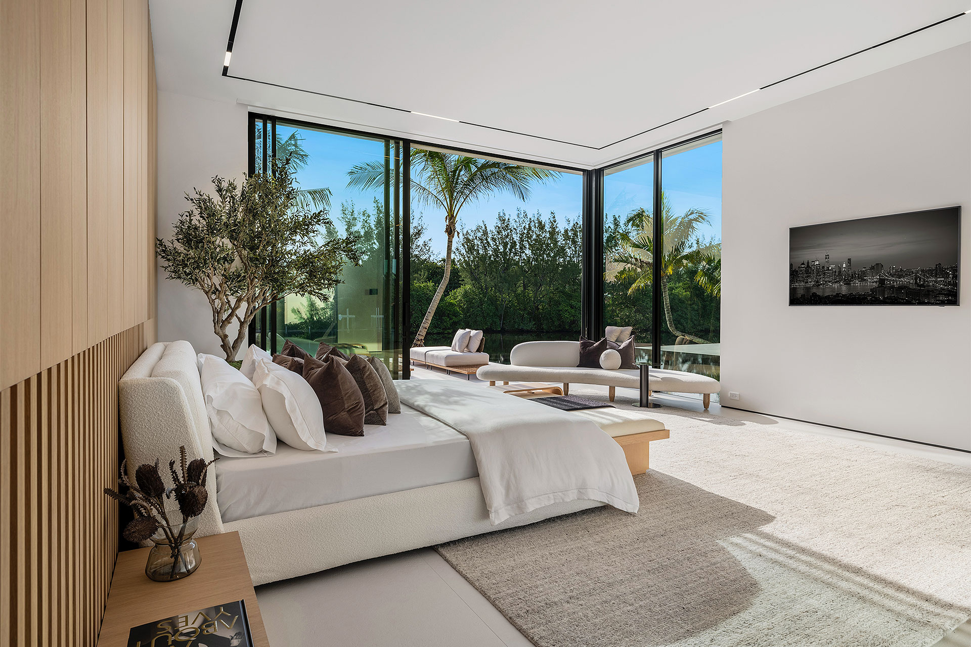 Pairing warm, contemporary styling with organic, ultra-luxurious finishes, this unique five-bedroom custom Estate, designed by B1 Architects, executed by Ocean Blue Custom Homes, and interior design by 610 Interiors, is imbued with layers of complexity that underlie its minimalistic design. Museum-like and super-clean, a simple geometry of rectilinear design elements, white-oak architectural-fins add visual interest to the façade while enhancing privacy. Within, custom reglets and trimless windows, lighting and air-conditioning vents augment the simplicity of the residence’s modern approach. Overall, ceilings are 11 feet-plus on the first floor, and 10± feet on the second floor, with the interiors clad in feature window-walls of glass that offer scenic water views. Central to the estate’s floorplan, and at its very heart, an olive tree and river rock are embraced within an open-air atrium. Amplifying this focal point, the atrium is bookended by a floating stairway with a bronze-framed glass balustrade and white-oak treads, along with a gallery that opens to a stunning loggia overlooking its beautiful natural surroundings as a core inspiration. In one wing, the great room invites entertaining, served by two kitchens. Fitted with a full complement of professional-grade appliances, both kitchens are finished with custom metallic cabinetry incorporating bronzed-glass doors. A special detail in the main kitchen is an InvisaCook invisible cooktop to maximize counter space on the oversized island, while a highlight in the catering kitchen is a floating wine column. In the opposite wing, the water-view bedroom of the primary suite is enriched with rift-cut, white-oak paneling and built-in millwork. The suite’s closet features an open concept with glass display shelving and closets, while the walk-through shower in the bathroom has sliding pocket doors on each side that lead to a private outdoor shower area and garden. On the second-floor are three luxurious guest bedrooms suites, along with a gym, a clubroom that opens to a spacious water-view balcony, and an office with a bronzed-glass wall. Completing the layout are an elevator, two laundry rooms, and two garages, with a total of three bays and high ceilings that can accommodate lifts, allowing covered parking for six cars.