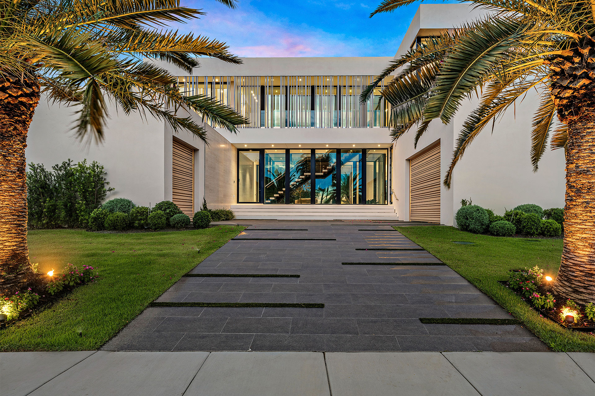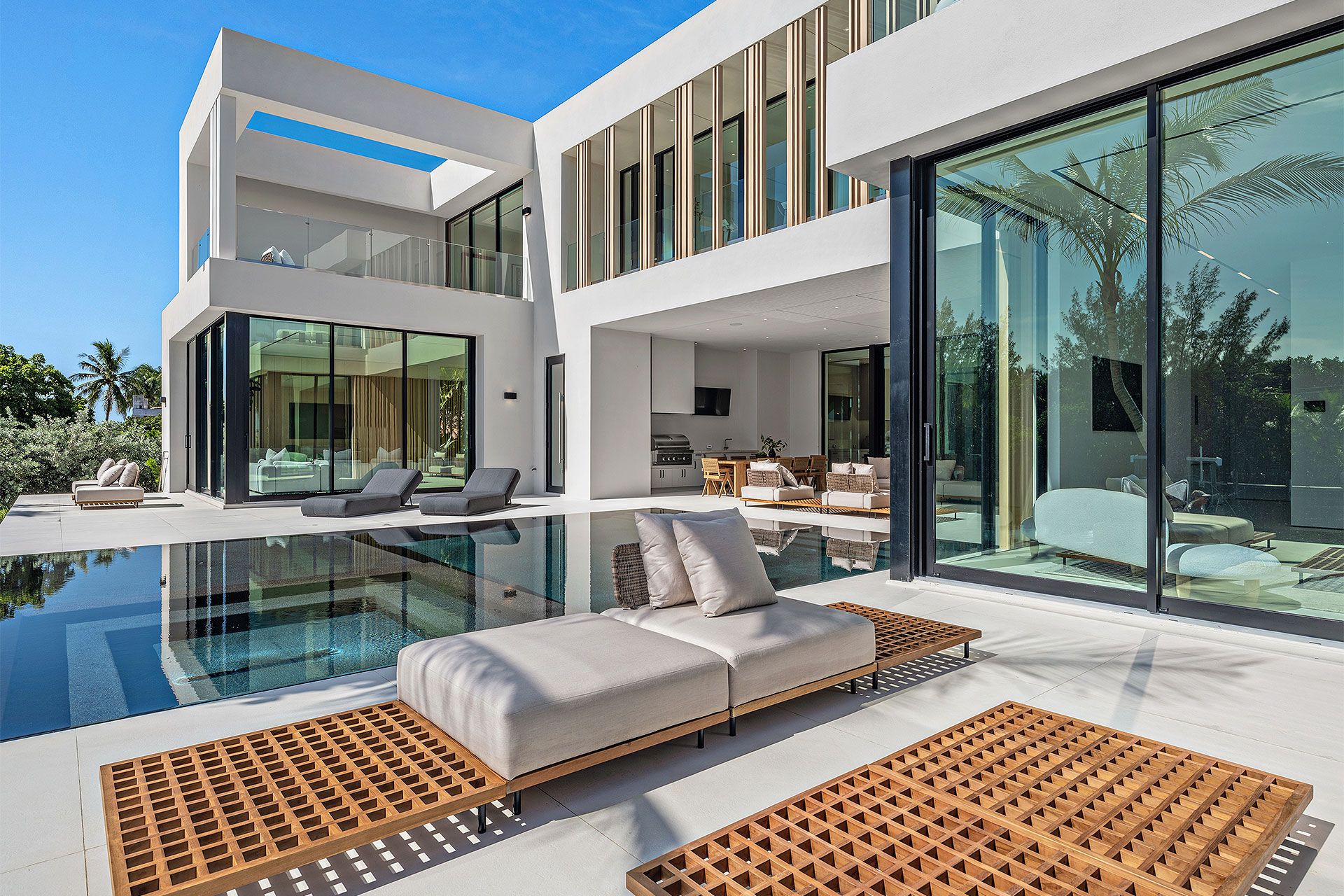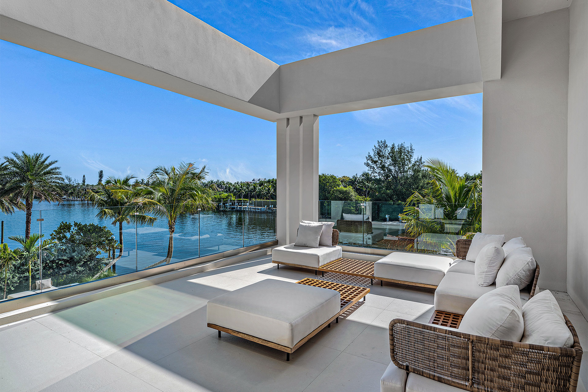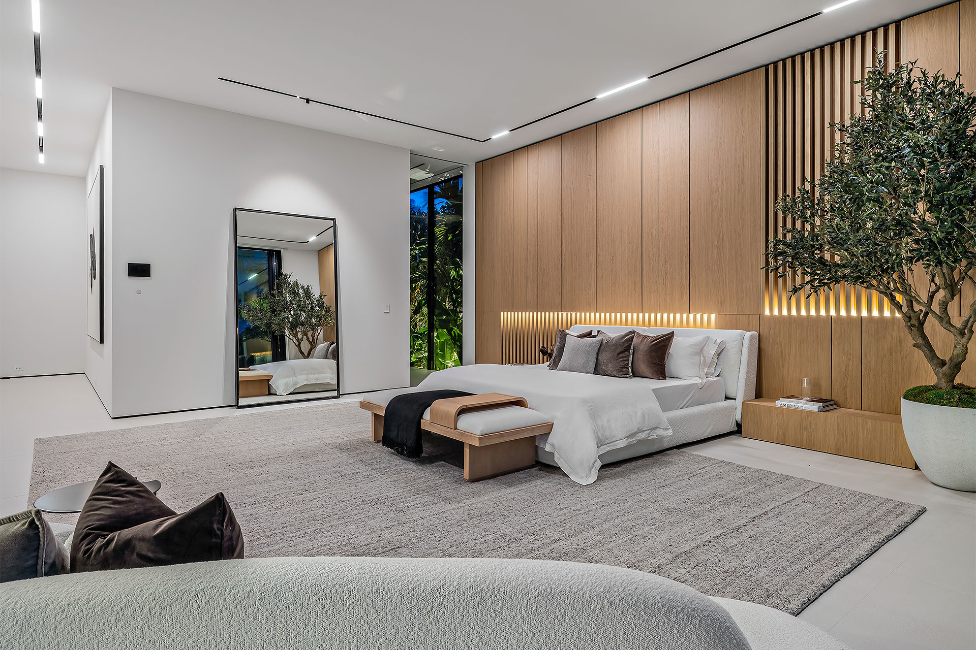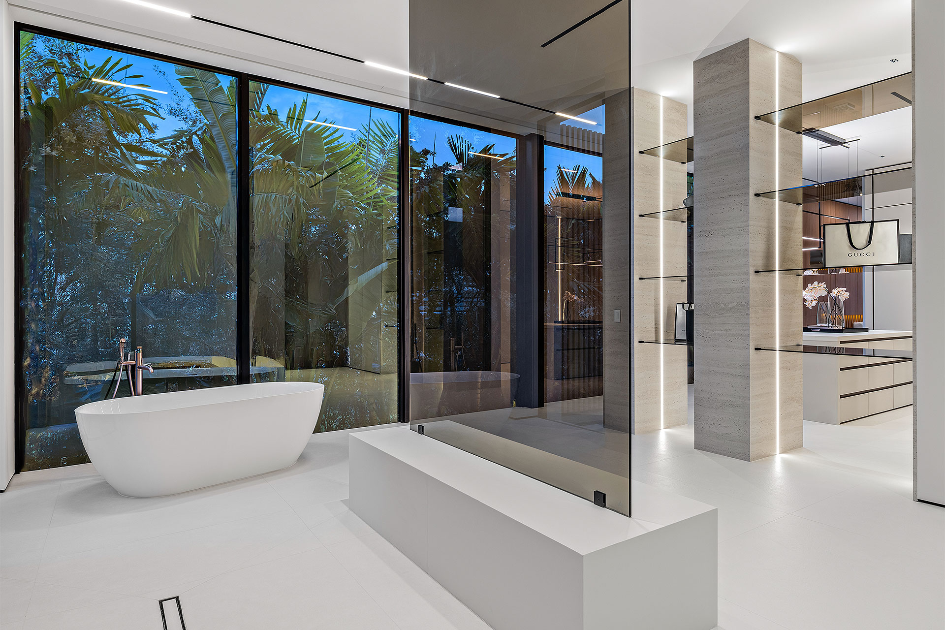 Pairing warm, contemporary styling with organic, ultra-luxurious finishes, this unique five-bedroom custom Estate, designed by B1 Architects, executed by Ocean Blue Custom Homes, and interior design by 610 Interiors, is imbued with layers of complexity that underlie its minimalistic design. Museum-like and super-clean, a simple geometry of rectilinear design elements, white-oak architectural-fins add visual interest to the façade while enhancing privacy. Within, custom reglets and trimless windows, lighting and air-conditioning vents augment the simplicity of the residence’s modern approach. Overall, ceilings are 11 feet-plus on the first floor, and 10± feet on the second floor, with the interiors clad in feature window-walls of glass that offer scenic water views. Central to the estate’s floorplan, and at its very heart, an olive tree and river rock are embraced within an open-air atrium. Amplifying this focal point, the atrium is bookended by a floating stairway with a bronze-framed glass balustrade and white-oak treads, along with a gallery that opens to a stunning loggia overlooking its beautiful natural surroundings as a core inspiration. In one wing, the great room invites entertaining, served by two kitchens. Fitted with a full complement of professional-grade appliances, both kitchens are finished with custom metallic cabinetry incorporating bronzed-glass doors. A special detail in the main kitchen is an InvisaCook invisible cooktop to maximize counter space on the oversized island, while a highlight in the catering kitchen is a floating wine column. In the opposite wing, the water-view bedroom of the primary suite is enriched with rift-cut, white-oak paneling and built-in millwork. The suite’s closet features an open concept with glass display shelving and closets, while the walk-through shower in the bathroom has sliding pocket doors on each side that lead to a private outdoor shower area and garden. On the second-floor are three luxurious guest bedrooms suites, along with a gym, a clubroom that opens to a spacious water-view balcony, and an office with a bronzed-glass wall. Completing the layout are an elevator, two laundry rooms, and two garages, with a total of three bays and high ceilings that can accommodate lifts, allowing covered parking for six cars.