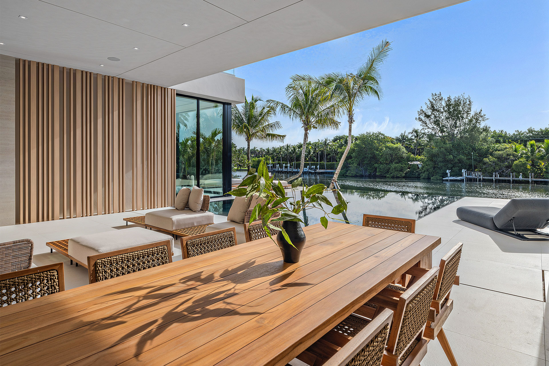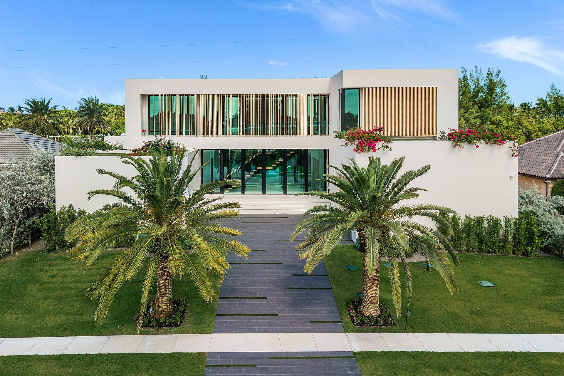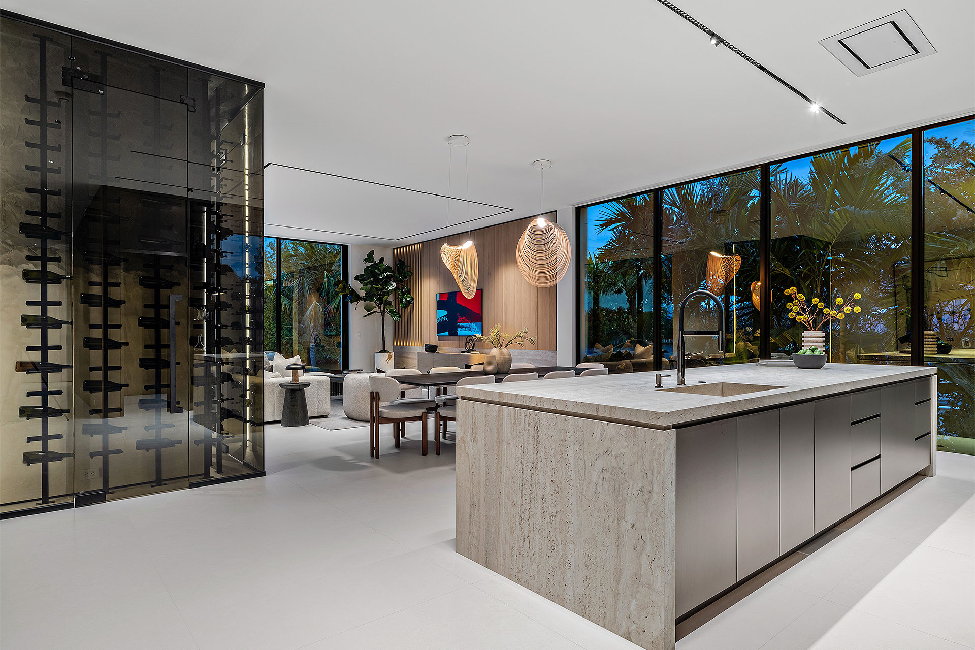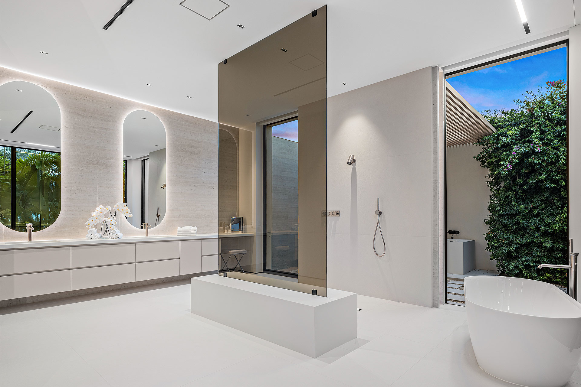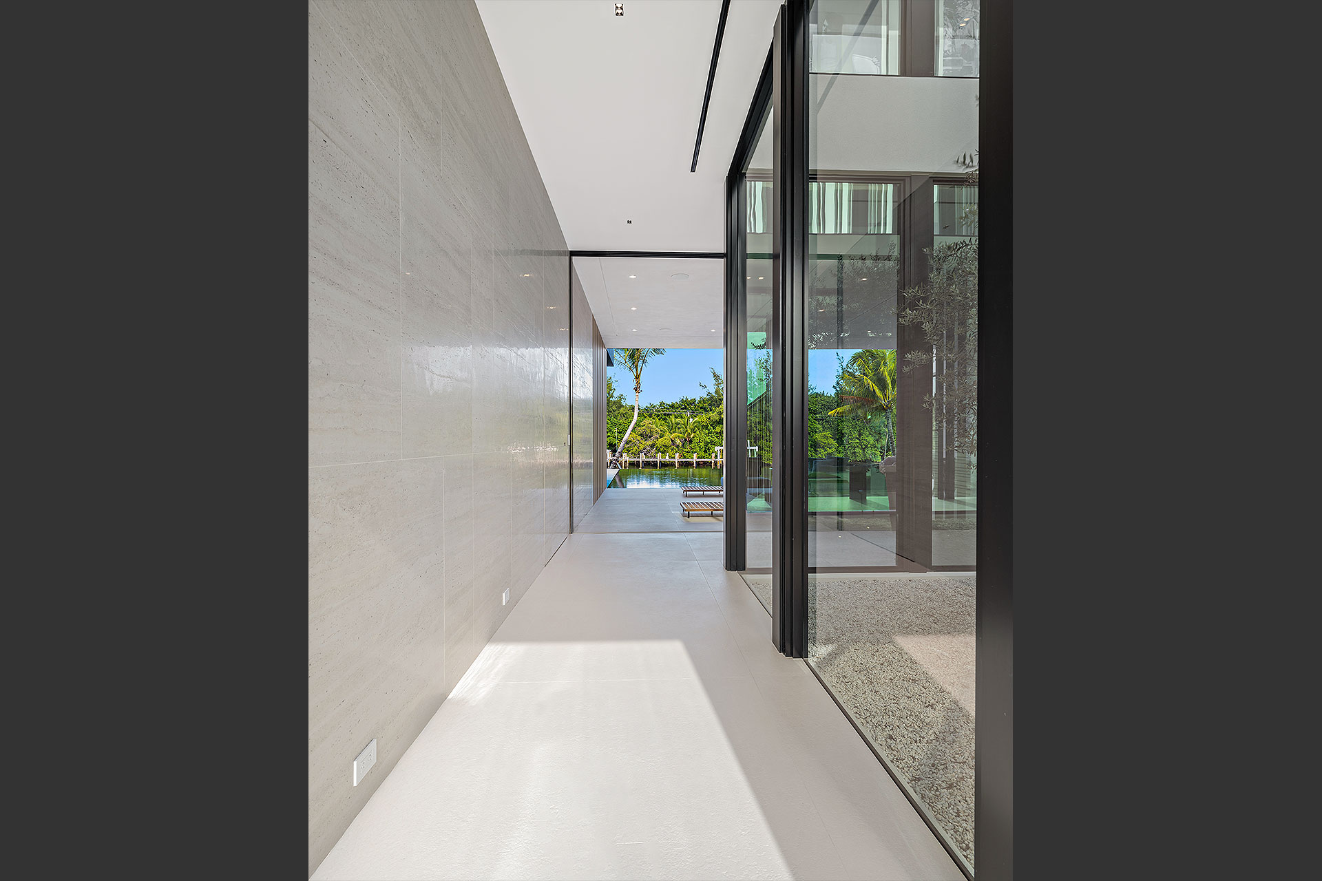 Pairing warm, contemporary styling with organic, ultra-luxurious finishes, this unique five-bedroom custom Estate, designed by B1 Architects, executed by Ocean Blue Custom Homes, and interior design by 610 Interiors, is imbued with layers of complexity that underlie its minimalistic design. Museum-like and super-clean, a simple geometry of rectilinear design elements, white-oak architectural-fins add visual interest to the façade while enhancing privacy. Within, custom reglets and trimless windows, lighting and air-conditioning vents augment the simplicity of the residence’s modern approach. Overall, ceilings are 11 feet-plus on the first floor, and 10± feet on the second floor, with the interiors clad in feature window-walls of glass that offer scenic water views. Central to the estate’s floorplan, and at its very heart, an olive tree and river rock are embraced within an open-air atrium. Amplifying this focal point, the atrium is bookended by a floating stairway with a bronze-framed glass balustrade and white-oak treads, along with a gallery that opens to a stunning loggia overlooking its beautiful natural surroundings as a core inspiration. In one wing, the great room invites entertaining, served by two kitchens. Fitted with a full complement of professional-grade appliances, both kitchens are finished with custom metallic cabinetry incorporating bronzed-glass doors. A special detail in the main kitchen is an InvisaCook invisible cooktop to maximize counter space on the oversized island, while a highlight in the catering kitchen is a floating wine column. In the opposite wing, the water-view bedroom of the primary suite is enriched with rift-cut, white-oak paneling and built-in millwork. The suite’s closet features an open concept with glass display shelving and closets, while the walk-through shower in the bathroom has sliding pocket doors on each side that lead to a private outdoor shower area and garden. On the second-floor are three luxurious guest bedrooms suites, along with a gym, a clubroom that opens to a spacious water-view balcony, and an office with a bronzed-glass wall. Completing the layout are an elevator, two laundry rooms, and two garages, with a total of three bays and high ceilings that can accommodate lifts, allowing covered parking for six cars.
