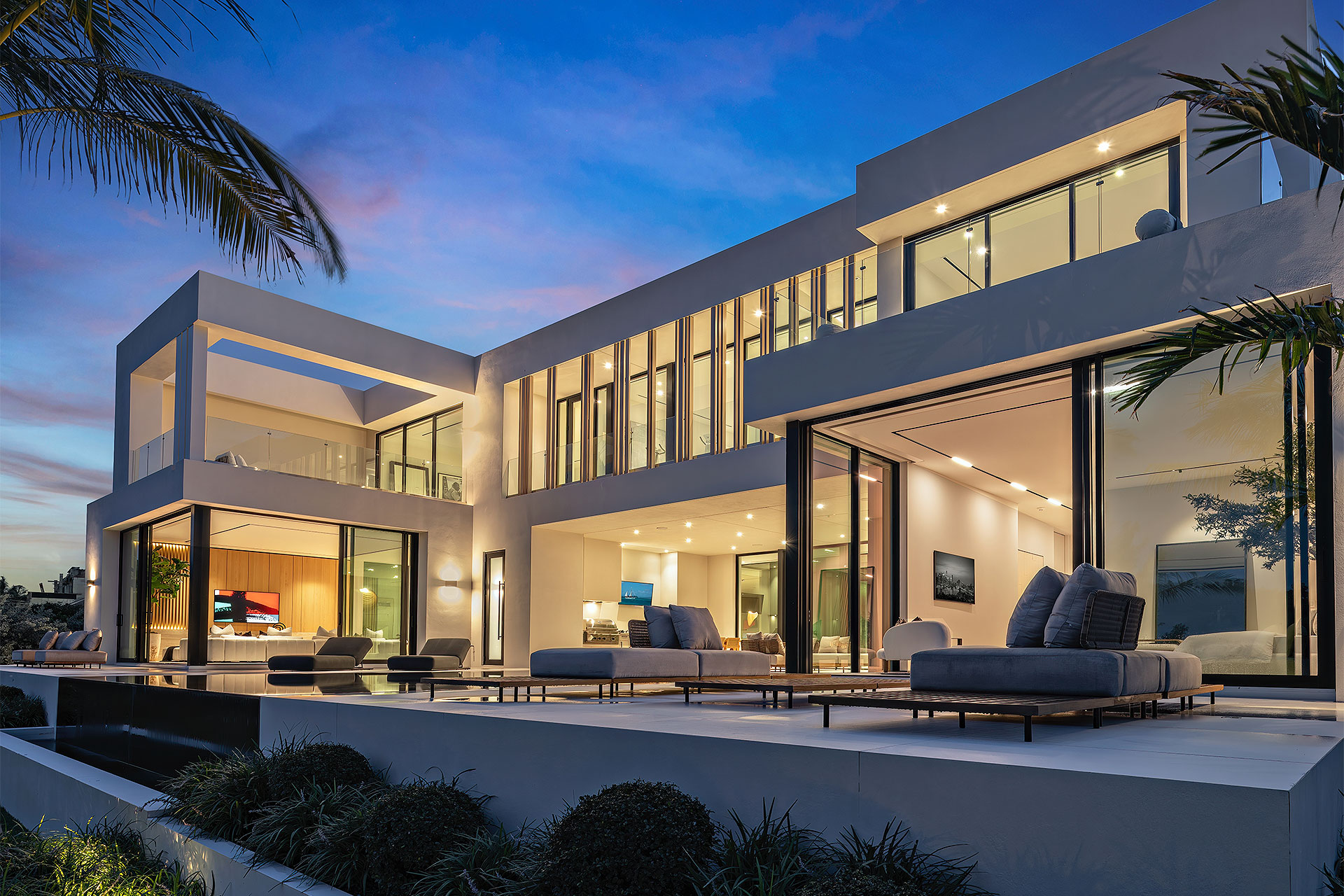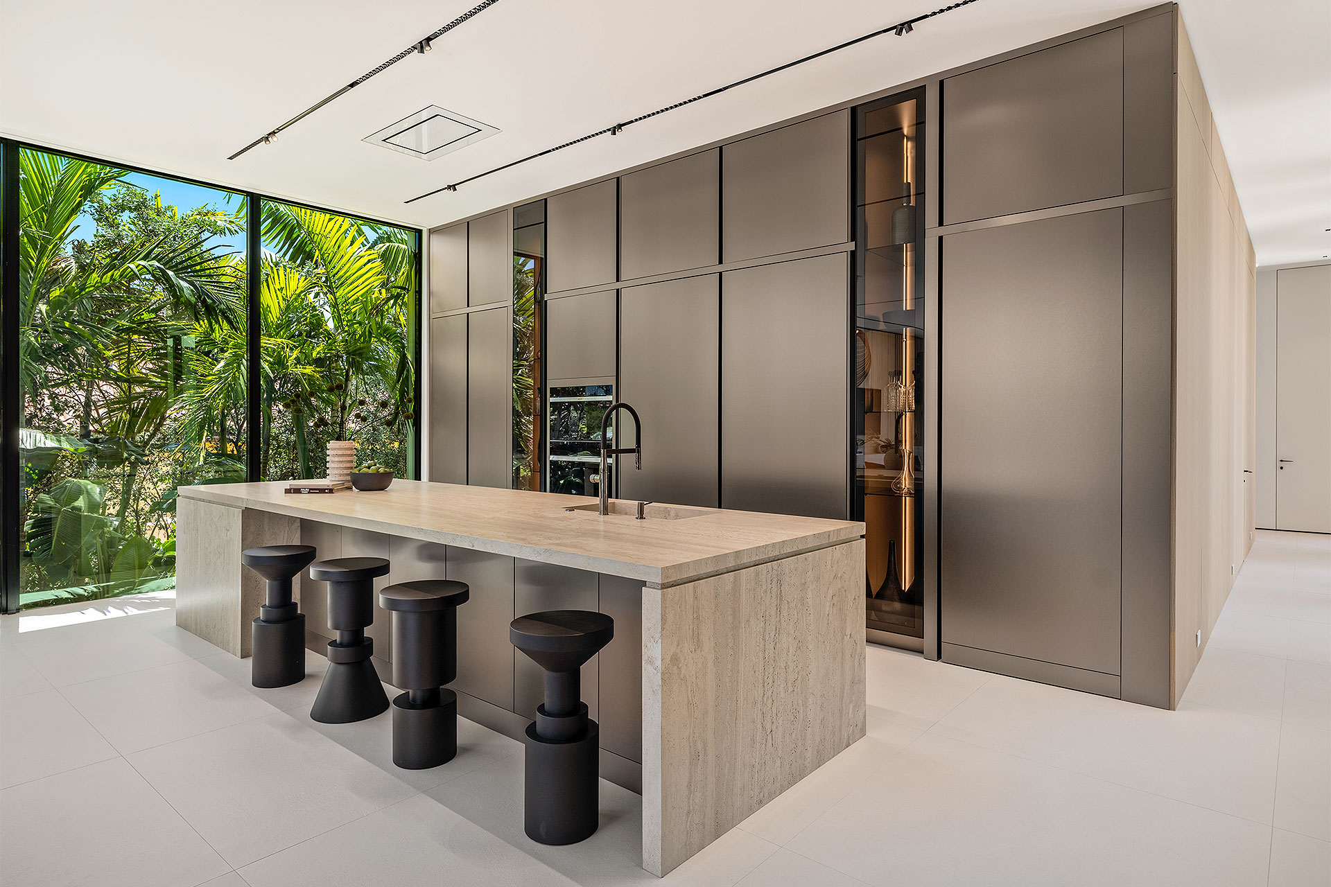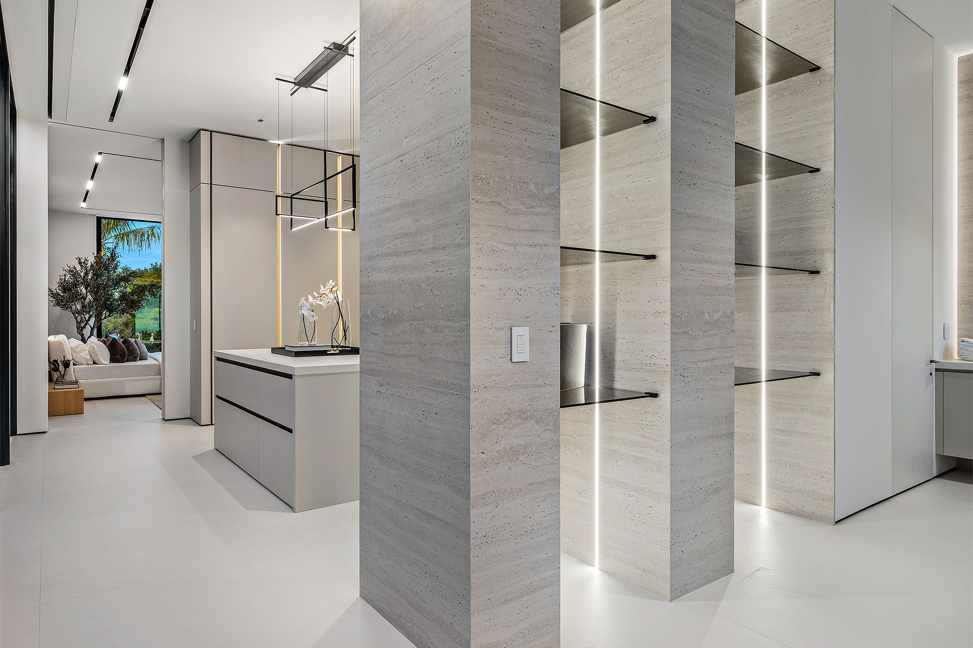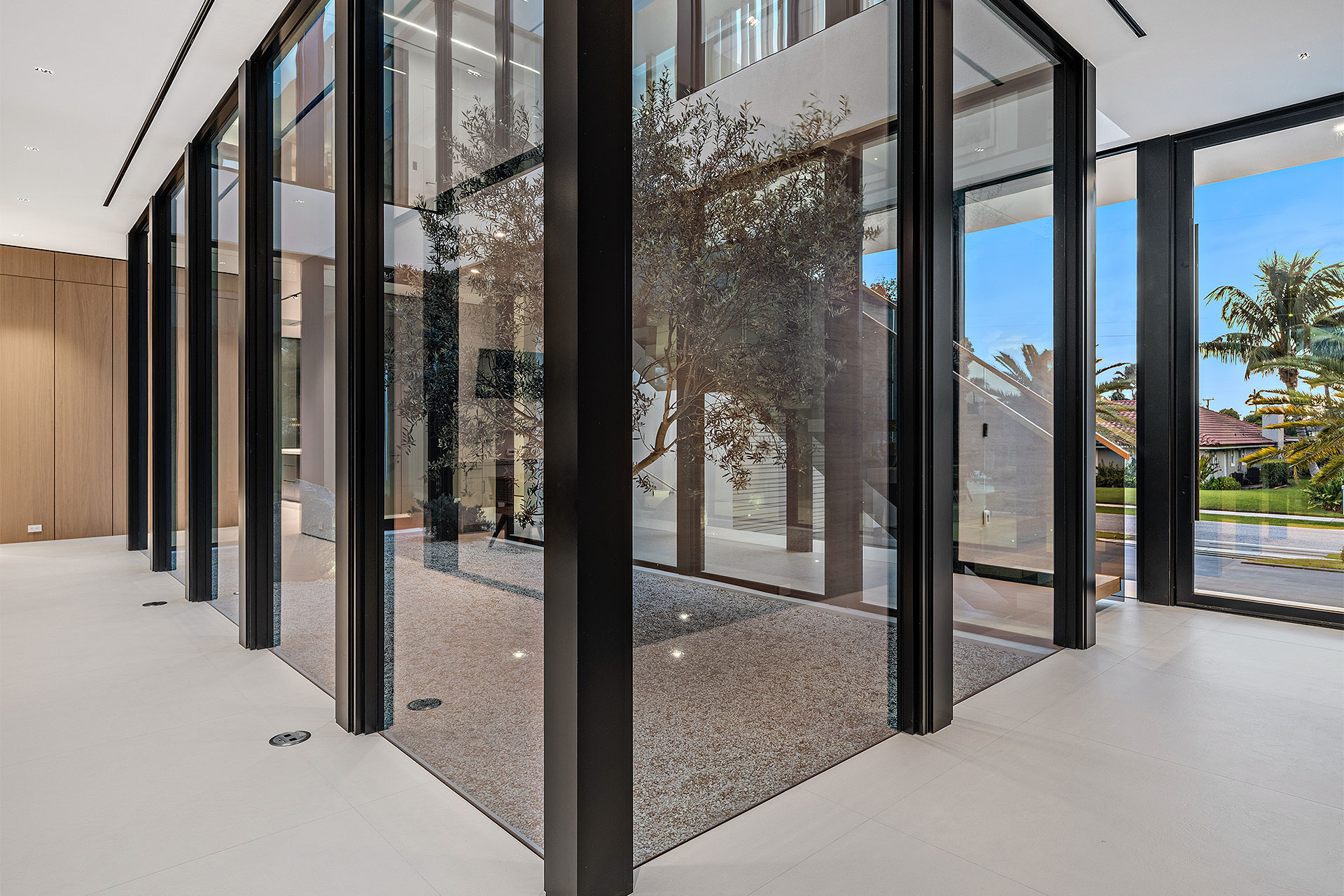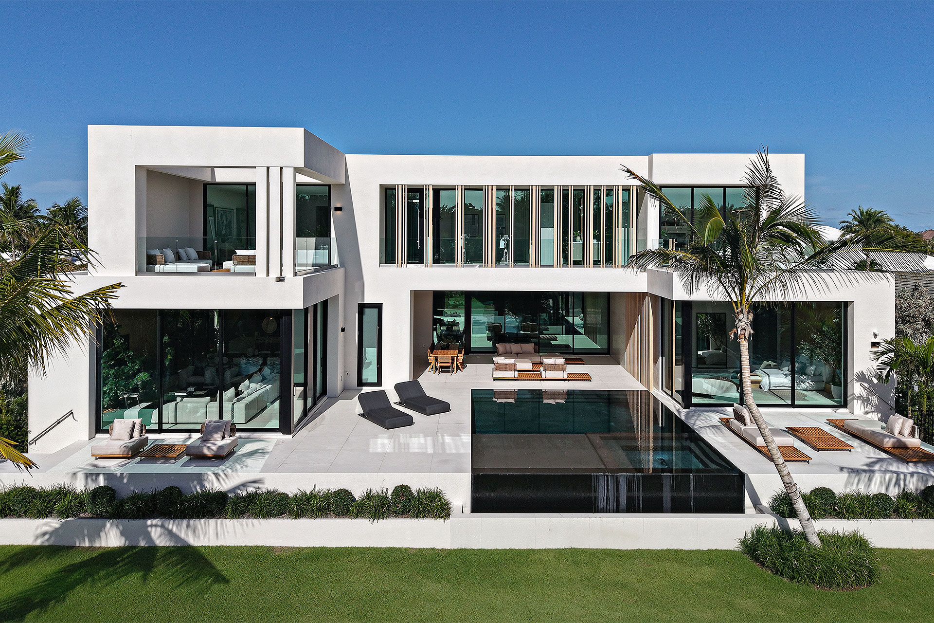 Pairing warm, contemporary styling with organic, ultra-luxurious finishes, this unique five-bedroom custom Estate, designed by B1 Architects, executed by Ocean Blue Custom Homes, and interior design by 610 Interiors, is imbued with layers of complexity that underlie its minimalistic design. Museum-like and super-clean, a simple geometry of rectilinear design elements, white-oak architectural-fins add visual interest to the façade while enhancing privacy. Within, custom reglets and trimless windows, lighting and air-conditioning vents augment the simplicity of the residence’s modern approach. Overall, ceilings are 11 feet-plus on the first floor, and 10± feet on the second floor, with the interiors clad in feature window-walls of glass that offer scenic water views. Central to the estate’s floorplan, and at its very heart, an olive tree and river rock are embraced within an open-air atrium. Amplifying this focal point, the atrium is bookended by a floating stairway with a bronze-framed glass balustrade and white-oak treads, along with a gallery that opens to a stunning loggia overlooking its beautiful natural surroundings as a core inspiration. In one wing, the great room invites entertaining, served by two kitchens. Fitted with a full complement of professional-grade appliances, both kitchens are finished with custom metallic cabinetry incorporating bronzed-glass doors. A special detail in the main kitchen is an InvisaCook invisible cooktop to maximize counter space on the oversized island, while a highlight in the catering kitchen is a floating wine column. In the opposite wing, the water-view bedroom of the primary suite is enriched with rift-cut, white-oak paneling and built-in millwork. The suite’s closet features an open concept with glass display shelving and closets, while the walk-through shower in the bathroom has sliding pocket doors on each side that lead to a private outdoor shower area and garden. On the second-floor are three luxurious guest bedrooms suites, along with a gym, a clubroom that opens to a spacious water-view balcony, and an office with a bronzed-glass wall. Completing the layout are an elevator, two laundry rooms, and two garages, with a total of three bays and high ceilings that can accommodate lifts, allowing covered parking for six cars.