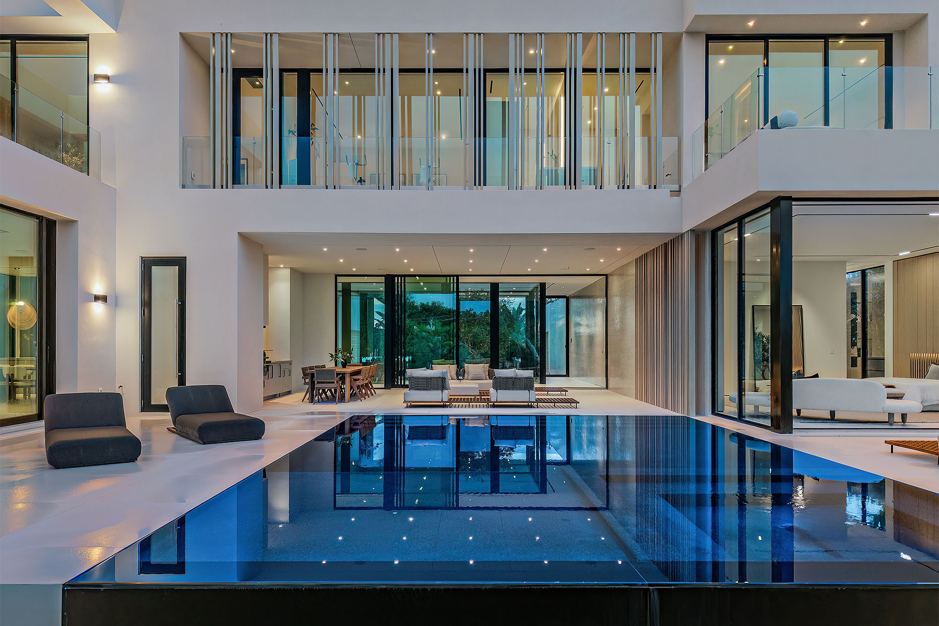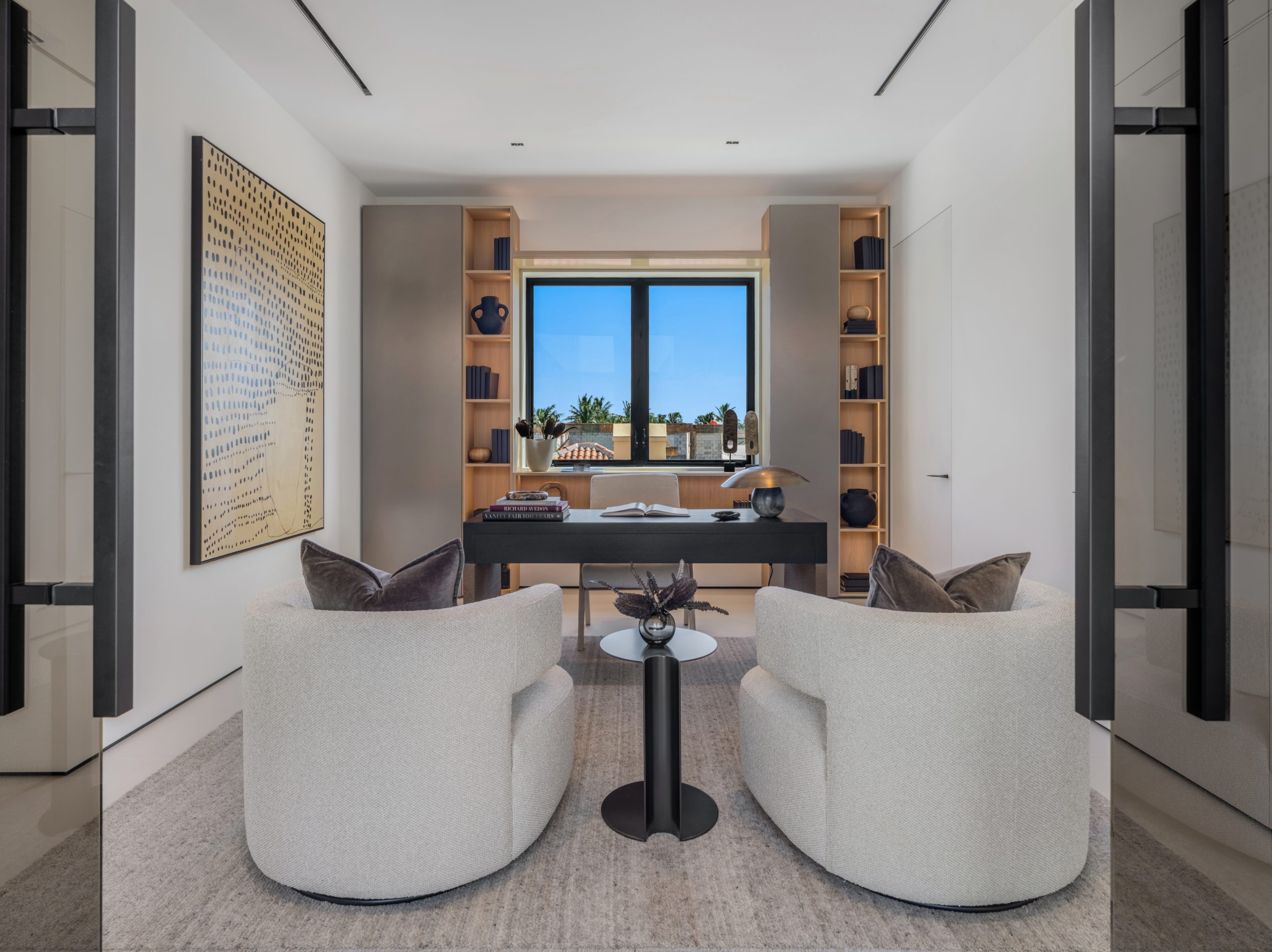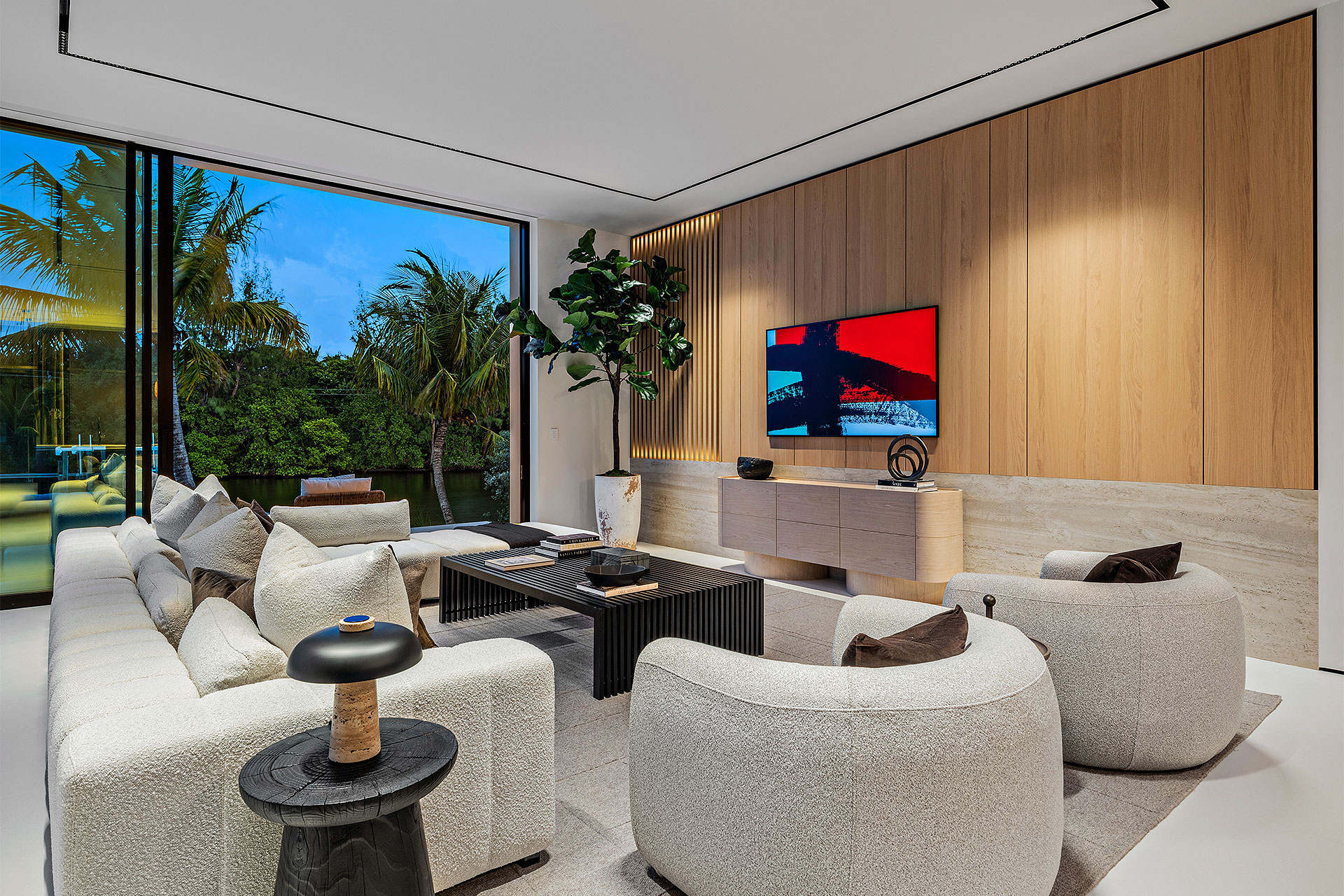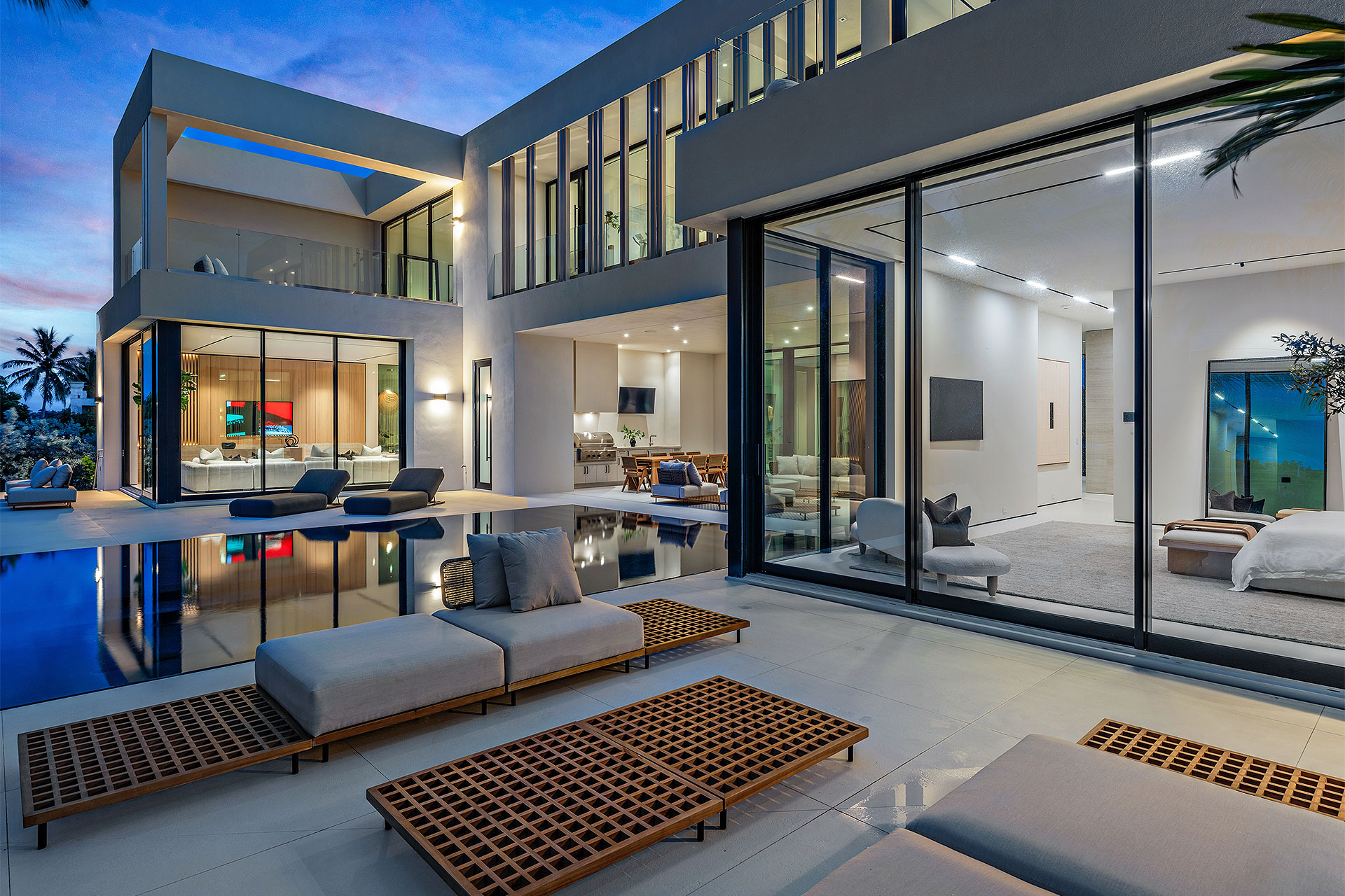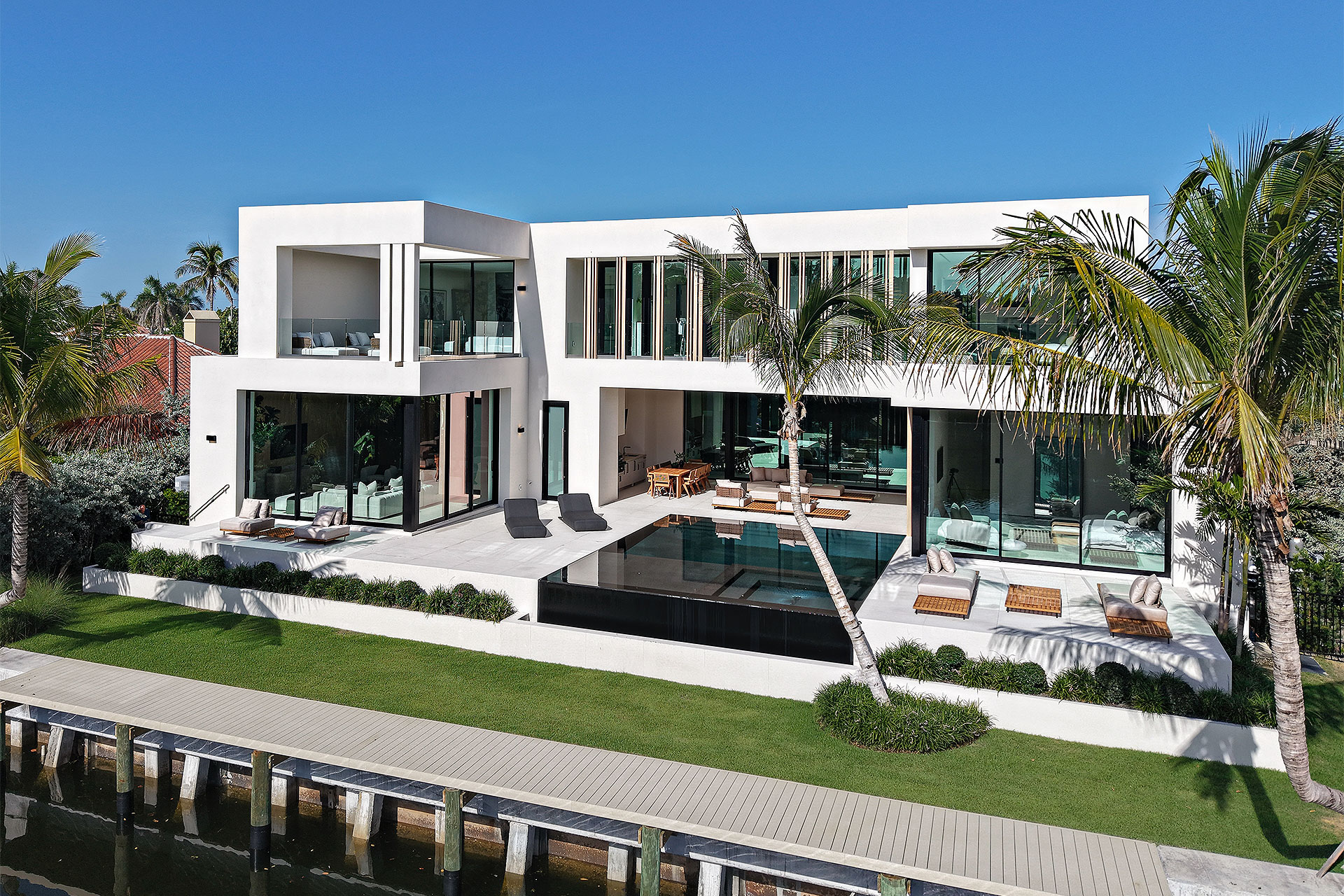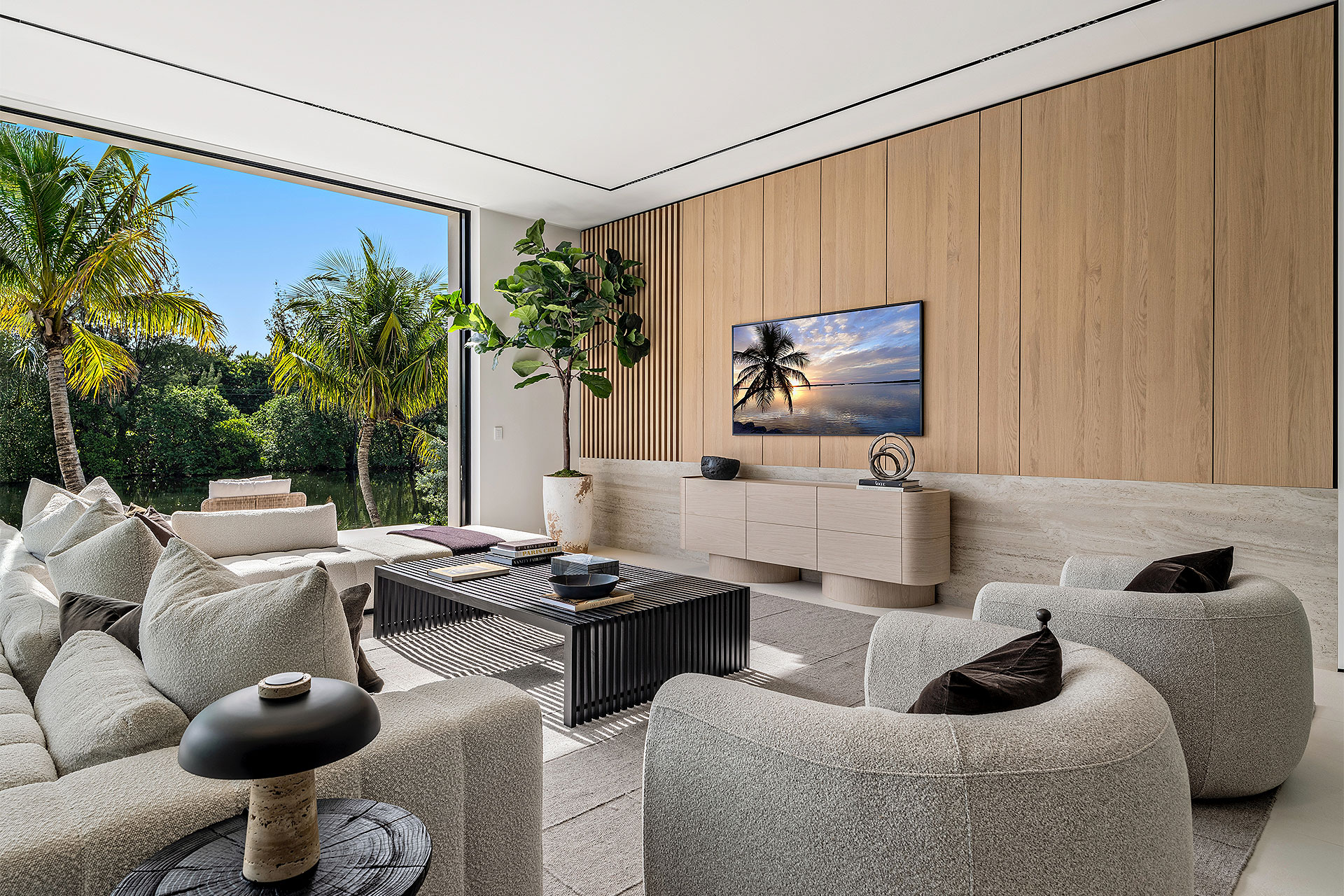 Pairing warm, contemporary styling with organic, ultra-luxurious finishes, this unique five-bedroom custom Estate, designed by B1 Architects, executed by Ocean Blue Custom Homes, and interior design by 610 Interiors, is imbued with layers of complexity that underlie its minimalistic design. Museum-like and super-clean, a simple geometry of rectilinear design elements, white-oak architectural-fins add visual interest to the façade while enhancing privacy. Within, custom reglets and trimless windows, lighting and air-conditioning vents augment the simplicity of the residence’s modern approach. Overall, ceilings are 11 feet-plus on the first floor, and 10± feet on the second floor, with the interiors clad in feature window-walls of glass that offer scenic water views. Central to the estate’s floorplan, and at its very heart, an olive tree and river rock are embraced within an open-air atrium. Amplifying this focal point, the atrium is bookended by a floating stairway with a bronze-framed glass balustrade and white-oak treads, along with a gallery that opens to a stunning loggia overlooking its beautiful natural surroundings as a core inspiration. In one wing, the great room invites entertaining, served by two kitchens. Fitted with a full complement of professional-grade appliances, both kitchens are finished with custom metallic cabinetry incorporating bronzed-glass doors. A special detail in the main kitchen is an InvisaCook invisible cooktop to maximize counter space on the oversized island, while a highlight in the catering kitchen is a floating wine column. In the opposite wing, the water-view bedroom of the primary suite is enriched with rift-cut, white-oak paneling and built-in millwork. The suite’s closet features an open concept with glass display shelving and closets, while the walk-through shower in the bathroom has sliding pocket doors on each side that lead to a private outdoor shower area and garden. On the second-floor are three luxurious guest bedrooms suites, along with a gym, a clubroom that opens to a spacious water-view balcony, and an office with a bronzed-glass wall. Completing the layout are an elevator, two laundry rooms, and two garages, with a total of three bays and high ceilings that can accommodate lifts, allowing covered parking for six cars.