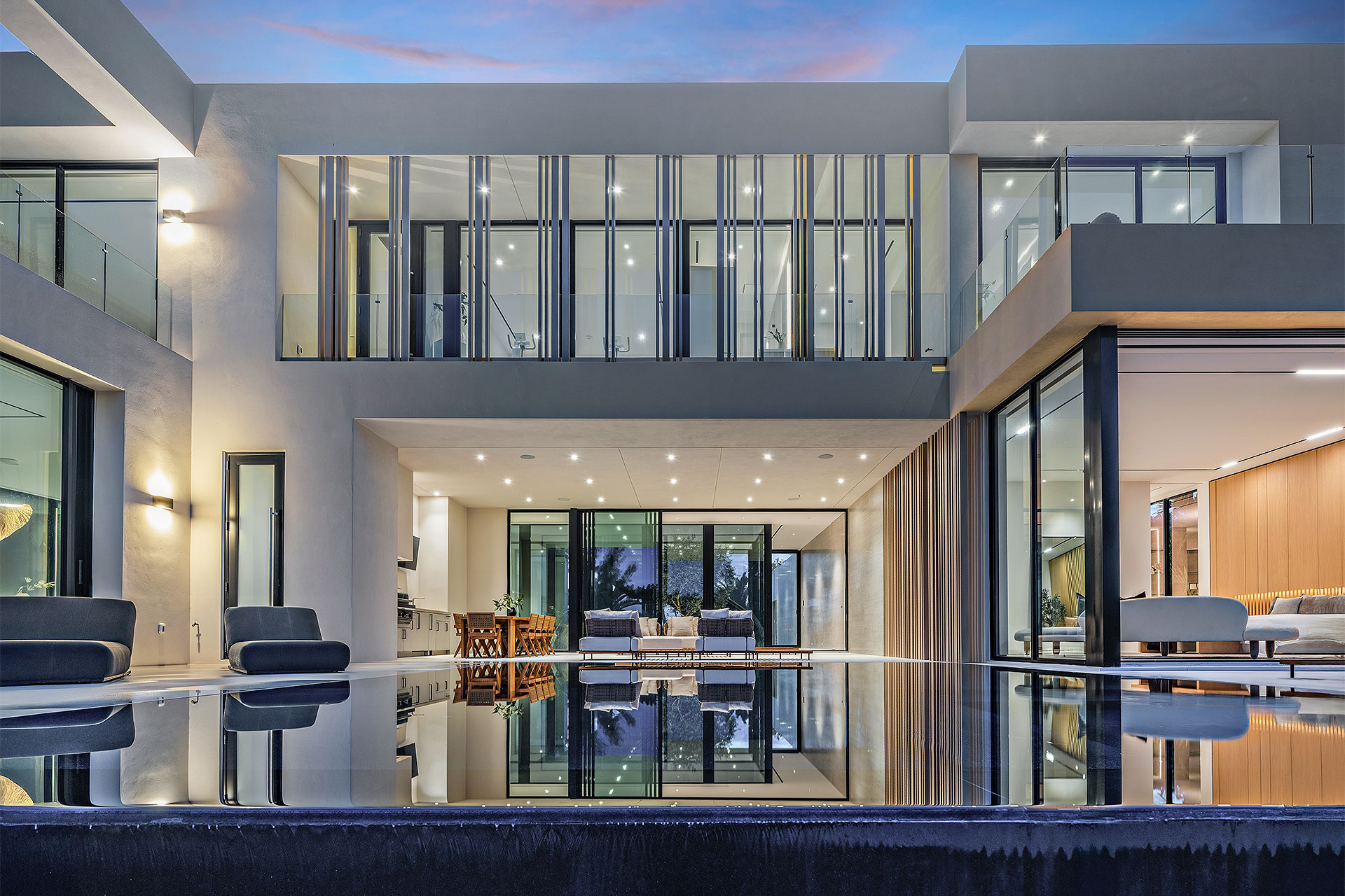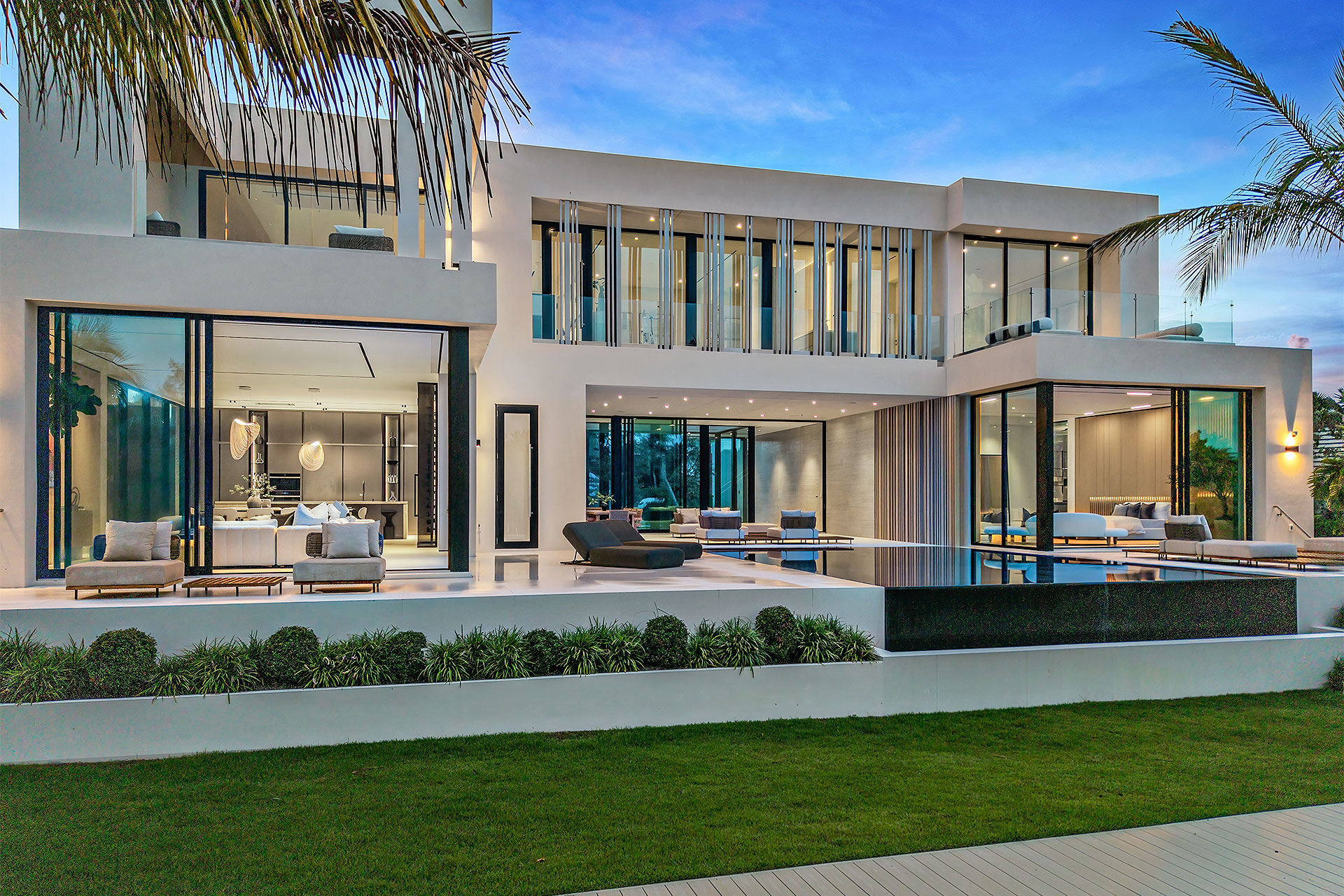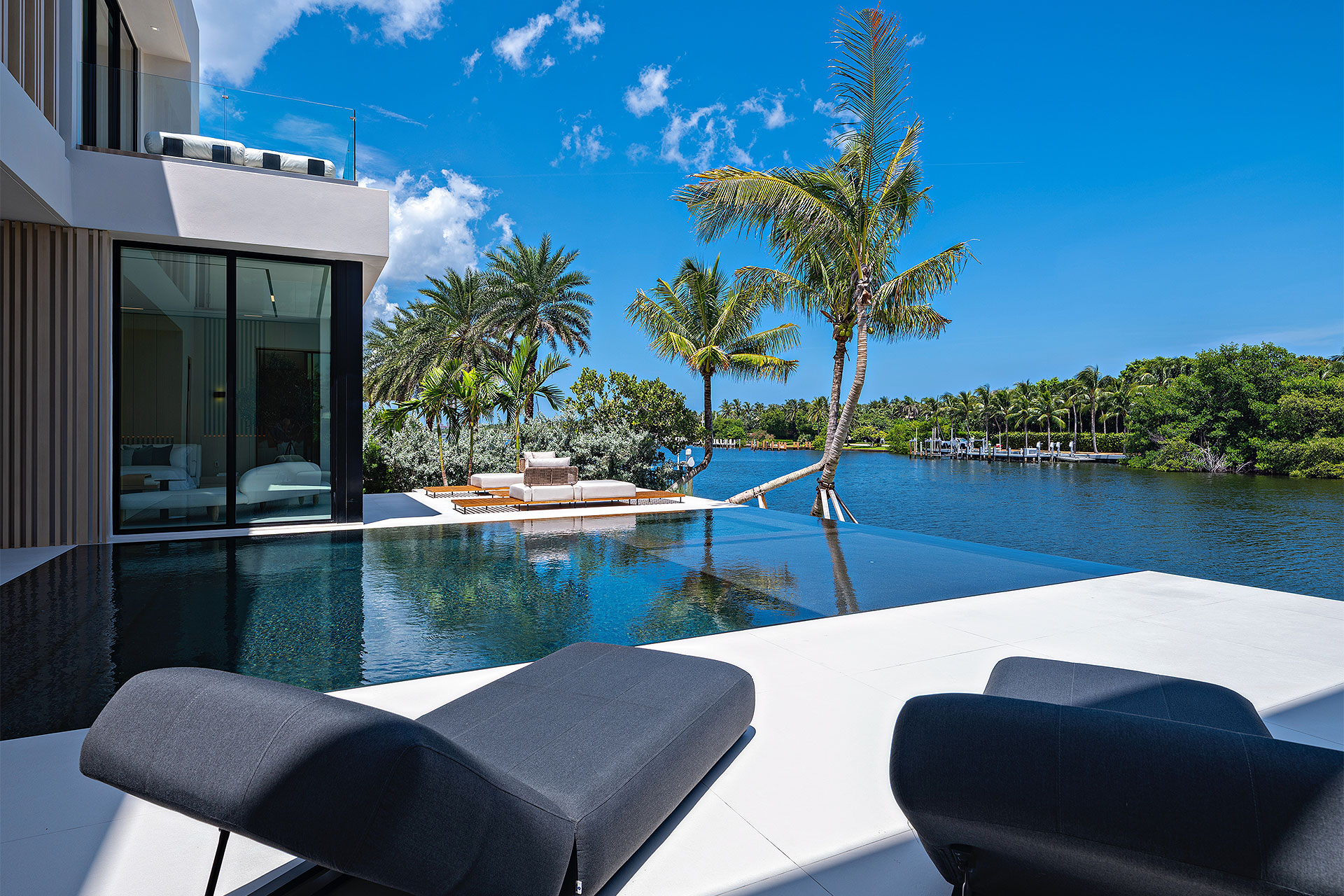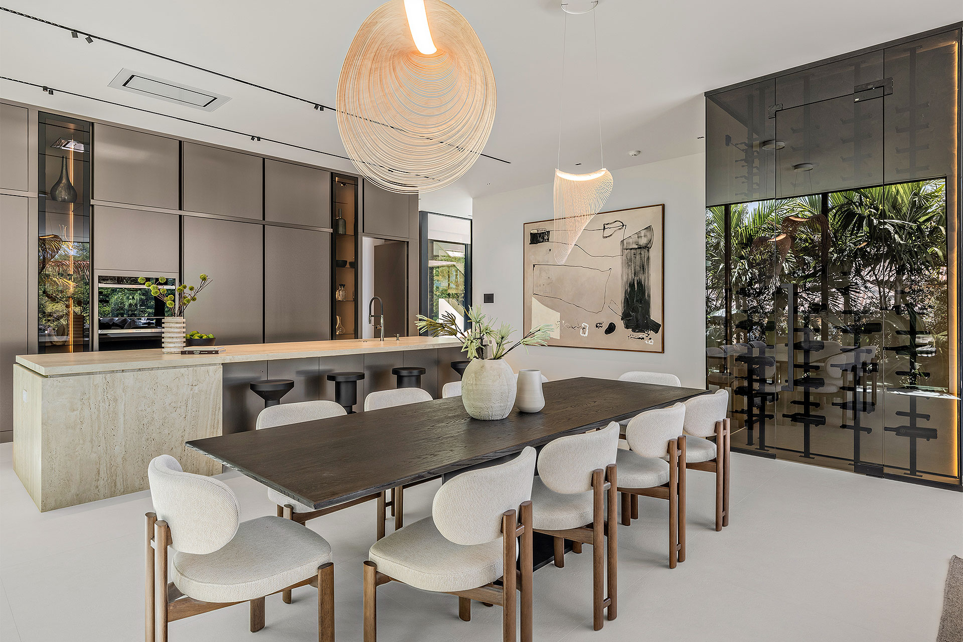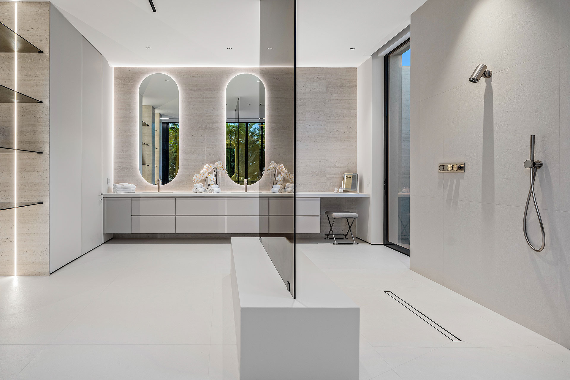 Pairing warm, contemporary styling with organic, ultra-luxurious finishes, this unique five-bedroom custom Estate, designed by B1 Architects, executed by Ocean Blue Custom Homes, and interior design by 610 Interiors, is imbued with layers of complexity that underlie its minimalistic design. Museum-like and super-clean, a simple geometry of rectilinear design elements, white-oak architectural-fins add visual interest to the façade while enhancing privacy. Within, custom reglets and trimless windows, lighting and air-conditioning vents augment the simplicity of the residence’s modern approach. Overall, ceilings are 11 feet-plus on the first floor, and 10± feet on the second floor, with the interiors clad in feature window-walls of glass that offer scenic water views. Central to the estate’s floorplan, and at its very heart, an olive tree and river rock are embraced within an open-air atrium. Amplifying this focal point, the atrium is bookended by a floating stairway with a bronze-framed glass balustrade and white-oak treads, along with a gallery that opens to a stunning loggia overlooking its beautiful natural surroundings as a core inspiration. In one wing, the great room invites entertaining, served by two kitchens. Fitted with a full complement of professional-grade appliances, both kitchens are finished with custom metallic cabinetry incorporating bronzed-glass doors. A special detail in the main kitchen is an InvisaCook invisible cooktop to maximize counter space on the oversized island, while a highlight in the catering kitchen is a floating wine column. In the opposite wing, the water-view bedroom of the primary suite is enriched with rift-cut, white-oak paneling and built-in millwork. The suite’s closet features an open concept with glass display shelving and closets, while the walk-through shower in the bathroom has sliding pocket doors on each side that lead to a private outdoor shower area and garden. On the second-floor are three luxurious guest bedrooms suites, along with a gym, a clubroom that opens to a spacious water-view balcony, and an office with a bronzed-glass wall. Completing the layout are an elevator, two laundry rooms, and two garages, with a total of three bays and high ceilings that can accommodate lifts, allowing covered parking for six cars.