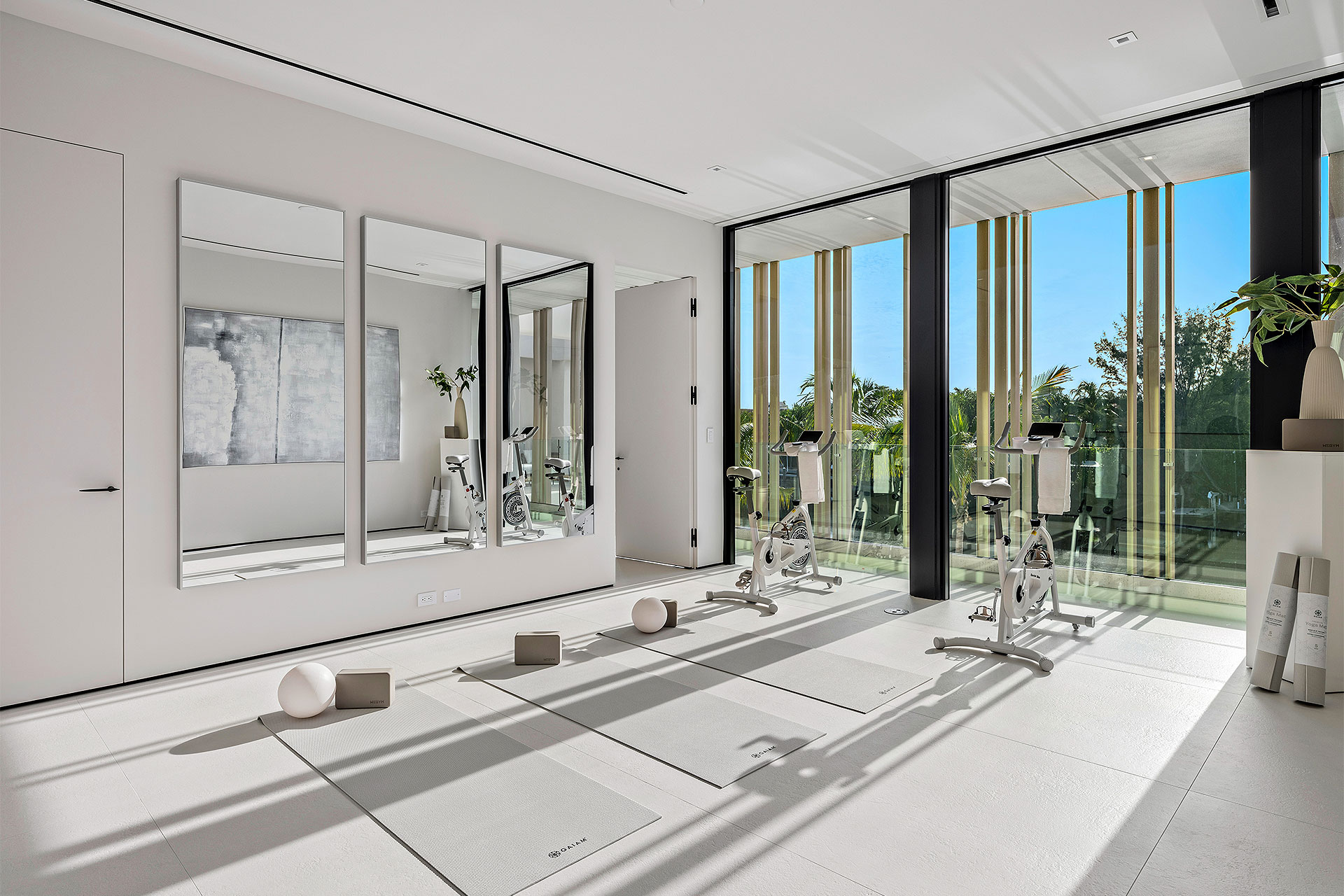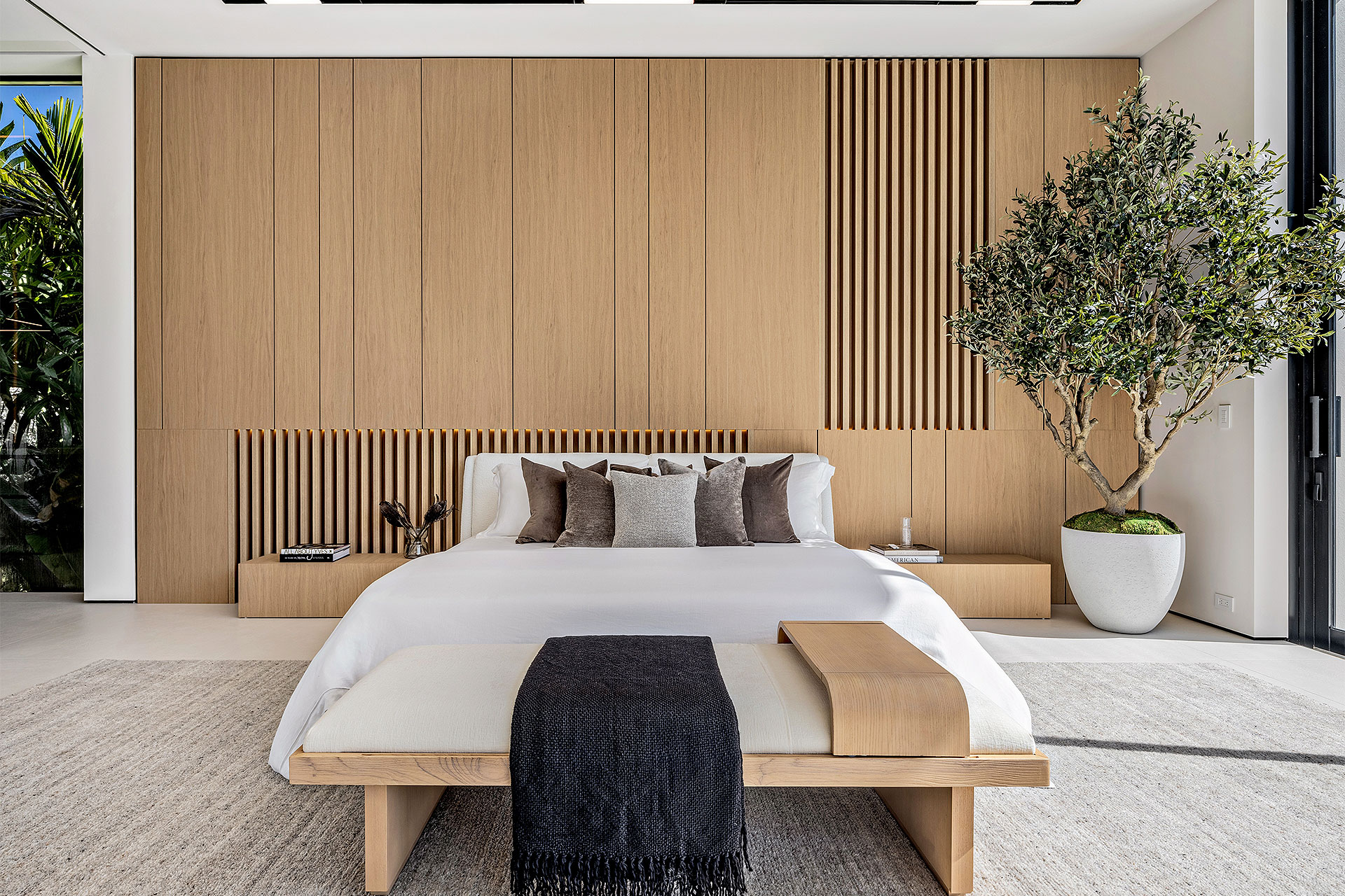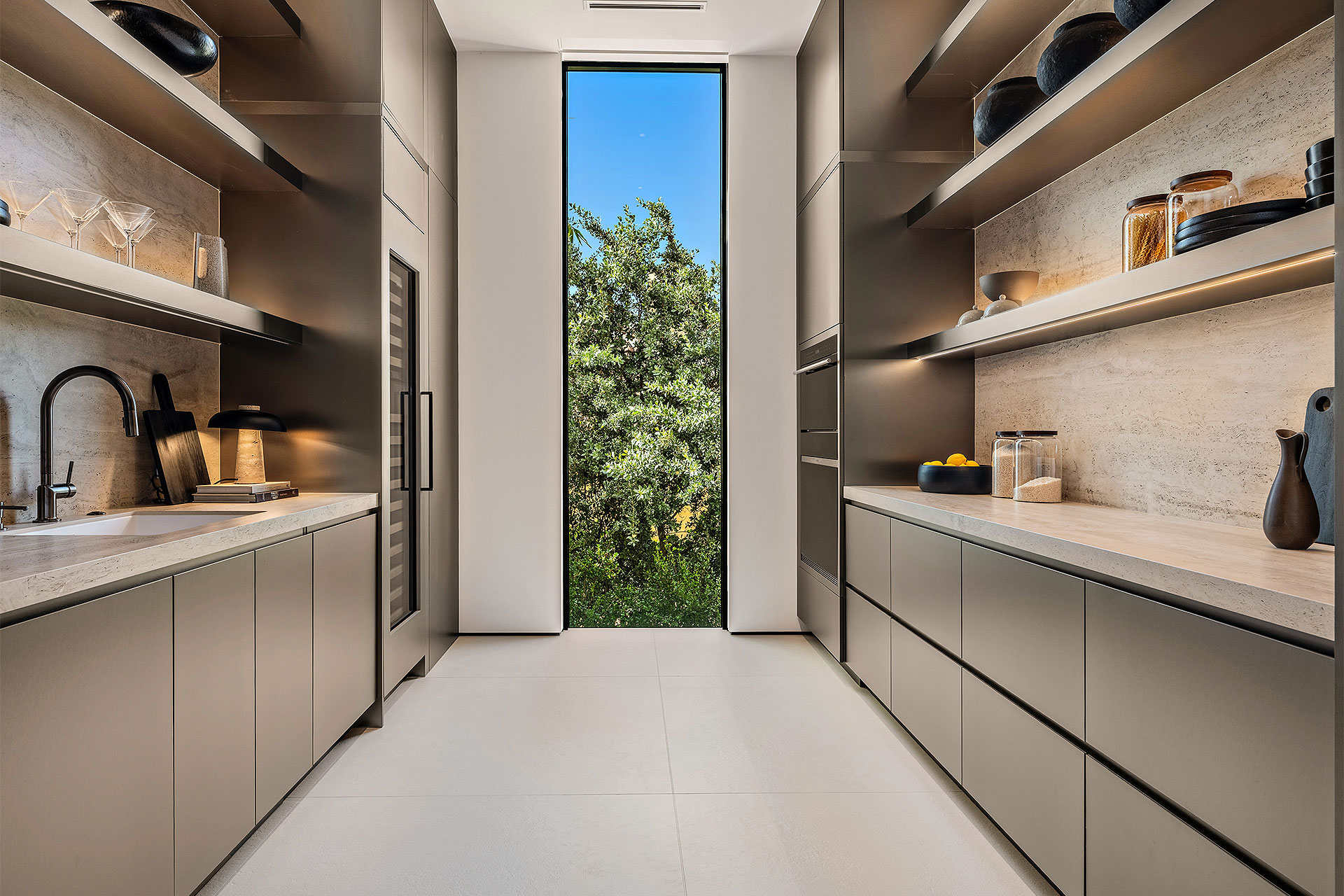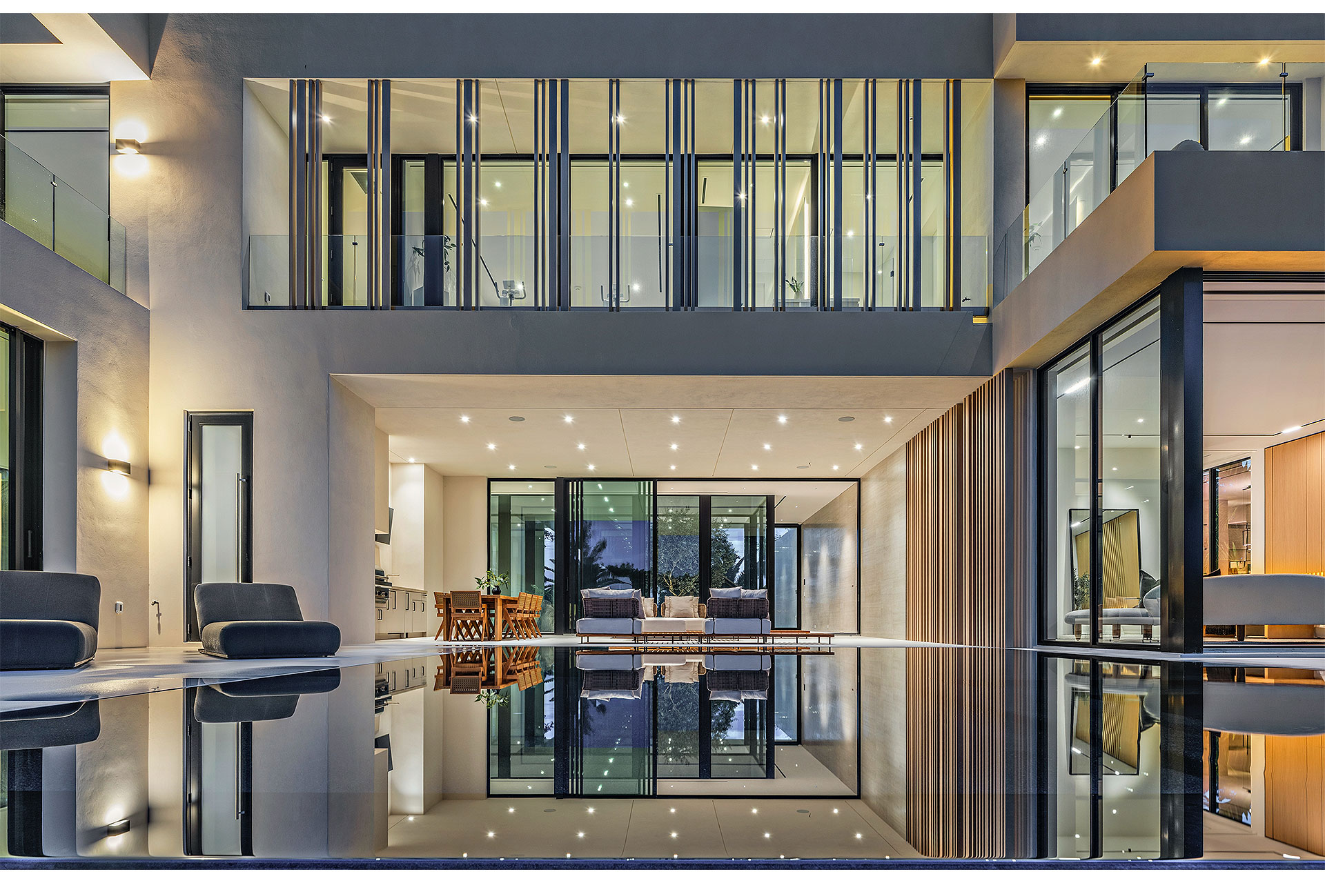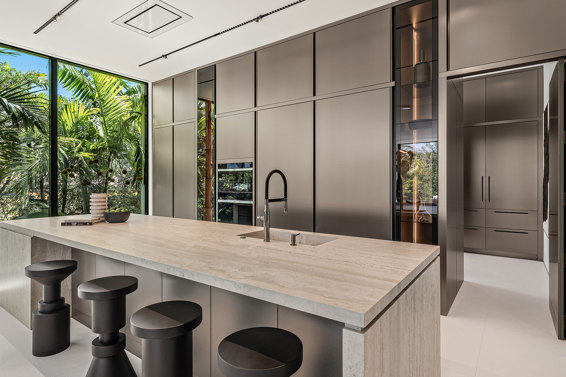 Pairing warm, contemporary styling with organic, ultra-luxurious finishes, this unique five-bedroom custom Estate, designed by B1 Architects, executed by Ocean Blue Custom Homes, and interior design by 610 Interiors, is imbued with layers of complexity that underlie its minimalistic design. Museum-like and super-clean, a simple geometry of rectilinear design elements, white-oak architectural-fins add visual interest to the façade while enhancing privacy. Within, custom reglets and trimless windows, lighting and air-conditioning vents augment the simplicity of the residence’s modern approach. Overall, ceilings are 11 feet-plus on the first floor, and 10± feet on the second floor, with the interiors clad in feature window-walls of glass that offer scenic water views. Central to the estate’s floorplan, and at its very heart, an olive tree and river rock are embraced within an open-air atrium. Amplifying this focal point, the atrium is bookended by a floating stairway with a bronze-framed glass balustrade and white-oak treads, along with a gallery that opens to a stunning loggia overlooking its beautiful natural surroundings as a core inspiration. In one wing, the great room invites entertaining, served by two kitchens. Fitted with a full complement of professional-grade appliances, both kitchens are finished with custom metallic cabinetry incorporating bronzed-glass doors. A special detail in the main kitchen is an InvisaCook invisible cooktop to maximize counter space on the oversized island, while a highlight in the catering kitchen is a floating wine column. In the opposite wing, the water-view bedroom of the primary suite is enriched with rift-cut, white-oak paneling and built-in millwork. The suite’s closet features an open concept with glass display shelving and closets, while the walk-through shower in the bathroom has sliding pocket doors on each side that lead to a private outdoor shower area and garden. On the second-floor are three luxurious guest bedrooms suites, along with a gym, a clubroom that opens to a spacious water-view balcony, and an office with a bronzed-glass wall. Completing the layout are an elevator, two laundry rooms, and two garages, with a total of three bays and high ceilings that can accommodate lifts, allowing covered parking for six cars.