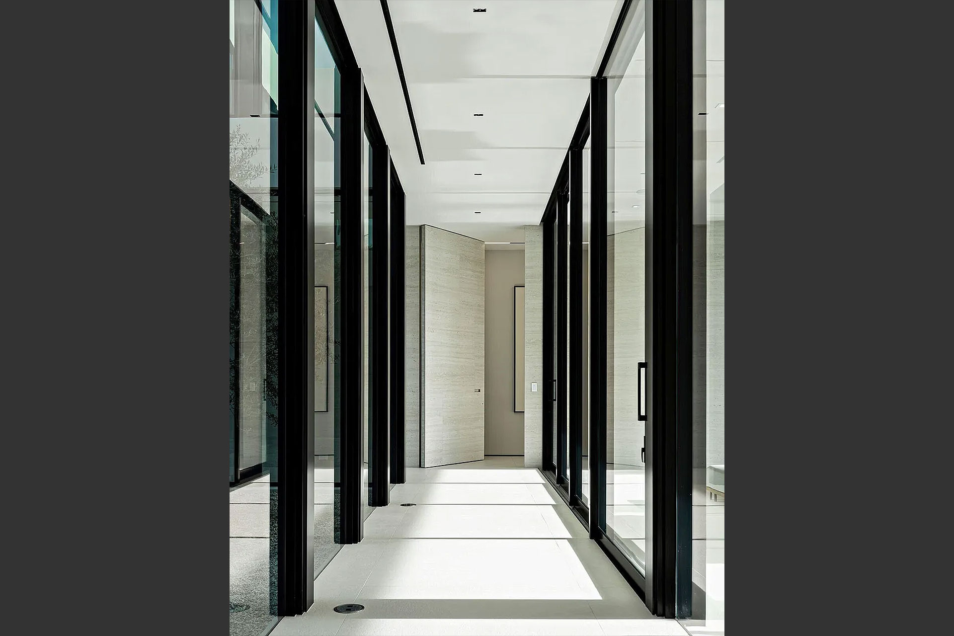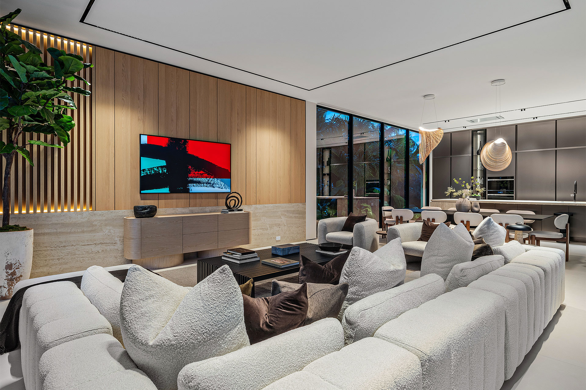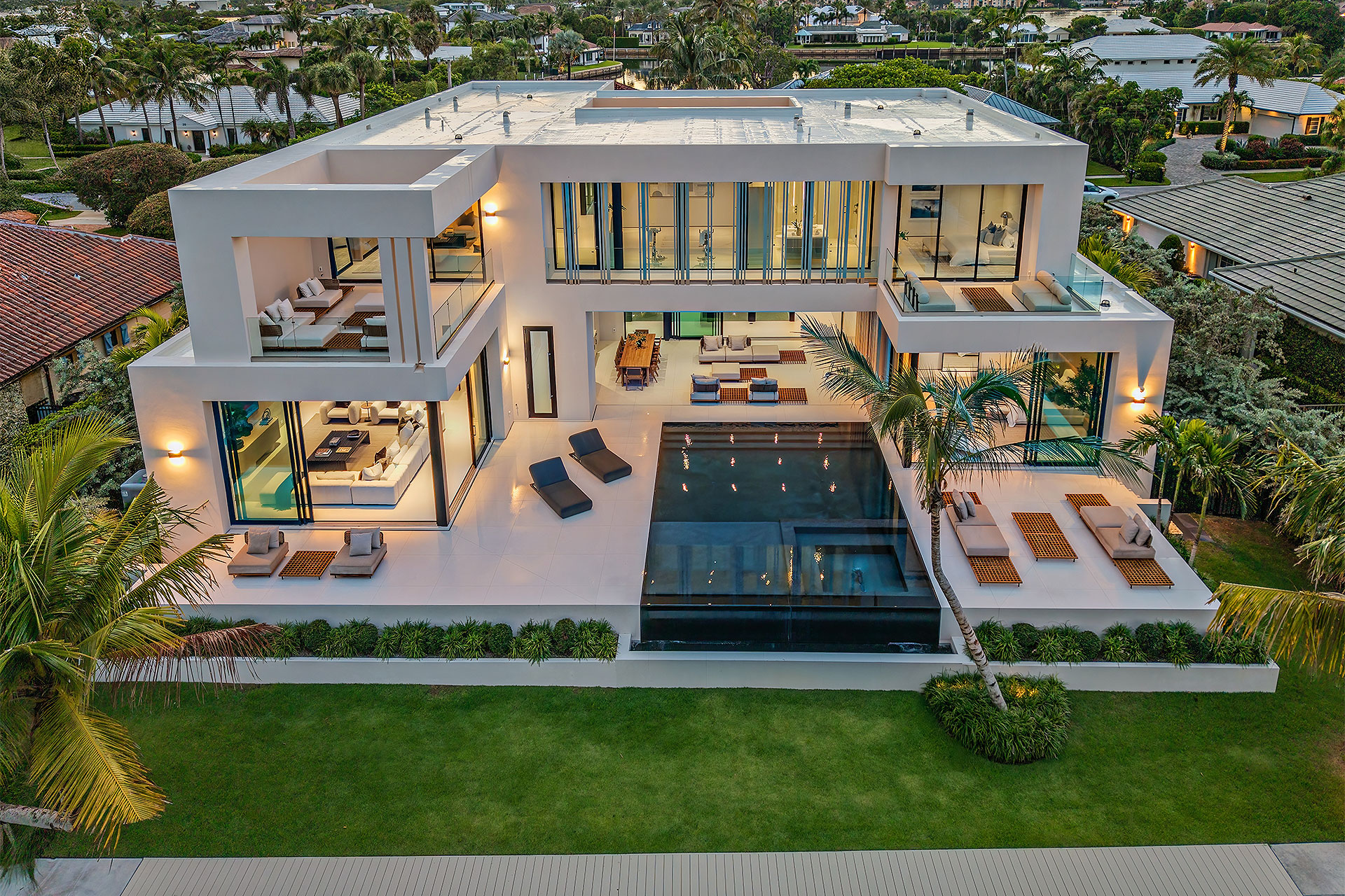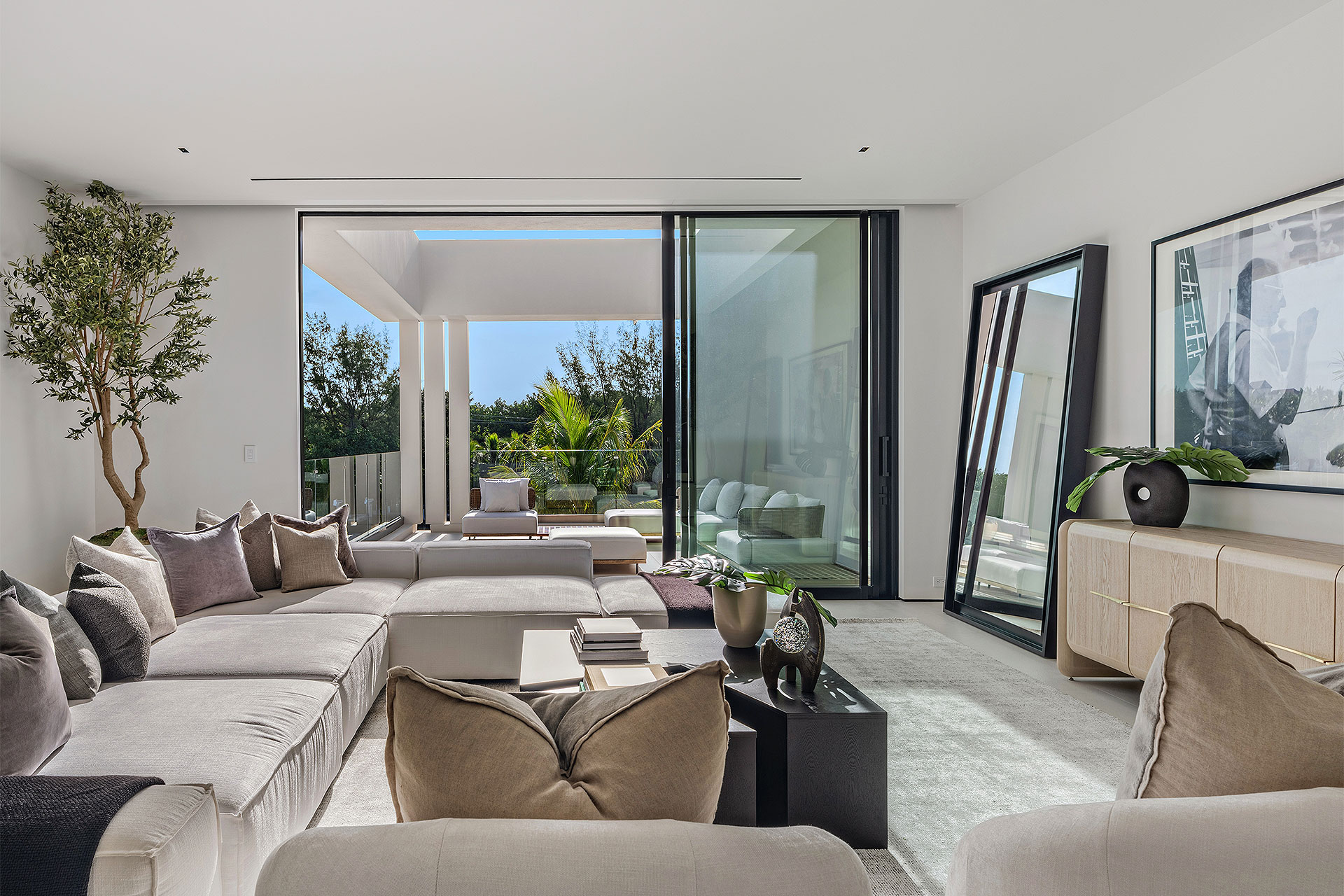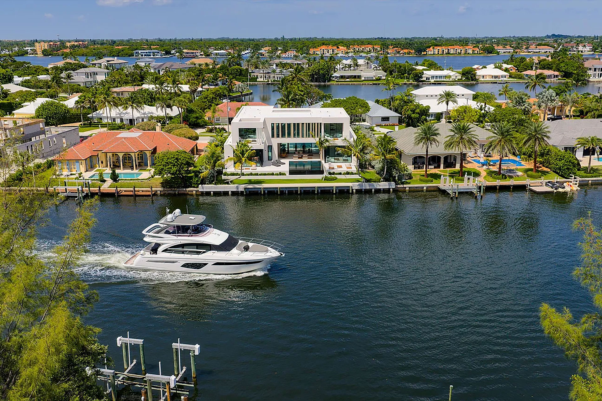 Pairing warm, contemporary styling with organic, ultra-luxurious finishes, this unique five-bedroom custom Estate, designed by B1 Architects, executed by Ocean Blue Custom Homes, and interior design by 610 Interiors, is imbued with layers of complexity that underlie its minimalistic design. Museum-like and super-clean, a simple geometry of rectilinear design elements, white-oak architectural-fins add visual interest to the façade while enhancing privacy. Within, custom reglets and trimless windows, lighting and air-conditioning vents augment the simplicity of the residence’s modern approach. Overall, ceilings are 11 feet-plus on the first floor, and 10± feet on the second floor, with the interiors clad in feature window-walls of glass that offer scenic water views. Central to the estate’s floorplan, and at its very heart, an olive tree and river rock are embraced within an open-air atrium. Amplifying this focal point, the atrium is bookended by a floating stairway with a bronze-framed glass balustrade and white-oak treads, along with a gallery that opens to a stunning loggia overlooking its beautiful natural surroundings as a core inspiration. In one wing, the great room invites entertaining, served by two kitchens. Fitted with a full complement of professional-grade appliances, both kitchens are finished with custom metallic cabinetry incorporating bronzed-glass doors. A special detail in the main kitchen is an InvisaCook invisible cooktop to maximize counter space on the oversized island, while a highlight in the catering kitchen is a floating wine column. In the opposite wing, the water-view bedroom of the primary suite is enriched with rift-cut, white-oak paneling and built-in millwork. The suite’s closet features an open concept with glass display shelving and closets, while the walk-through shower in the bathroom has sliding pocket doors on each side that lead to a private outdoor shower area and garden. On the second-floor are three luxurious guest bedrooms suites, along with a gym, a clubroom that opens to a spacious water-view balcony, and an office with a bronzed-glass wall. Completing the layout are an elevator, two laundry rooms, and two garages, with a total of three bays and high ceilings that can accommodate lifts, allowing covered parking for six cars.