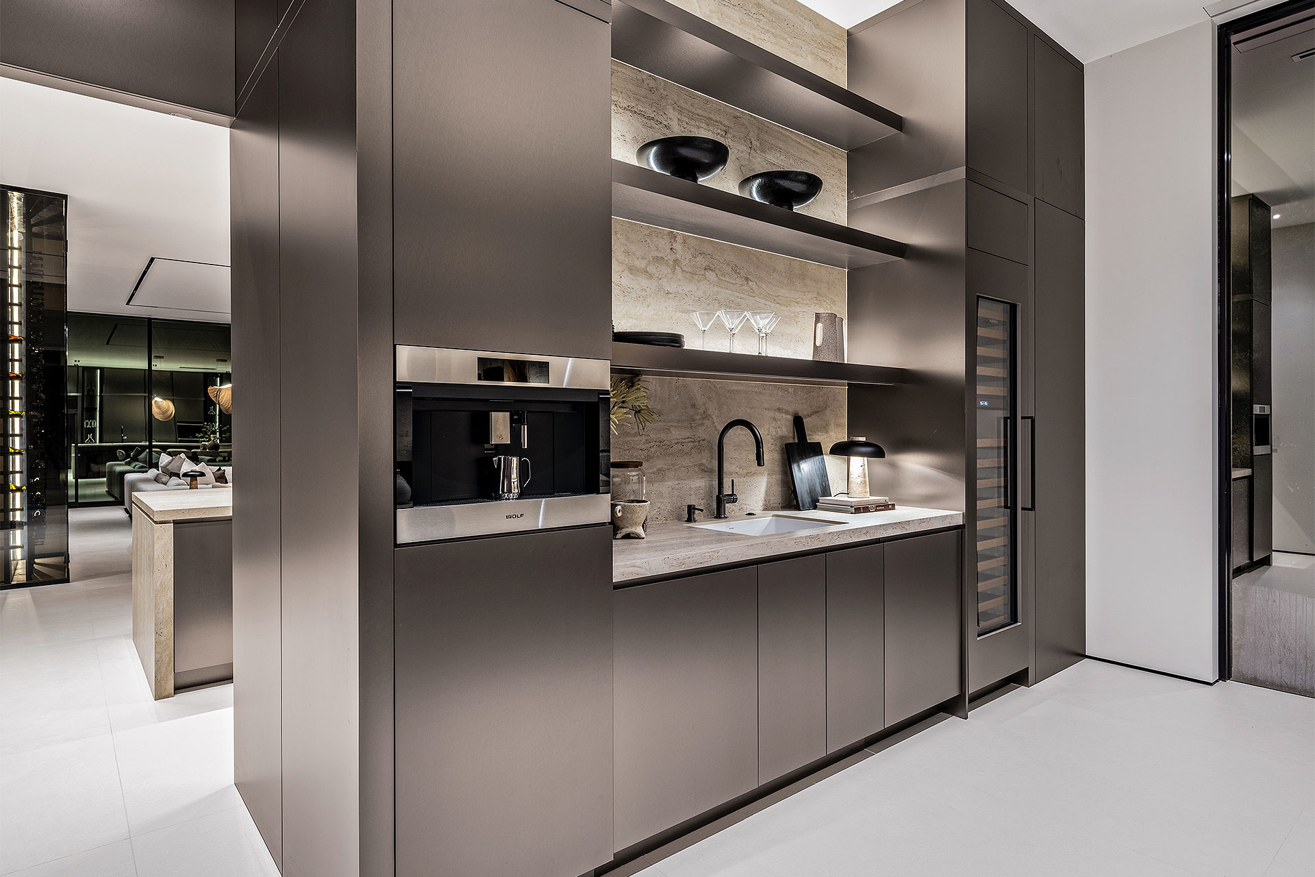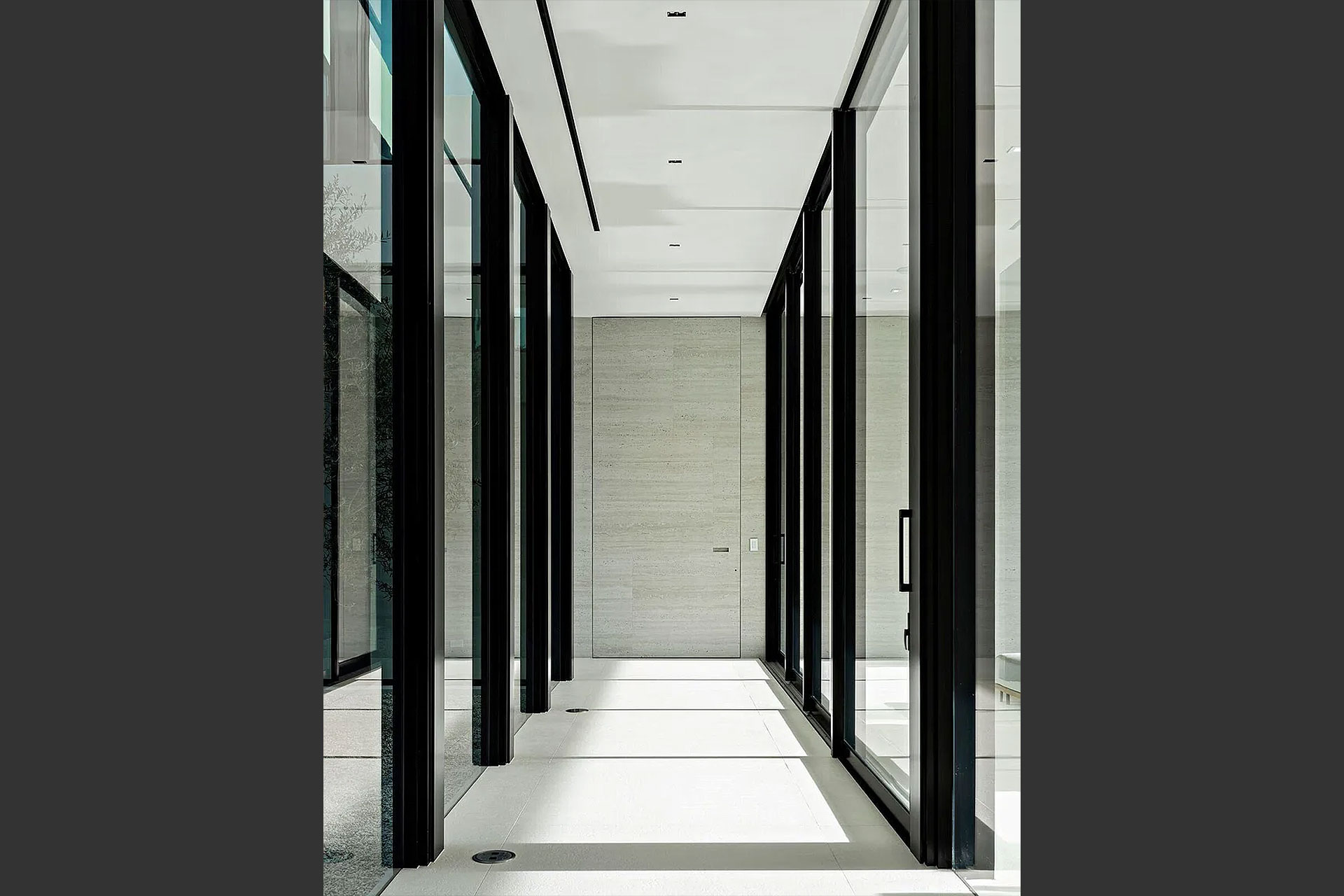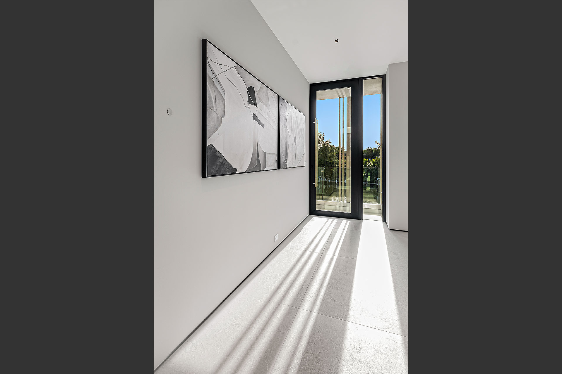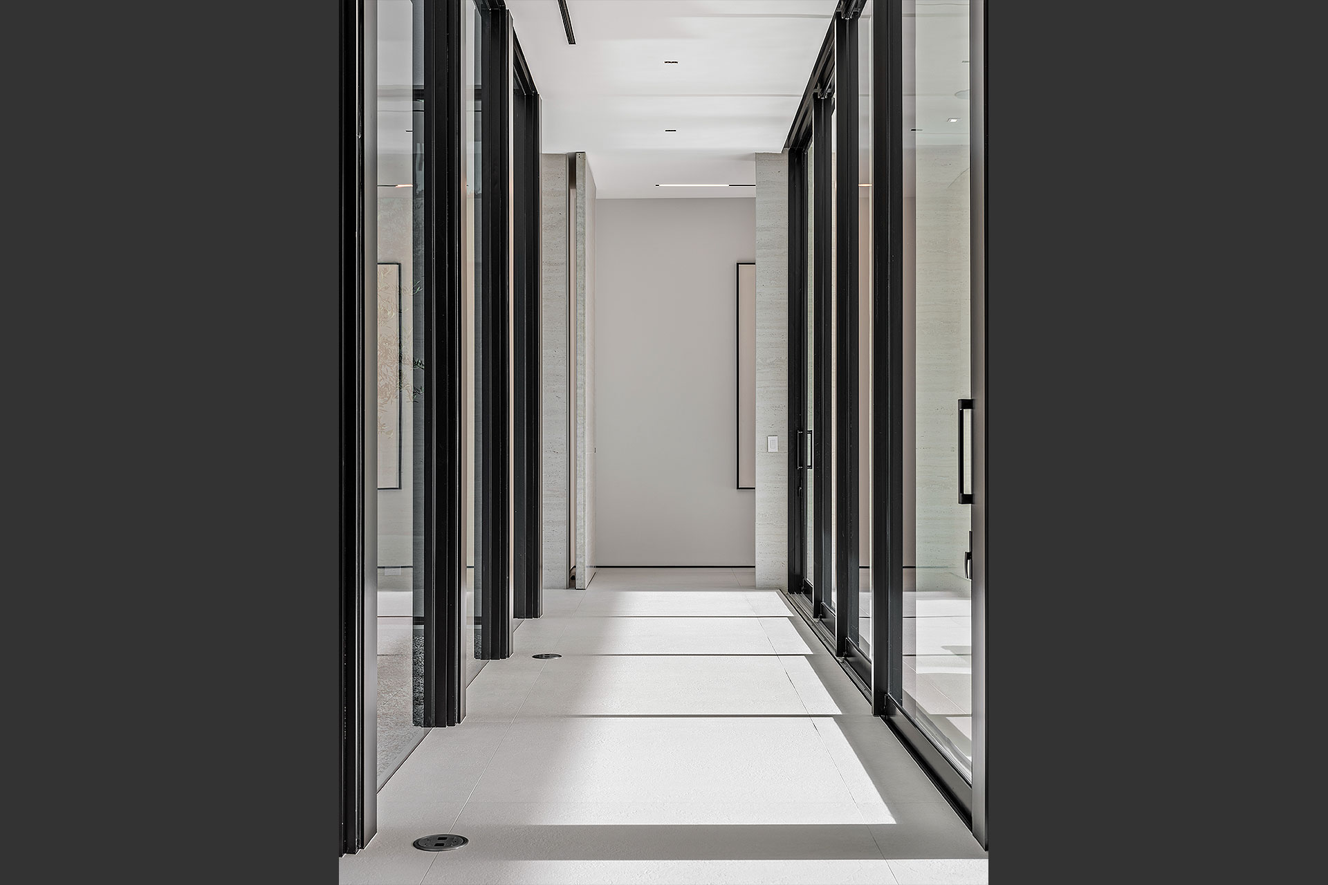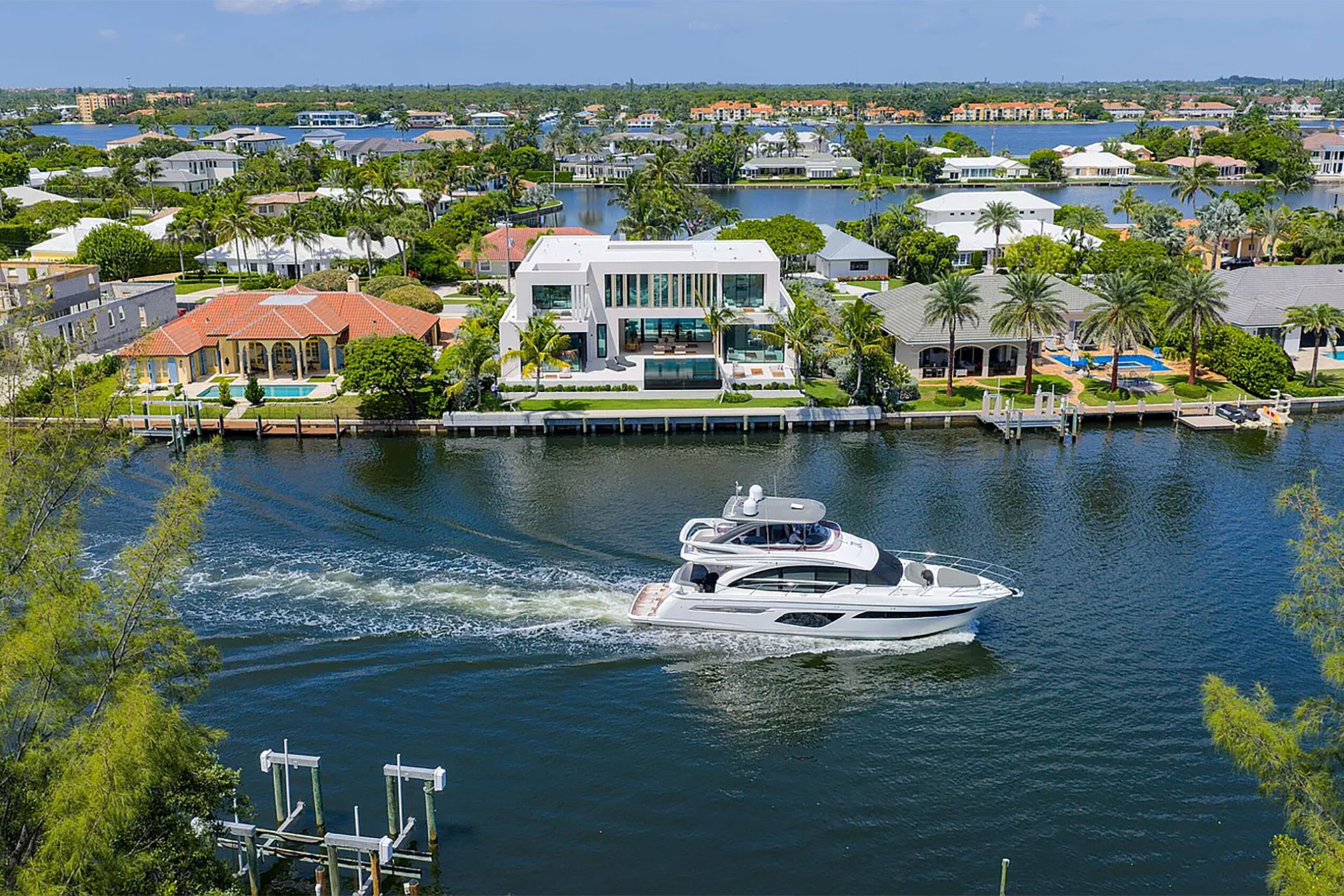 Pairing warm, contemporary styling with organic, ultra-luxurious finishes, this unique five-bedroom custom Estate, designed by B1 Architects, executed by Ocean Blue Custom Homes, and interior design by 610 Interiors, is imbued with layers of complexity that underlie its minimalistic design. Museum-like and super-clean, a simple geometry of rectilinear design elements, white-oak architectural-fins add visual interest to the façade while enhancing privacy. Within, custom reglets and trimless windows, lighting and air-conditioning vents augment the simplicity of the residence’s modern approach. Overall, ceilings are 11 feet-plus on the first floor, and 10± feet on the second floor, with the interiors clad in feature window-walls of glass that offer scenic water views. Central to the estate’s floorplan, and at its very heart, an olive tree and river rock are embraced within an open-air atrium. Amplifying this focal point, the atrium is bookended by a floating stairway with a bronze-framed glass balustrade and white-oak treads, along with a gallery that opens to a stunning loggia overlooking its beautiful natural surroundings as a core inspiration. In one wing, the great room invites entertaining, served by two kitchens. Fitted with a full complement of professional-grade appliances, both kitchens are finished with custom metallic cabinetry incorporating bronzed-glass doors. A special detail in the main kitchen is an InvisaCook invisible cooktop to maximize counter space on the oversized island, while a highlight in the catering kitchen is a floating wine column. In the opposite wing, the water-view bedroom of the primary suite is enriched with rift-cut, white-oak paneling and built-in millwork. The suite’s closet features an open concept with glass display shelving and closets, while the walk-through shower in the bathroom has sliding pocket doors on each side that lead to a private outdoor shower area and garden. On the second-floor are three luxurious guest bedrooms suites, along with a gym, a clubroom that opens to a spacious water-view balcony, and an office with a bronzed-glass wall. Completing the layout are an elevator, two laundry rooms, and two garages, with a total of three bays and high ceilings that can accommodate lifts, allowing covered parking for six cars.