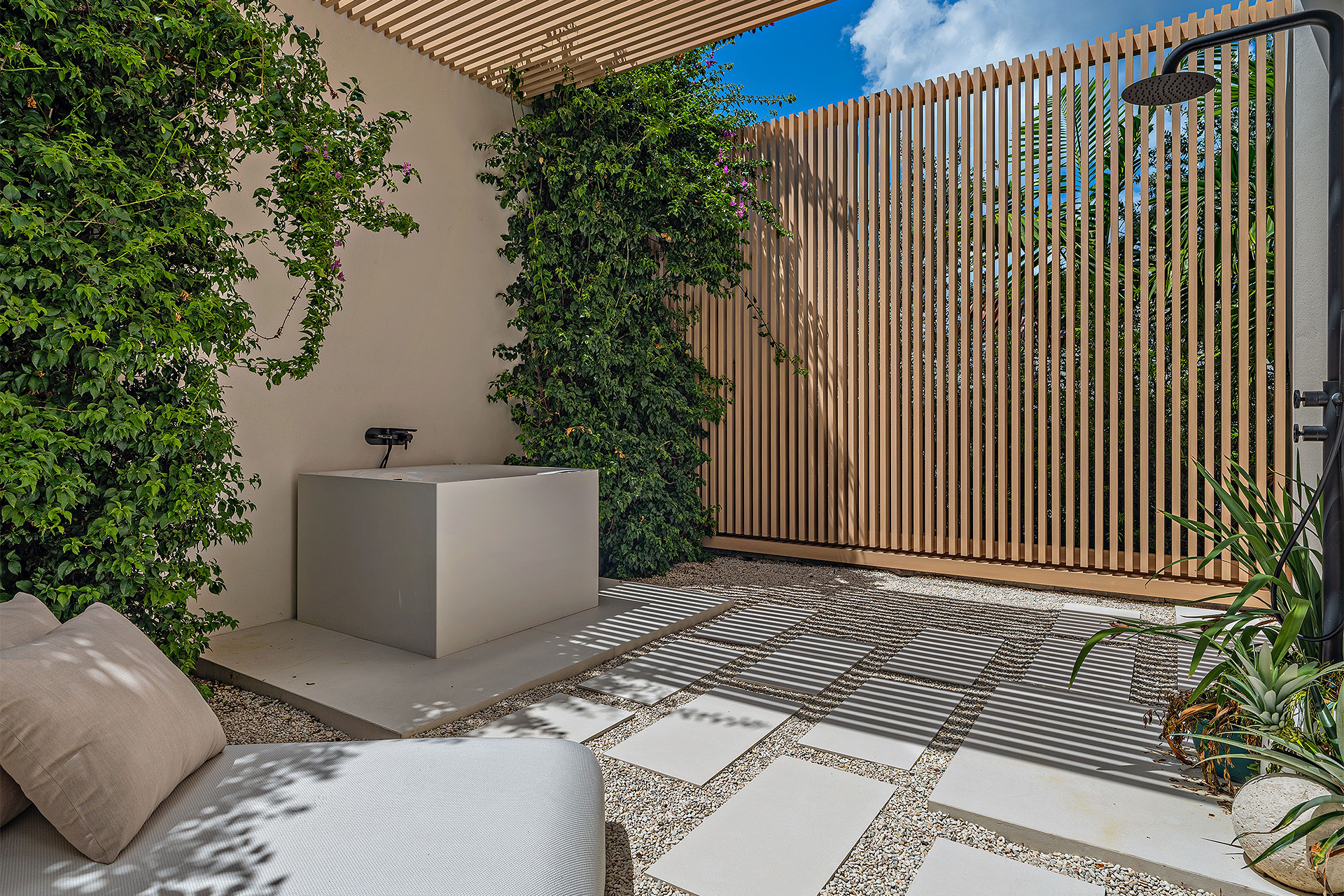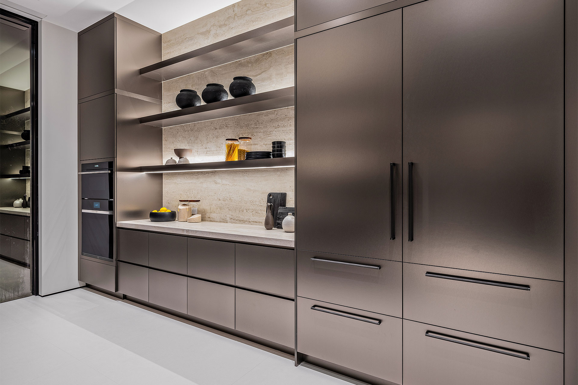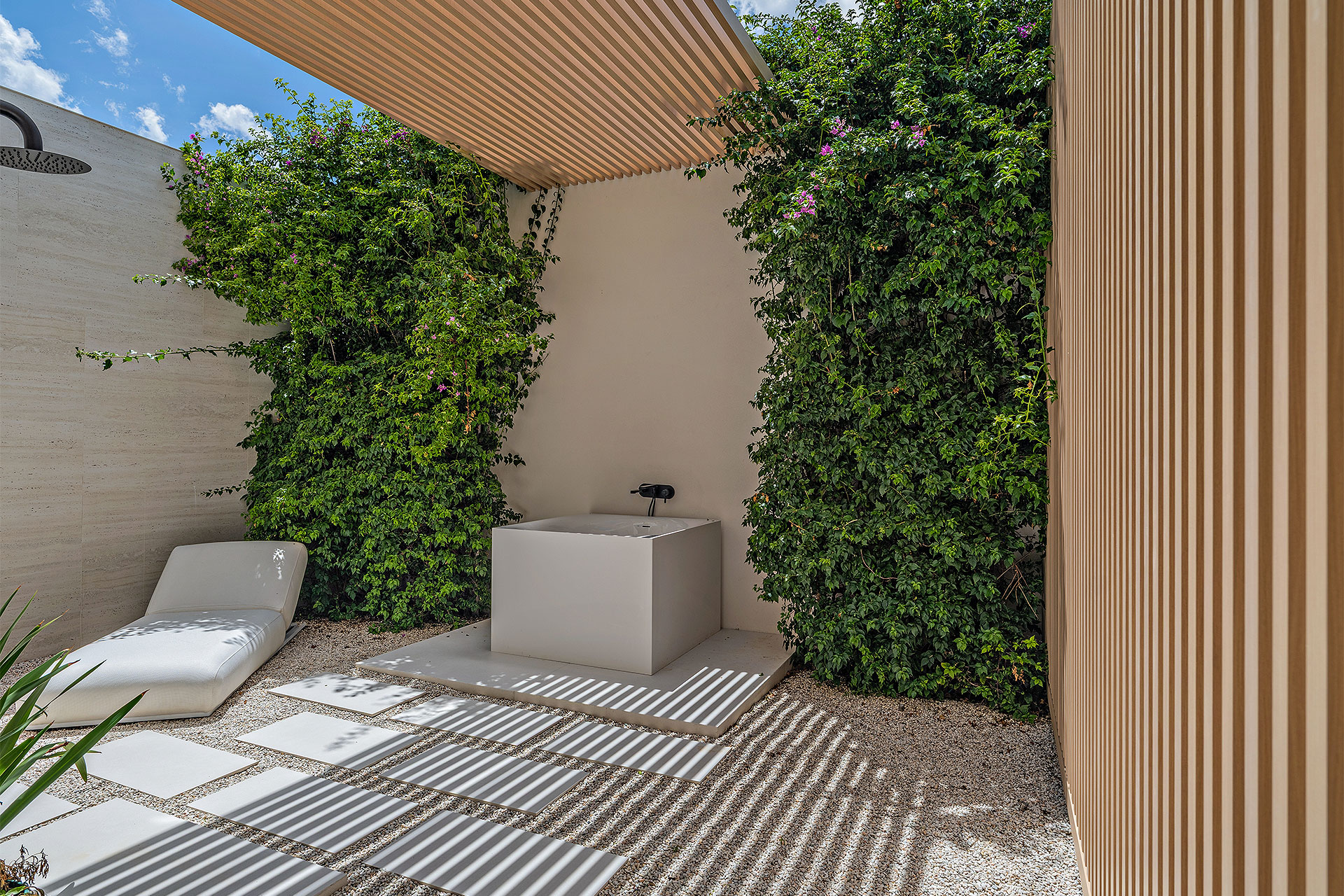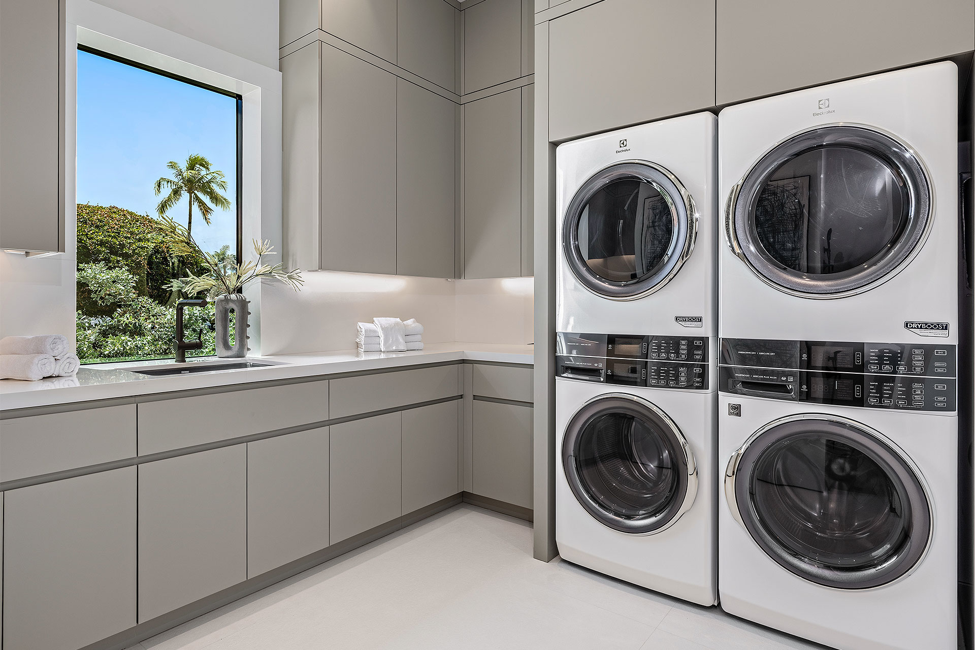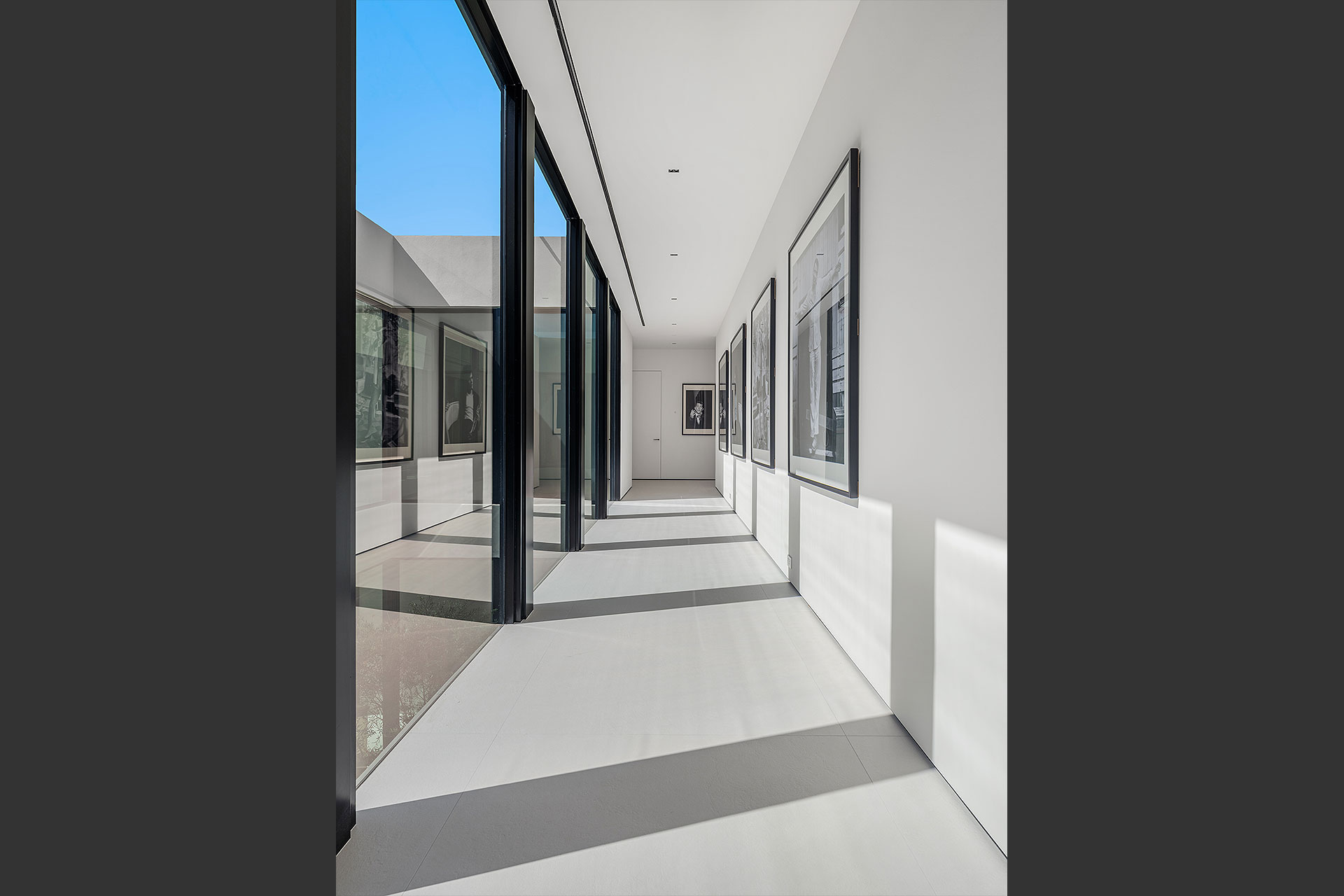 Pairing warm, contemporary styling with organic, ultra-luxurious finishes, this unique five-bedroom custom Estate, designed by B1 Architects, executed by Ocean Blue Custom Homes, and interior design by 610 Interiors, is imbued with layers of complexity that underlie its minimalistic design. Museum-like and super-clean, a simple geometry of rectilinear design elements, white-oak architectural-fins add visual interest to the façade while enhancing privacy. Within, custom reglets and trimless windows, lighting and air-conditioning vents augment the simplicity of the residence’s modern approach. Overall, ceilings are 11 feet-plus on the first floor, and 10± feet on the second floor, with the interiors clad in feature window-walls of glass that offer scenic water views. Central to the estate’s floorplan, and at its very heart, an olive tree and river rock are embraced within an open-air atrium. Amplifying this focal point, the atrium is bookended by a floating stairway with a bronze-framed glass balustrade and white-oak treads, along with a gallery that opens to a stunning loggia overlooking its beautiful natural surroundings as a core inspiration. In one wing, the great room invites entertaining, served by two kitchens. Fitted with a full complement of professional-grade appliances, both kitchens are finished with custom metallic cabinetry incorporating bronzed-glass doors. A special detail in the main kitchen is an InvisaCook invisible cooktop to maximize counter space on the oversized island, while a highlight in the catering kitchen is a floating wine column. In the opposite wing, the water-view bedroom of the primary suite is enriched with rift-cut, white-oak paneling and built-in millwork. The suite’s closet features an open concept with glass display shelving and closets, while the walk-through shower in the bathroom has sliding pocket doors on each side that lead to a private outdoor shower area and garden. On the second-floor are three luxurious guest bedrooms suites, along with a gym, a clubroom that opens to a spacious water-view balcony, and an office with a bronzed-glass wall. Completing the layout are an elevator, two laundry rooms, and two garages, with a total of three bays and high ceilings that can accommodate lifts, allowing covered parking for six cars.