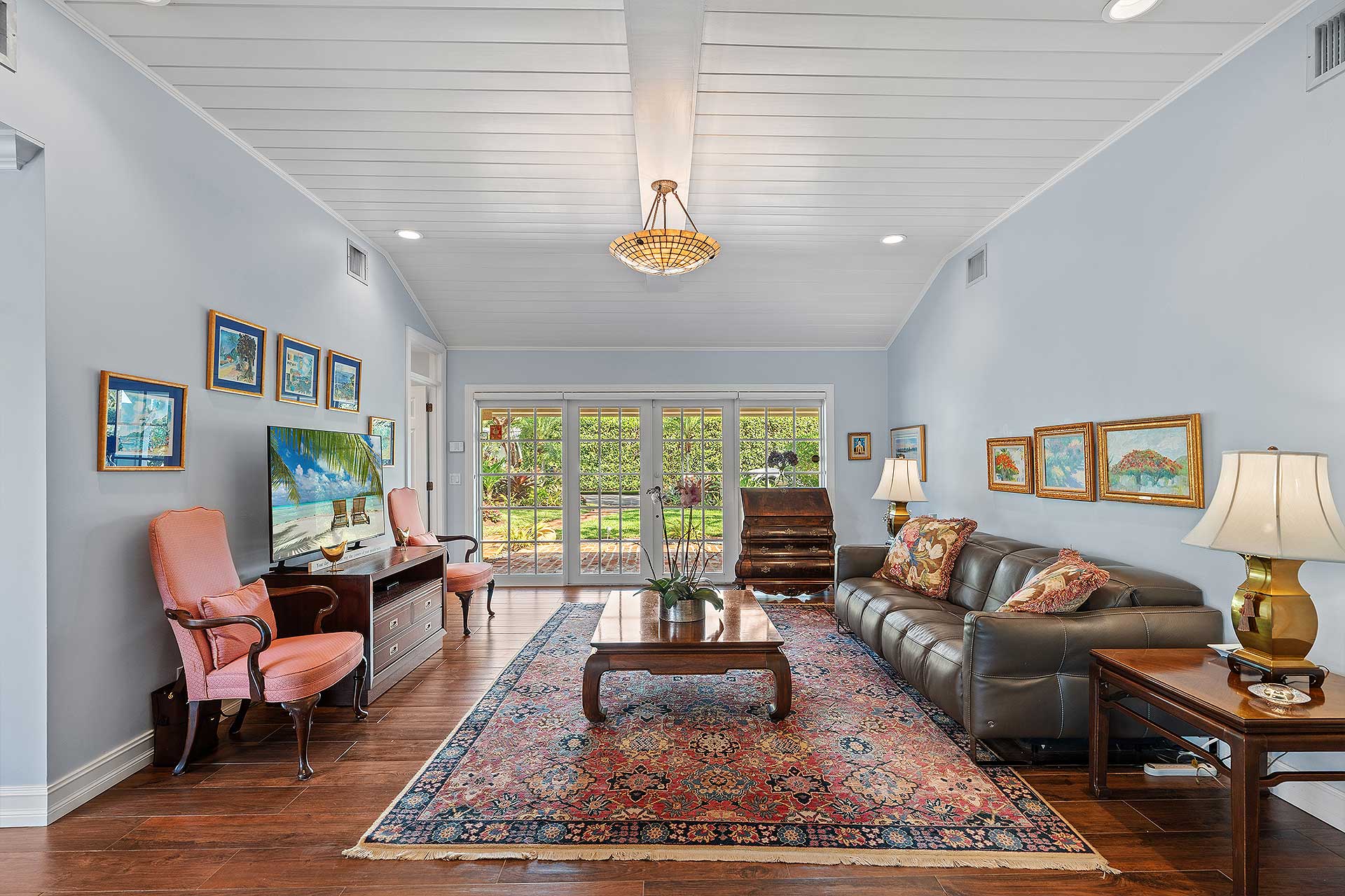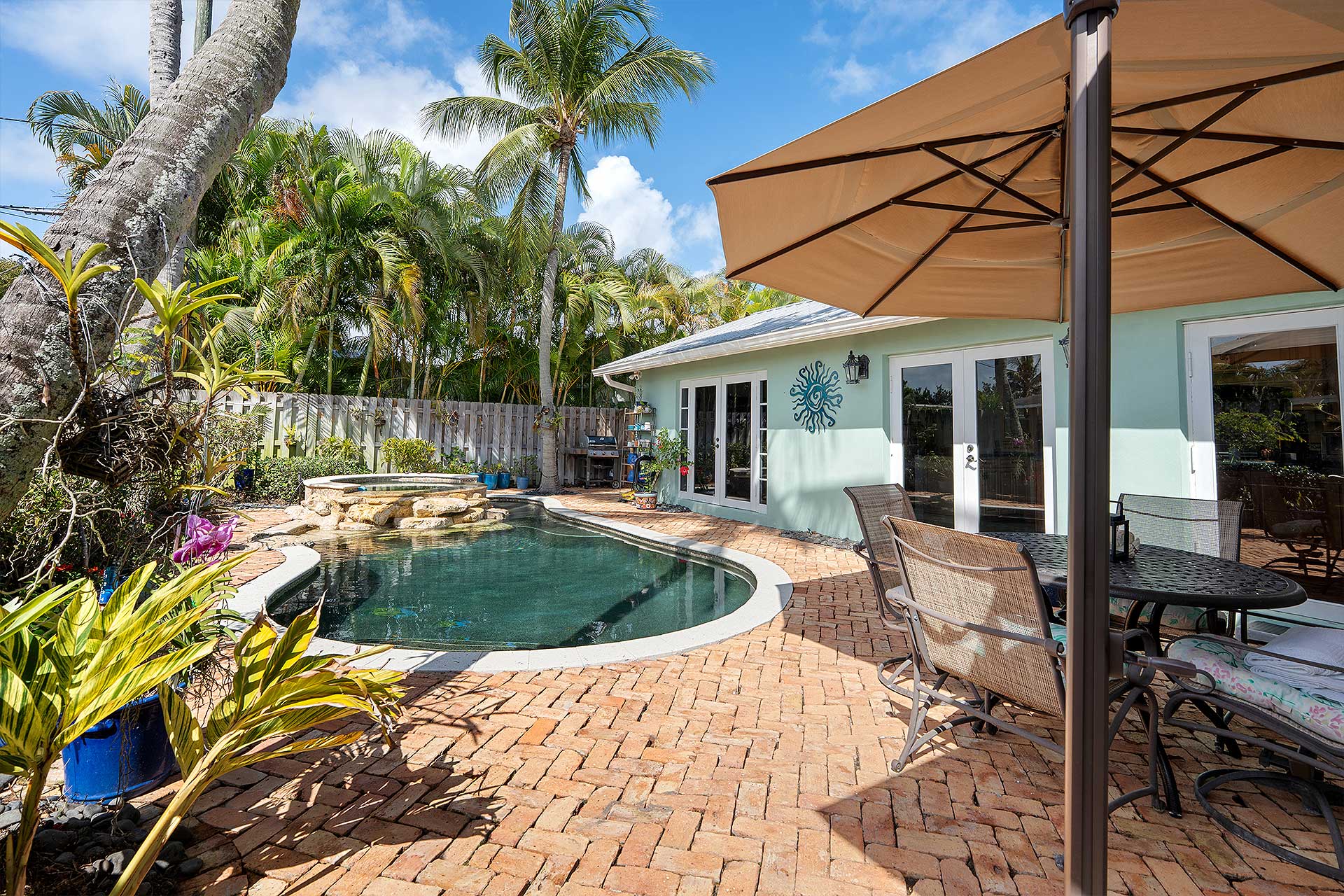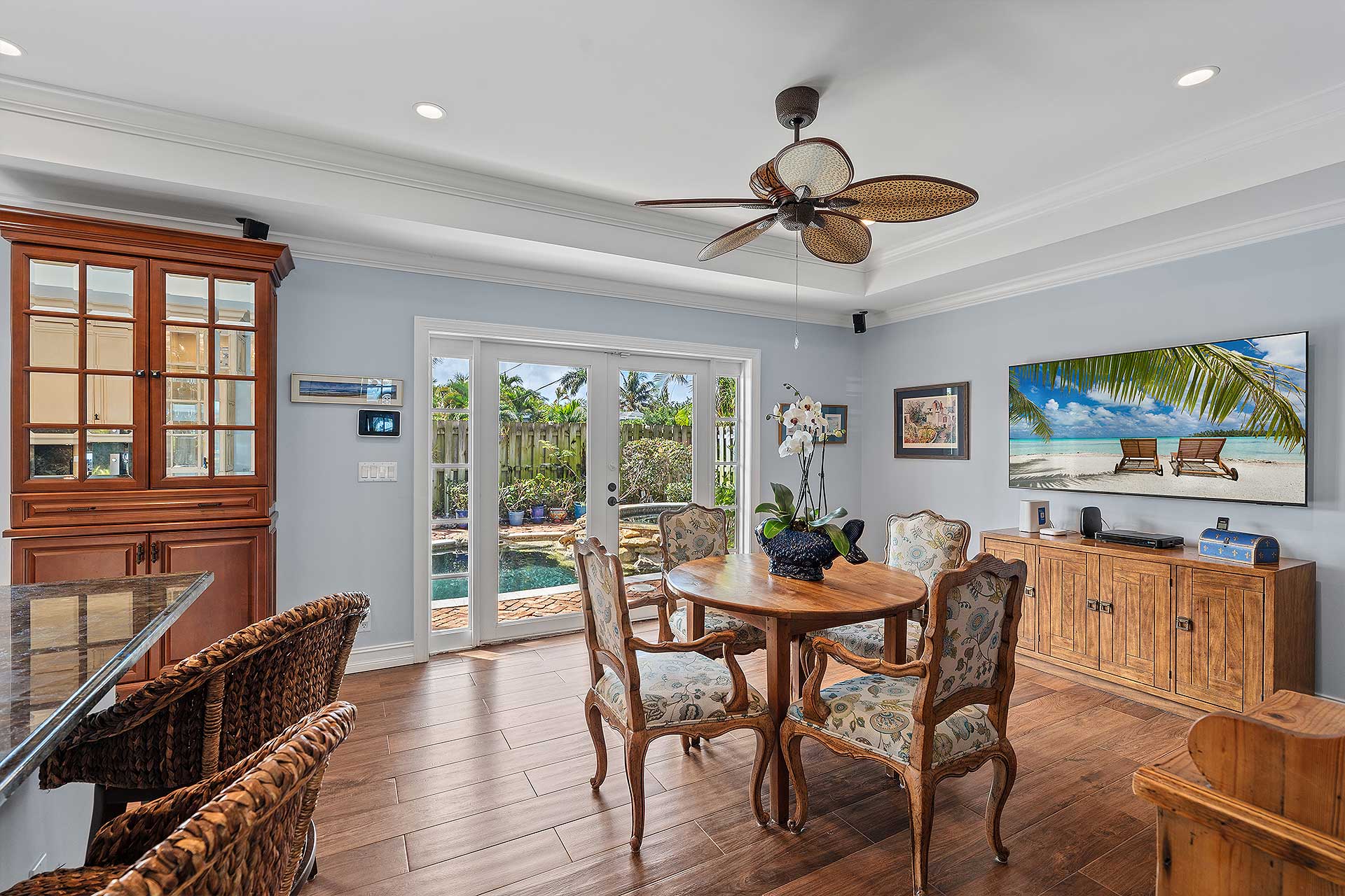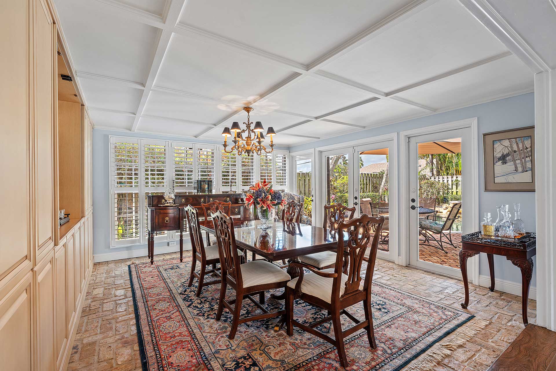 Ready for immediate enjoyment, this exquisitely renovated, freshly painted residence, with three bedrooms and 2,065± total square feet, defines tropical elegance with uncompromising upgrades and curated detailing. In the living room, French doors flanked by windows bring in abundant natural light, while the peaked ceiling adds volume and character. The formal sunken dining room is finished with a built-in bar and wall of cabinetry with banks of French doors that open to the pool terrace. The open-concept kitchen and adjoining family room/lounge also offer French doors to the pool terrace for seamless indoor/outdoor living. Fittings in the kitchen include a prep island with a sink, wood cabinetry including a built-in china cabinet and pantry, granite counters and premier appliances. The privately sited primary suite comprises custom-fitted closets, a dressing area and a tiled bathroom. Sharing a bathroom are two guest bedrooms, one with a built-in desk and bookcases, and the other with built-in closets and a dresser. Completing the layout are a powder room, laundry room and a new carport. Amenities include LED lighting, plantation shutters and Chicago brick, wood-look tile and bamboo flooring. Conveniences include a metal roof, a tankless hot-water heater, a propane gas tank and impact windows and doors.