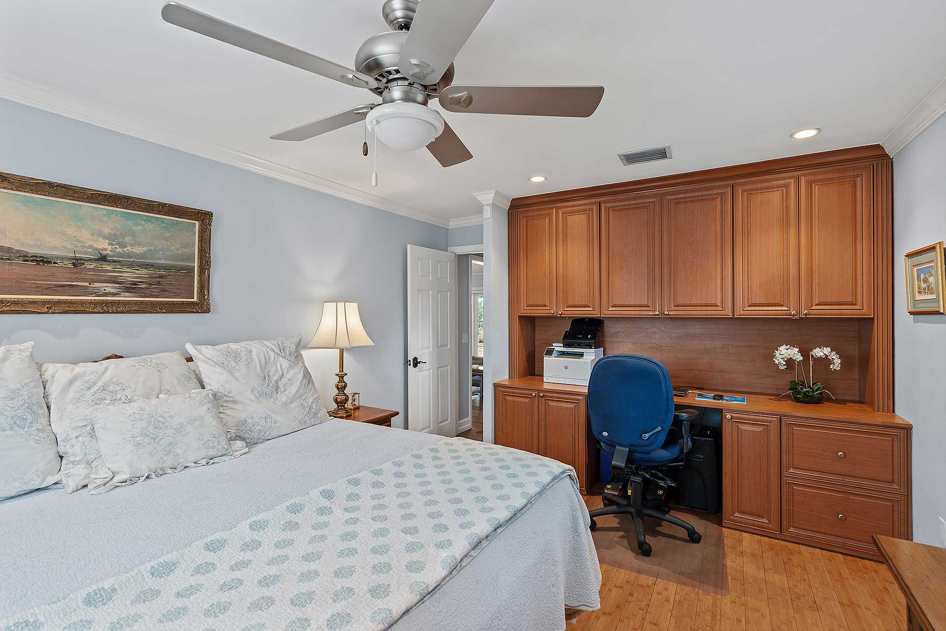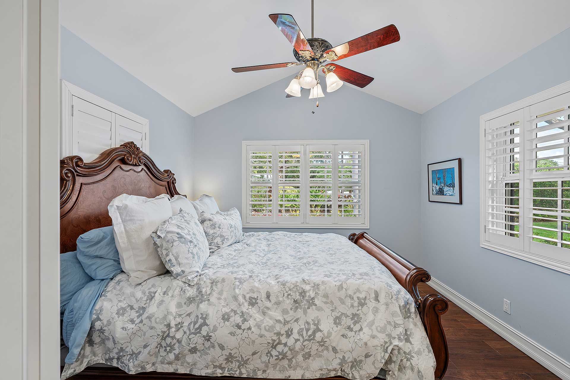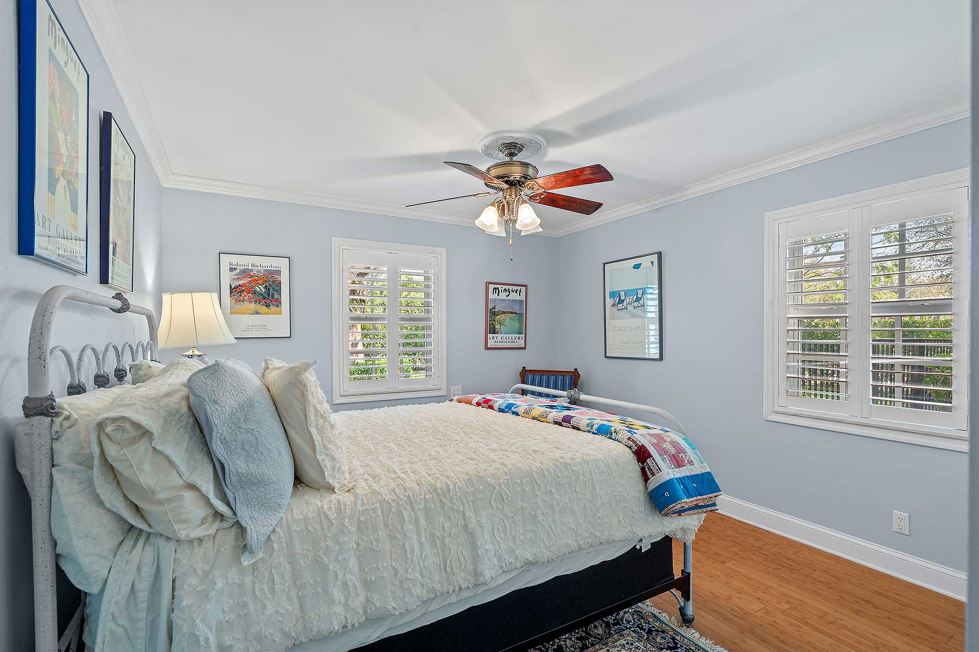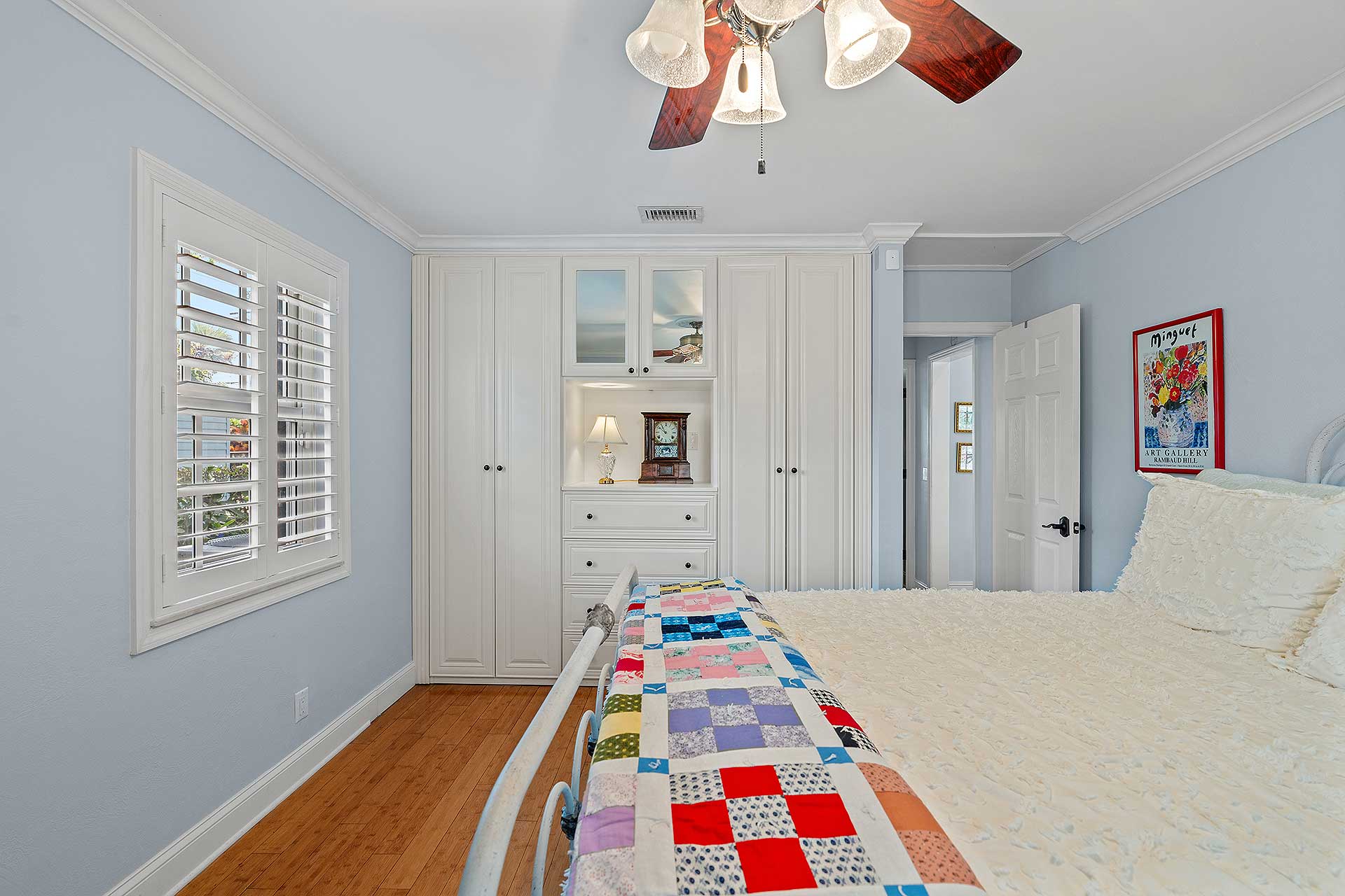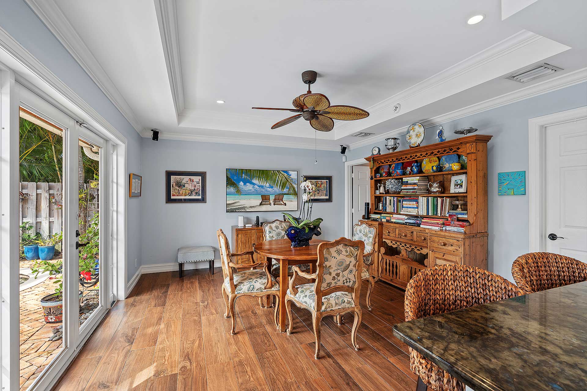 Ready for immediate enjoyment, this exquisitely renovated, freshly painted residence, with three bedrooms and 2,065± total square feet, defines tropical elegance with uncompromising upgrades and curated detailing. In the living room, French doors flanked by windows bring in abundant natural light, while the peaked ceiling adds volume and character. The formal sunken dining room is finished with a built-in bar and wall of cabinetry with banks of French doors that open to the pool terrace. The open-concept kitchen and adjoining family room/lounge also offer French doors to the pool terrace for seamless indoor/outdoor living. Fittings in the kitchen include a prep island with a sink, wood cabinetry including a built-in china cabinet and pantry, granite counters and premier appliances. The privately sited primary suite comprises custom-fitted closets, a dressing area and a tiled bathroom. Sharing a bathroom are two guest bedrooms, one with a built-in desk and bookcases, and the other with built-in closets and a dresser. Completing the layout are a powder room, laundry room and a new carport. Amenities include LED lighting, plantation shutters and Chicago brick, wood-look tile and bamboo flooring. Conveniences include a metal roof, a tankless hot-water heater, a propane gas tank and impact windows and doors.