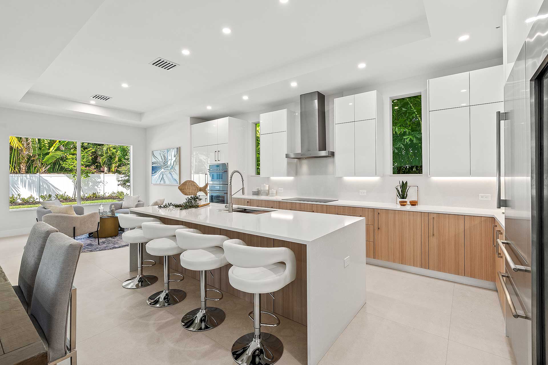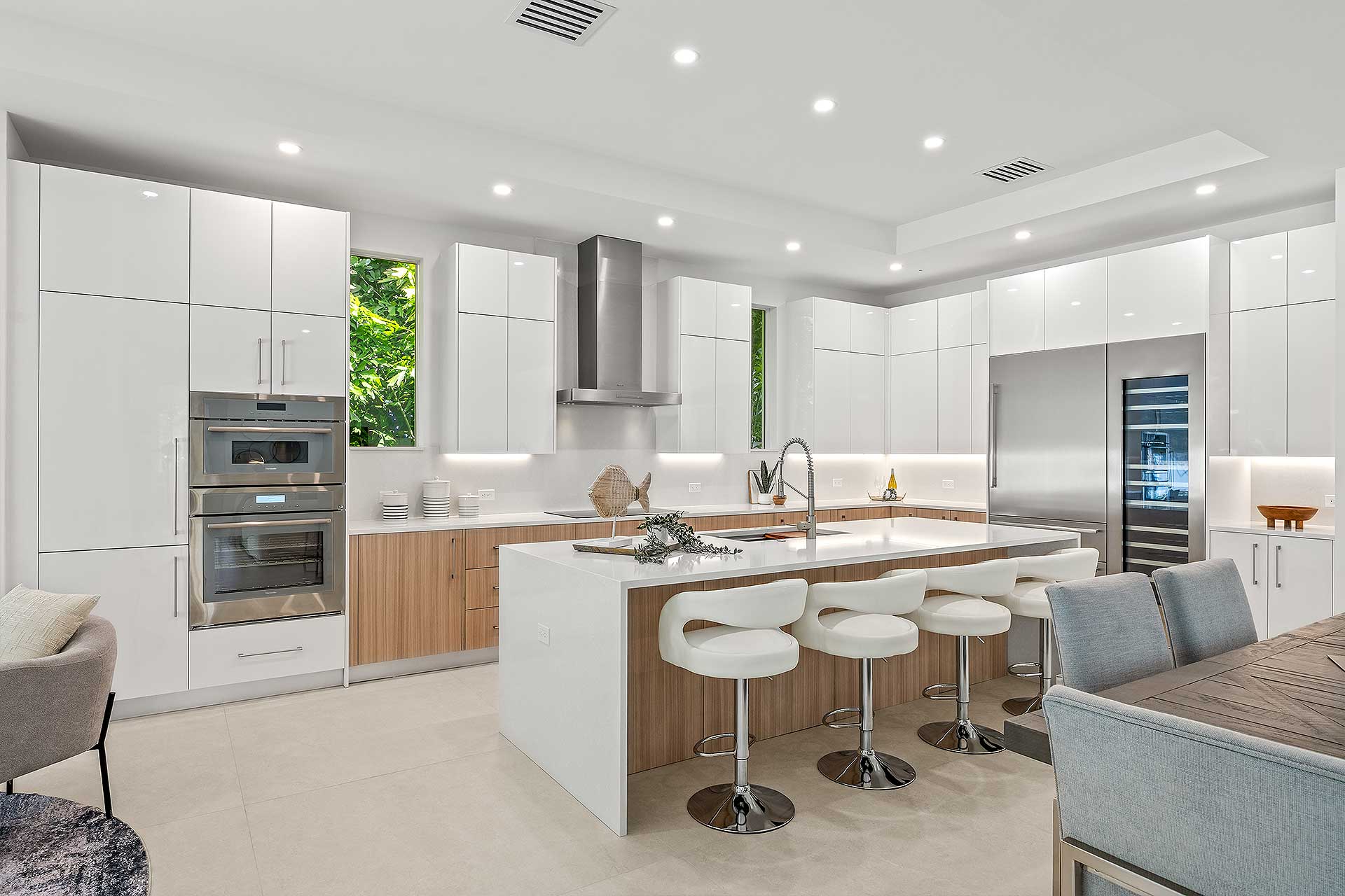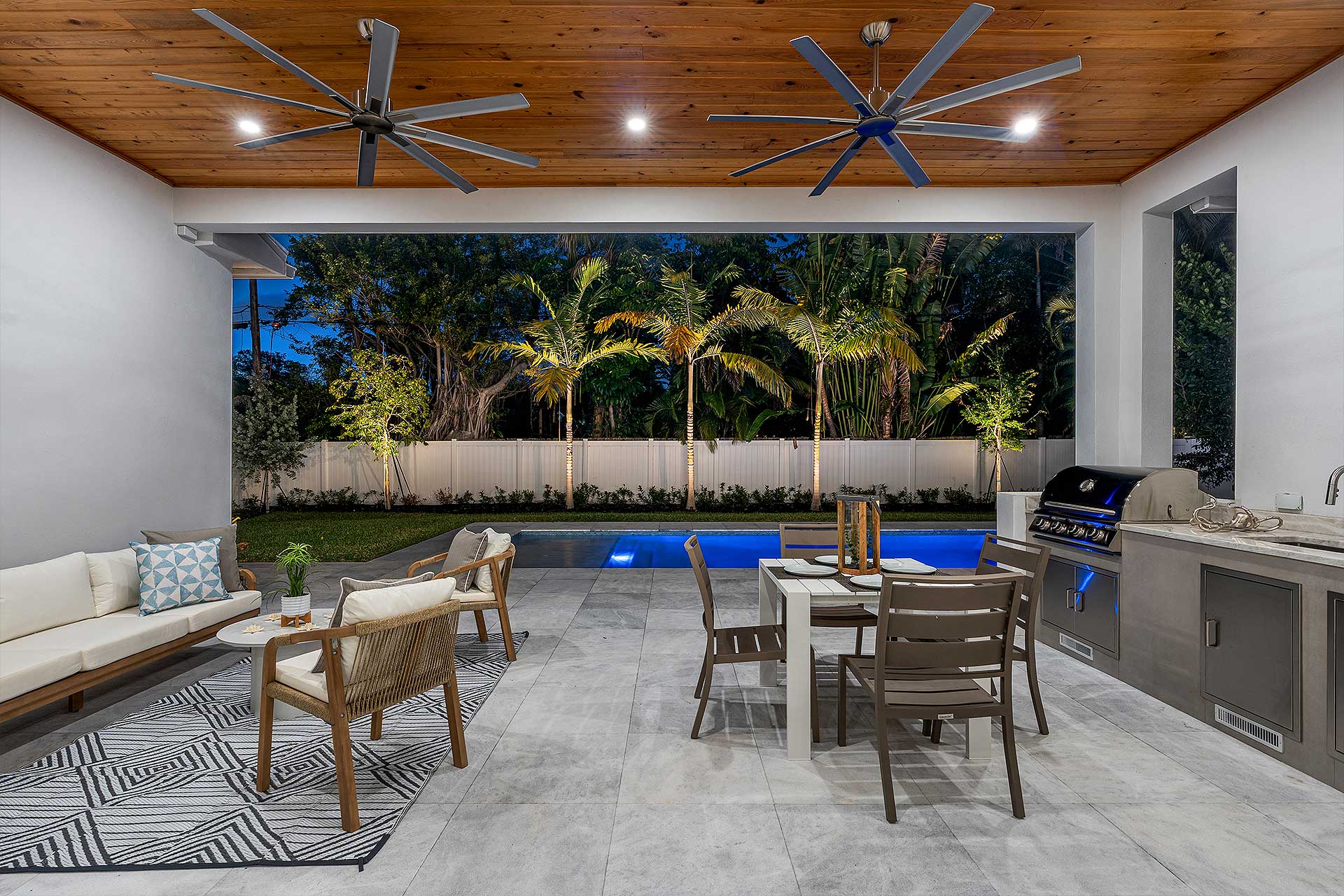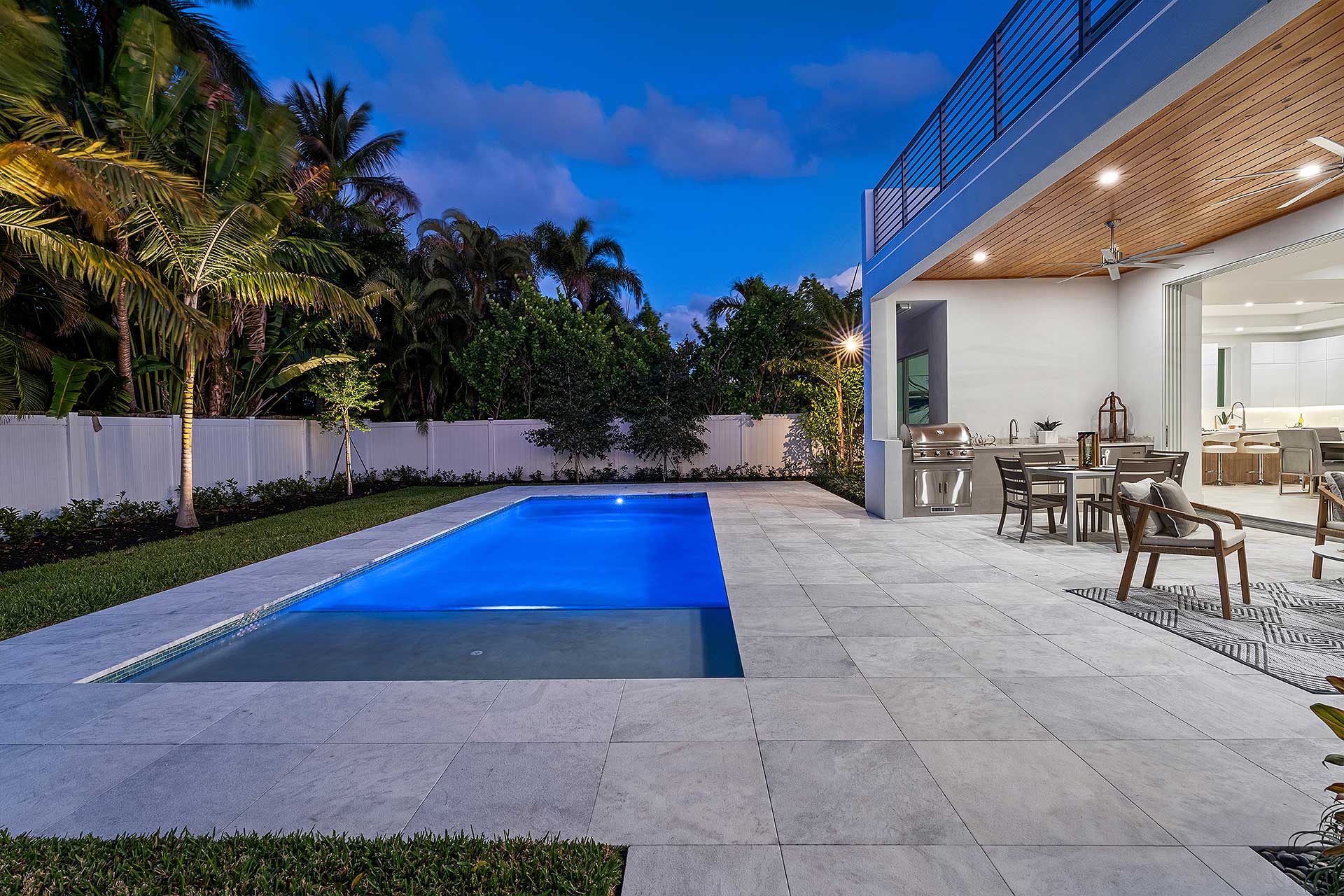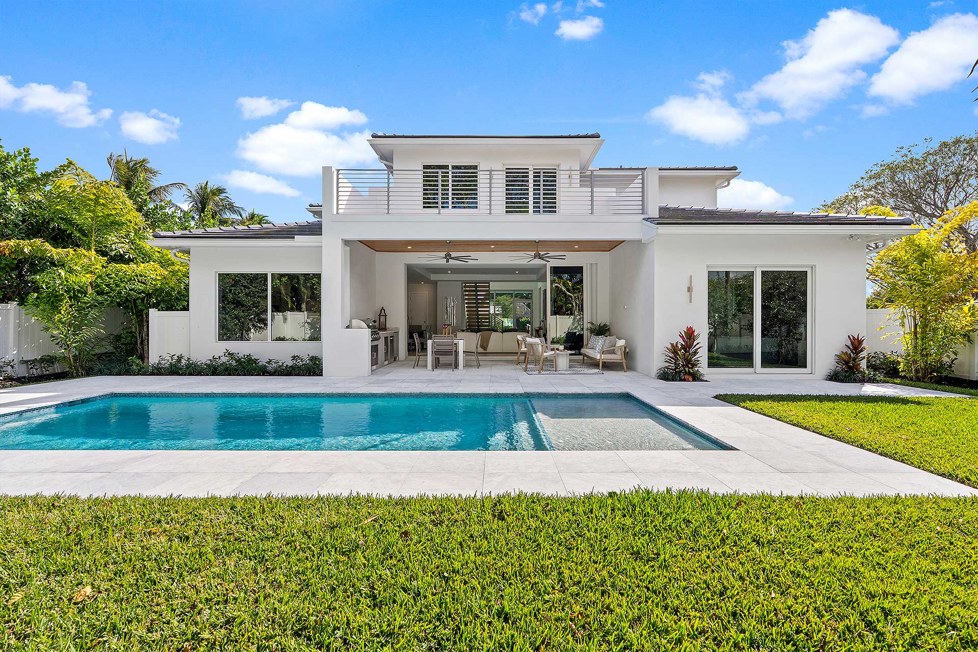 At this modern masterpiece on a tropically landscaped parcel shaded by mature trees, enjoy outdoor living on the pool loggia with a summer kitchen, fitted with a BBQ, sink, refrigerator and pull-out bin. Ideal for South Florida’s sun-and-sea days, return from the beach, rinse off under the outdoor shower, then lounge and relax by the saltwater pool before preparing an impromptu feast in the summer kitchen while dining under the stars.