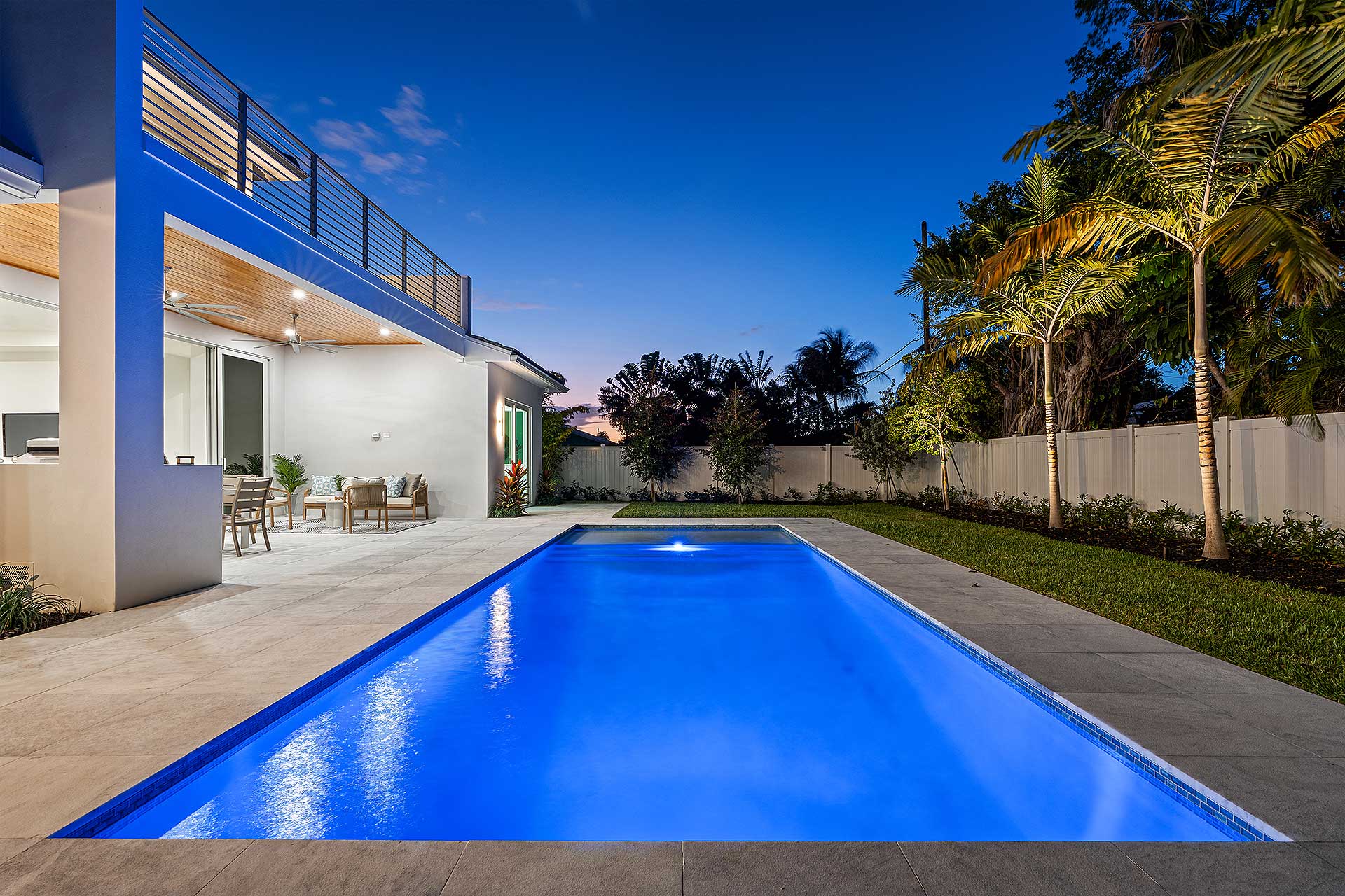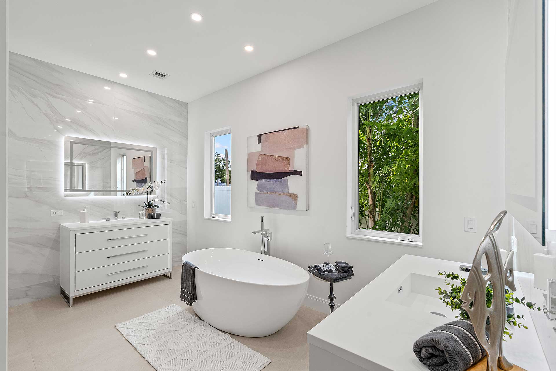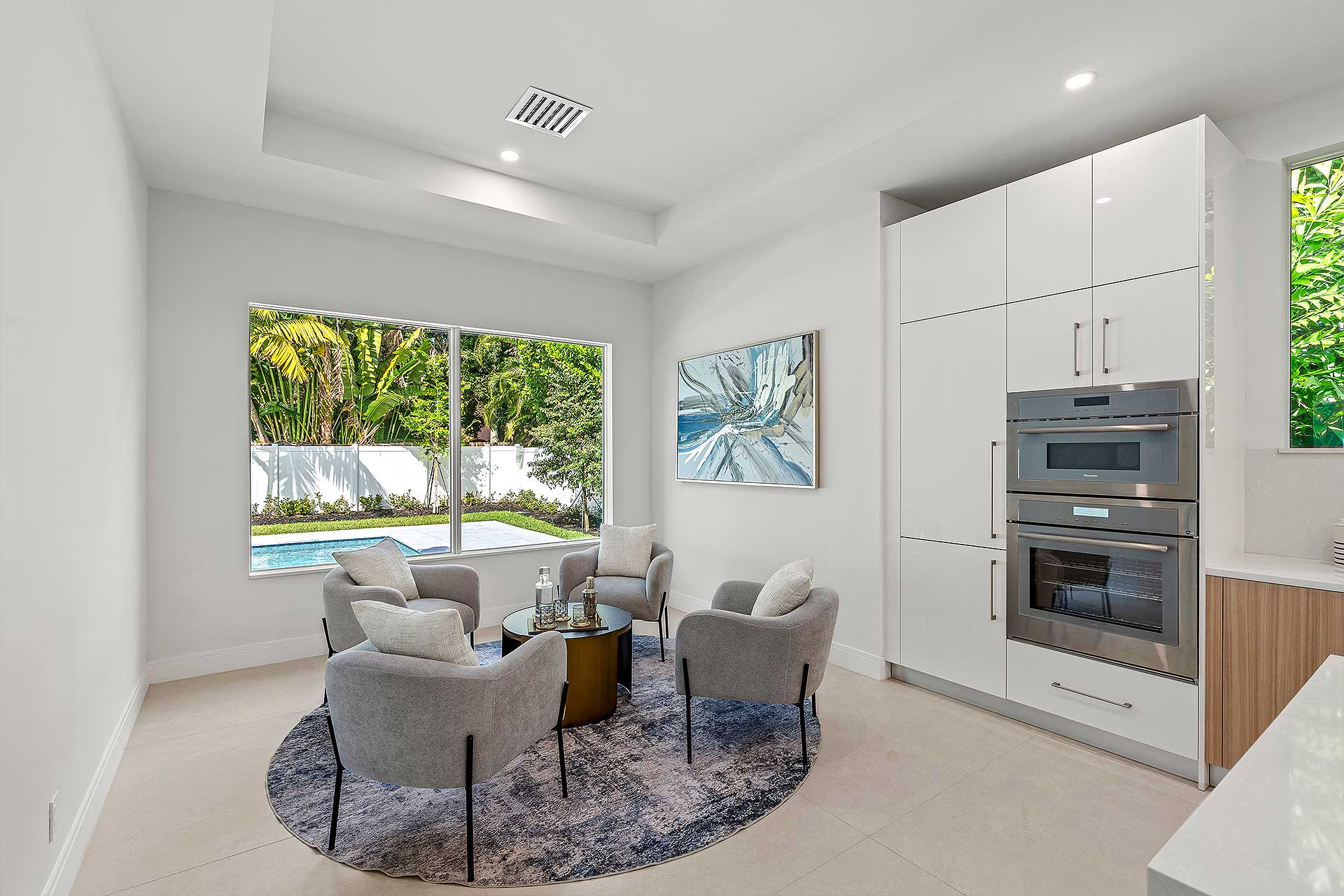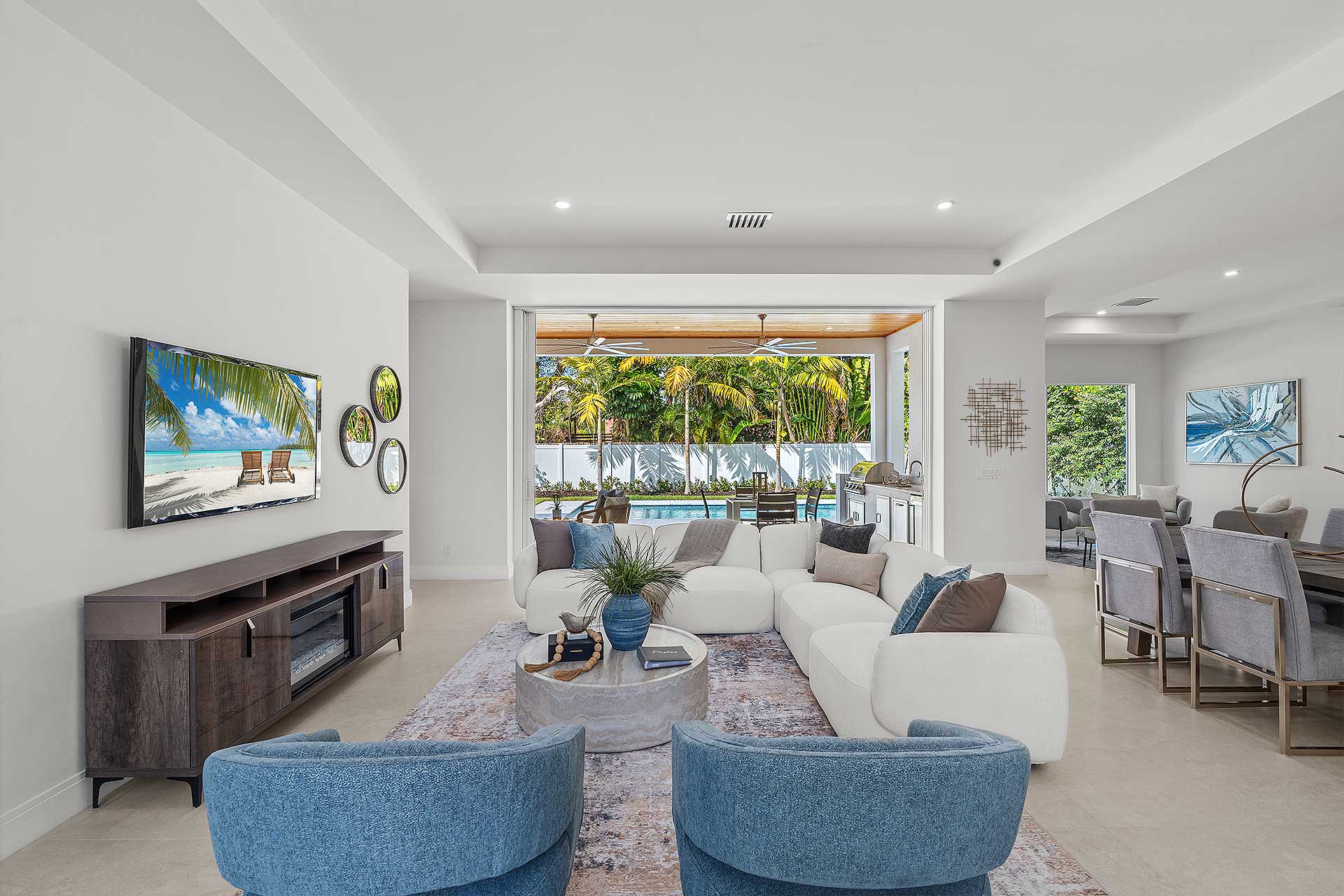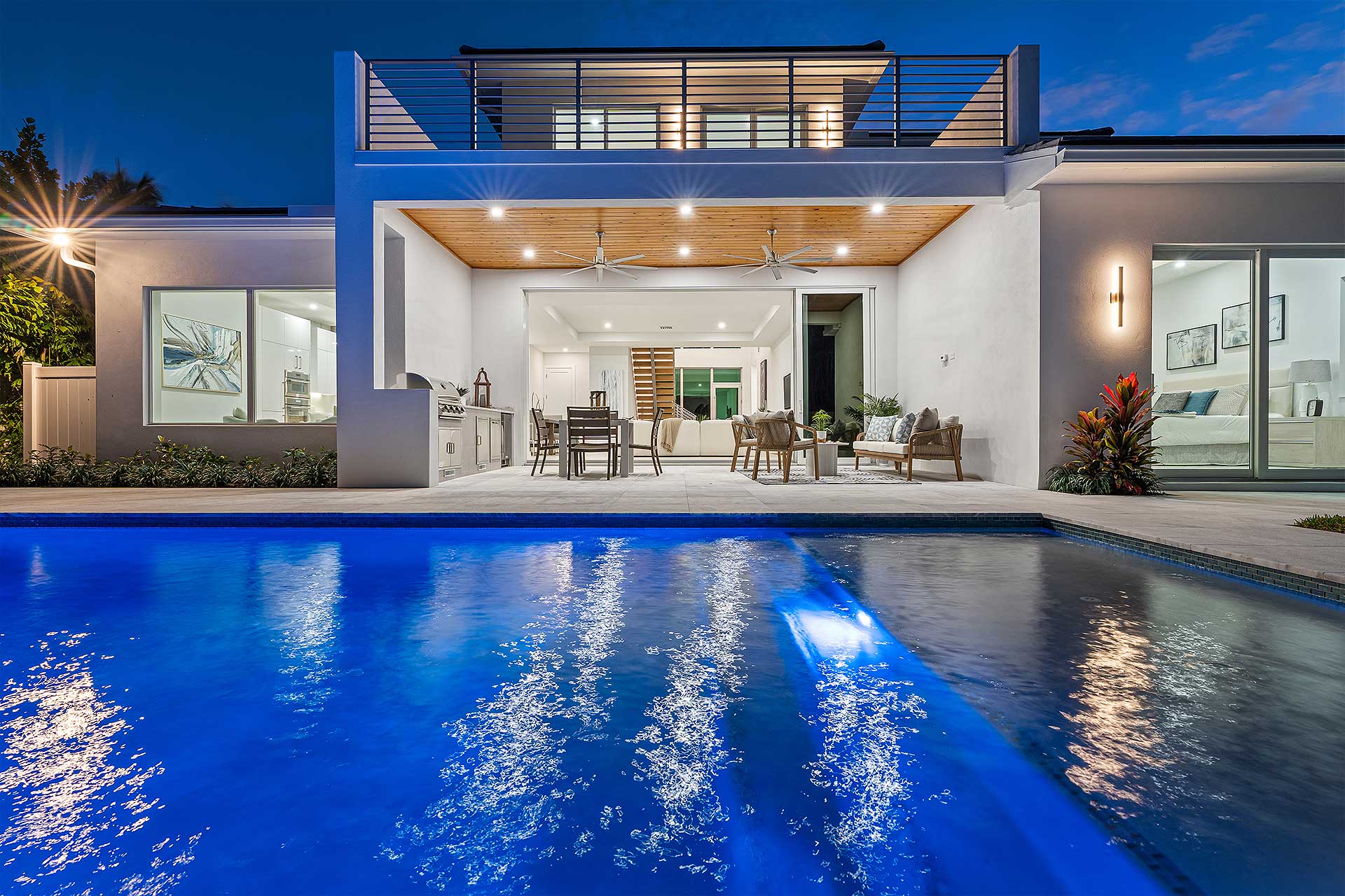 At this modern masterpiece on a tropically landscaped parcel shaded by mature trees, enjoy outdoor living on the pool loggia with a summer kitchen, fitted with a BBQ, sink, refrigerator and pull-out bin. Ideal for South Florida’s sun-and-sea days, return from the beach, rinse off under the outdoor shower, then lounge and relax by the saltwater pool before preparing an impromptu feast in the summer kitchen while dining under the stars.