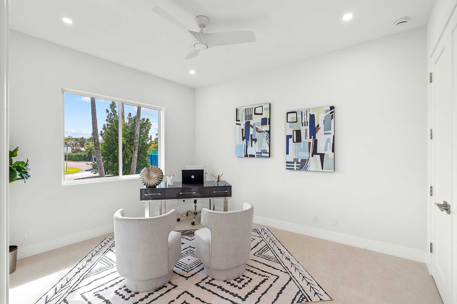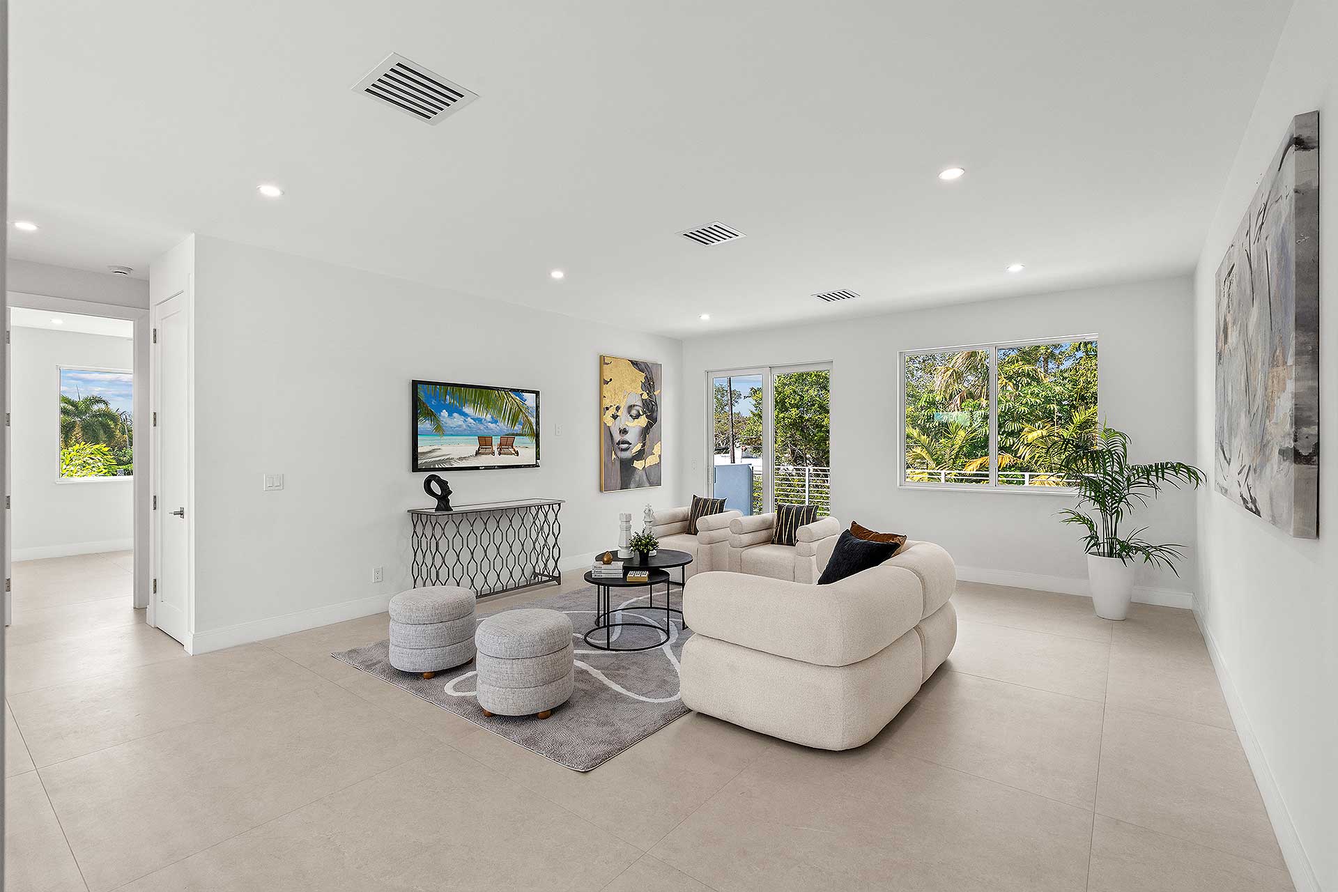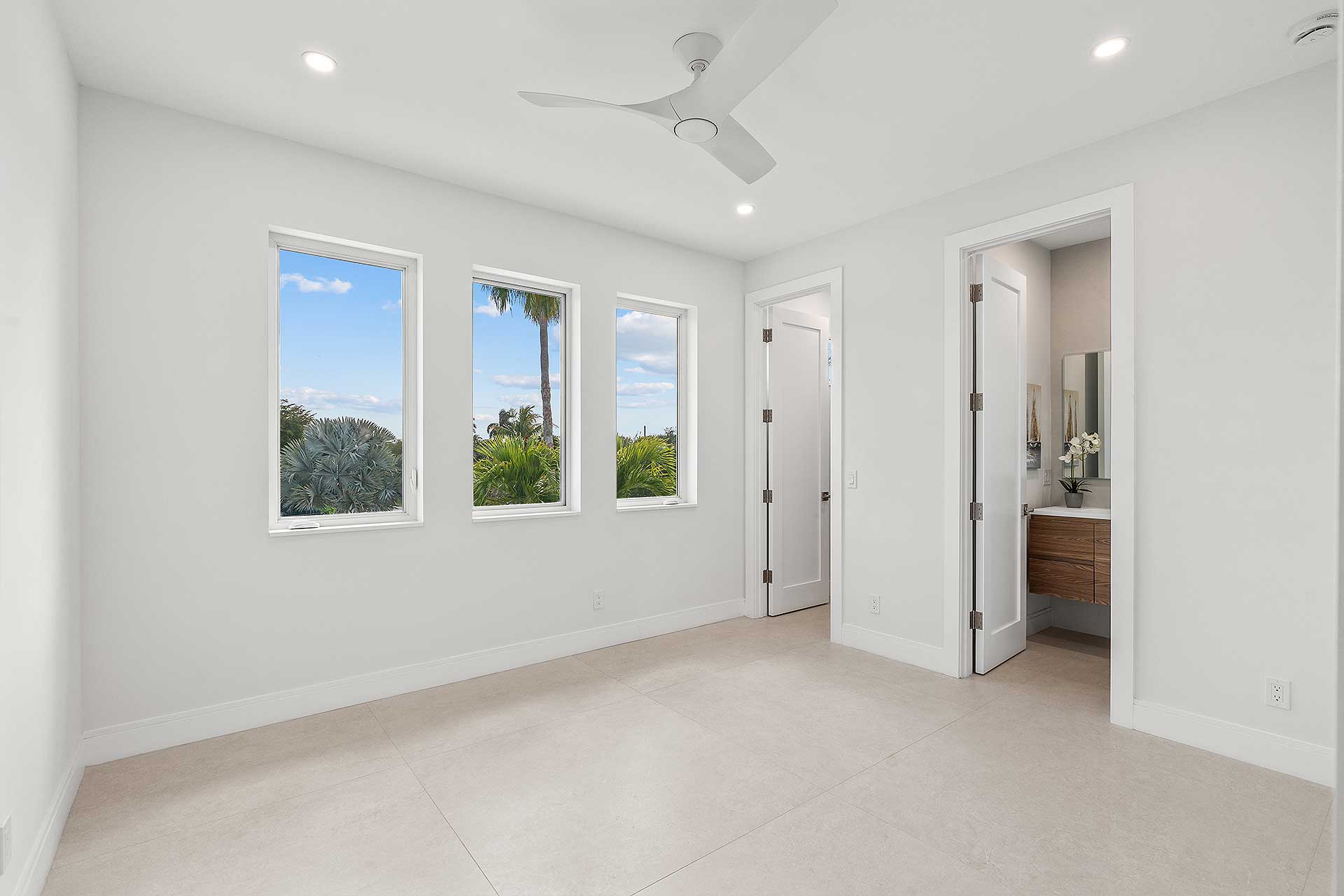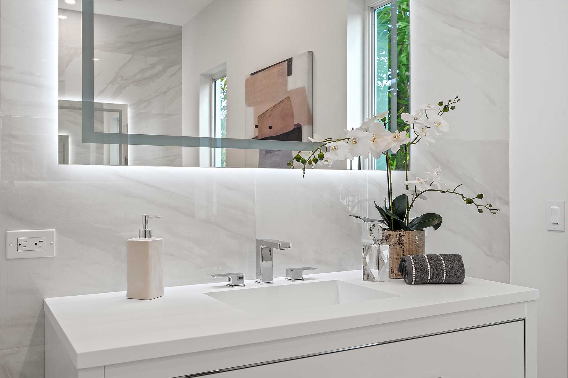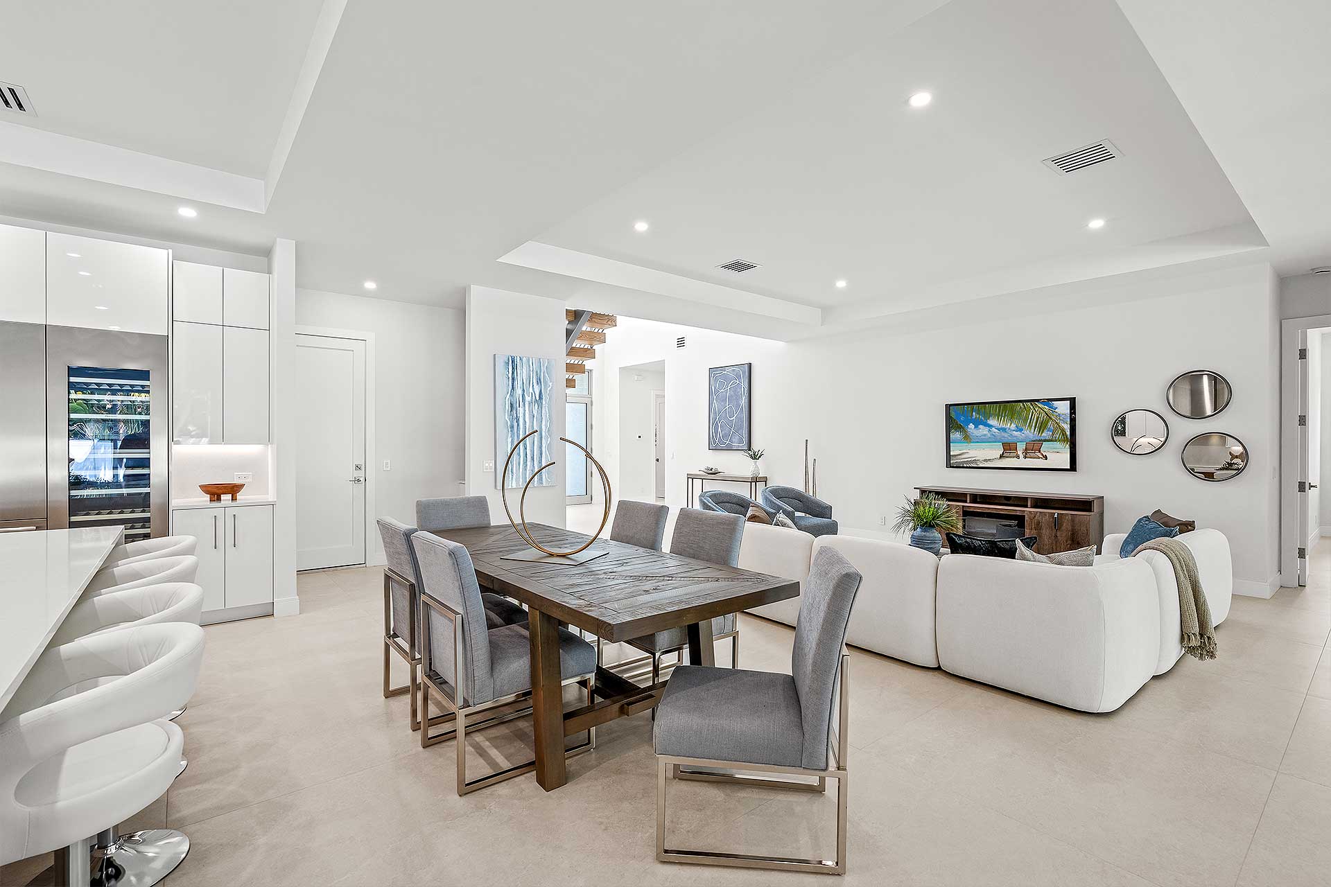 At this modern masterpiece on a tropically landscaped parcel shaded by mature trees, enjoy outdoor living on the pool loggia with a summer kitchen, fitted with a BBQ, sink, refrigerator and pull-out bin. Ideal for South Florida’s sun-and-sea days, return from the beach, rinse off under the outdoor shower, then lounge and relax by the saltwater pool before preparing an impromptu feast in the summer kitchen while dining under the stars.