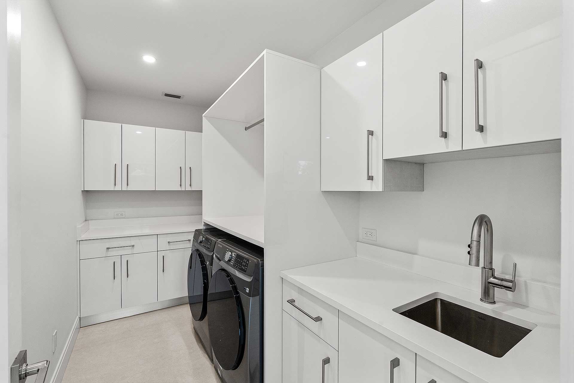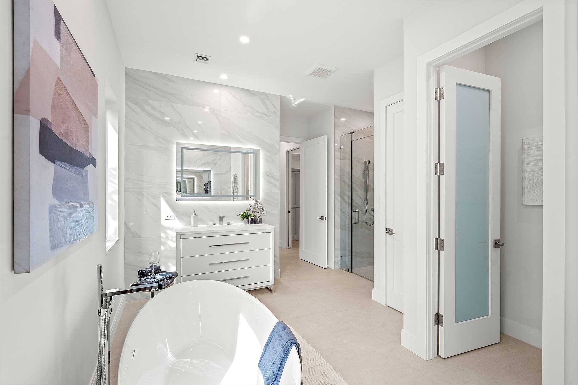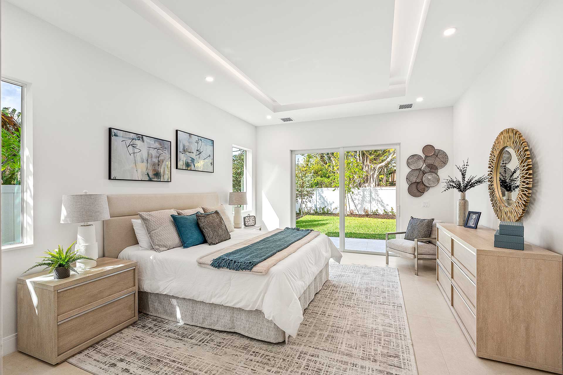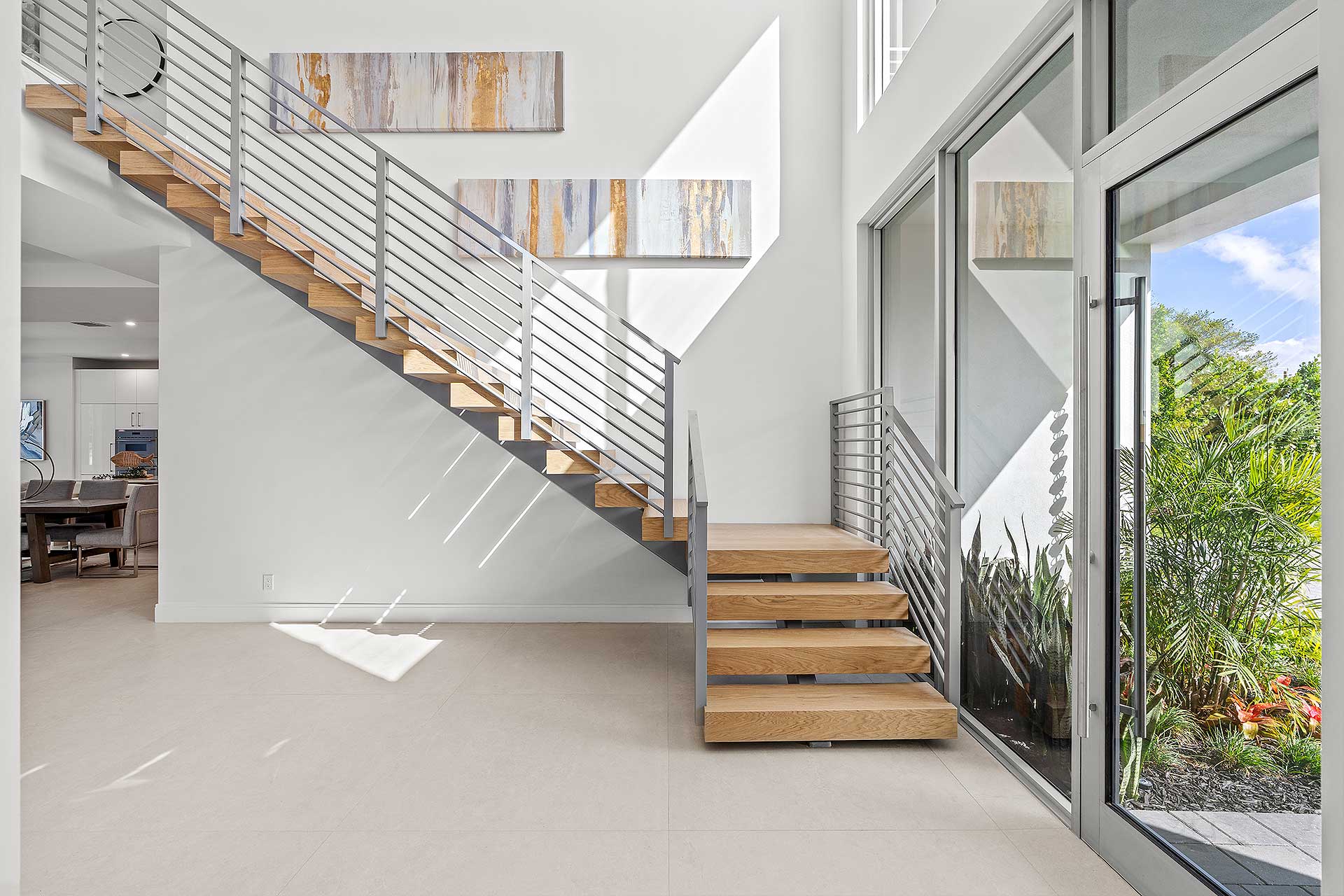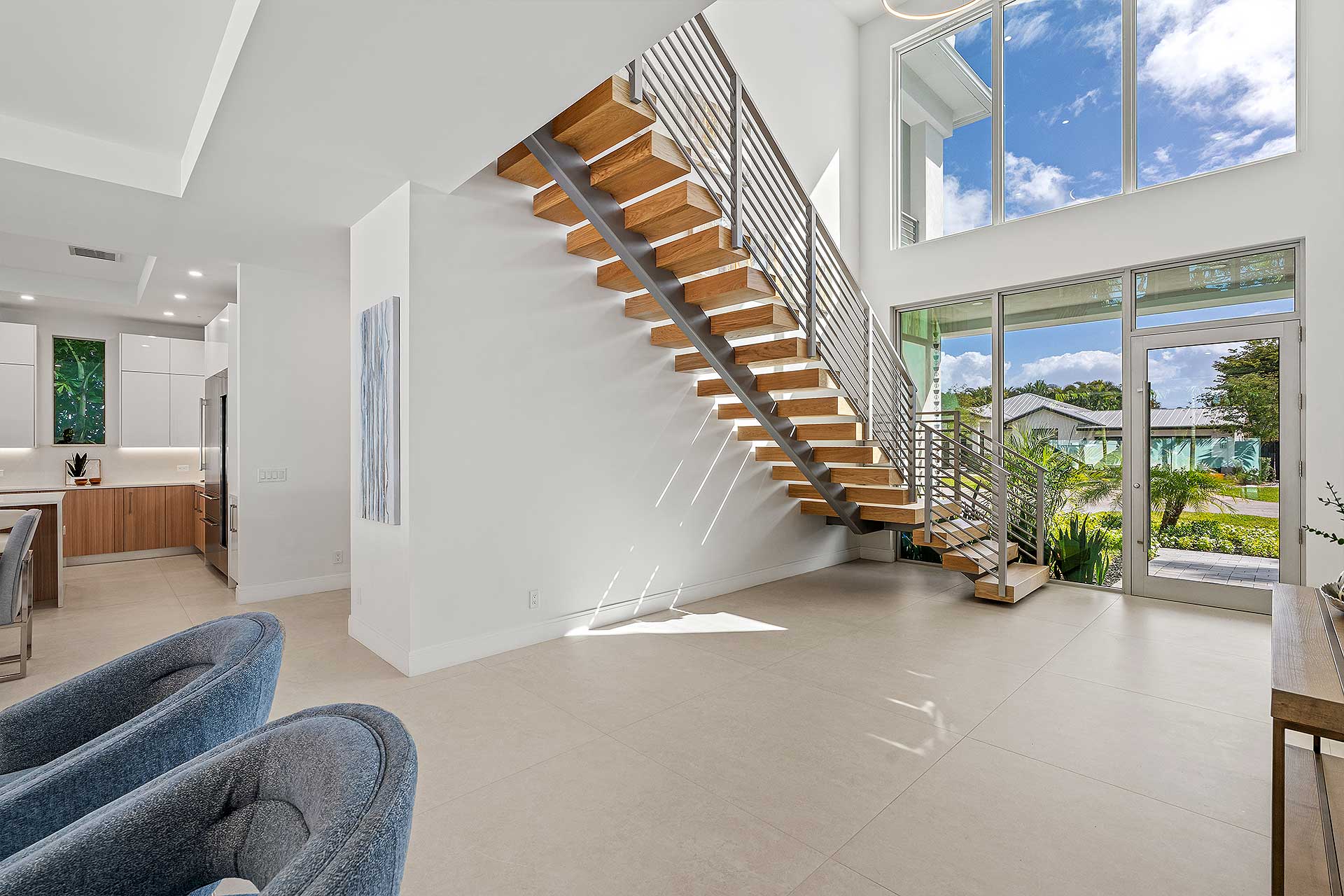 At this modern masterpiece on a tropically landscaped parcel shaded by mature trees, enjoy outdoor living on the pool loggia with a summer kitchen, fitted with a BBQ, sink, refrigerator and pull-out bin. Ideal for South Florida’s sun-and-sea days, return from the beach, rinse off under the outdoor shower, then lounge and relax by the saltwater pool before preparing an impromptu feast in the summer kitchen while dining under the stars.