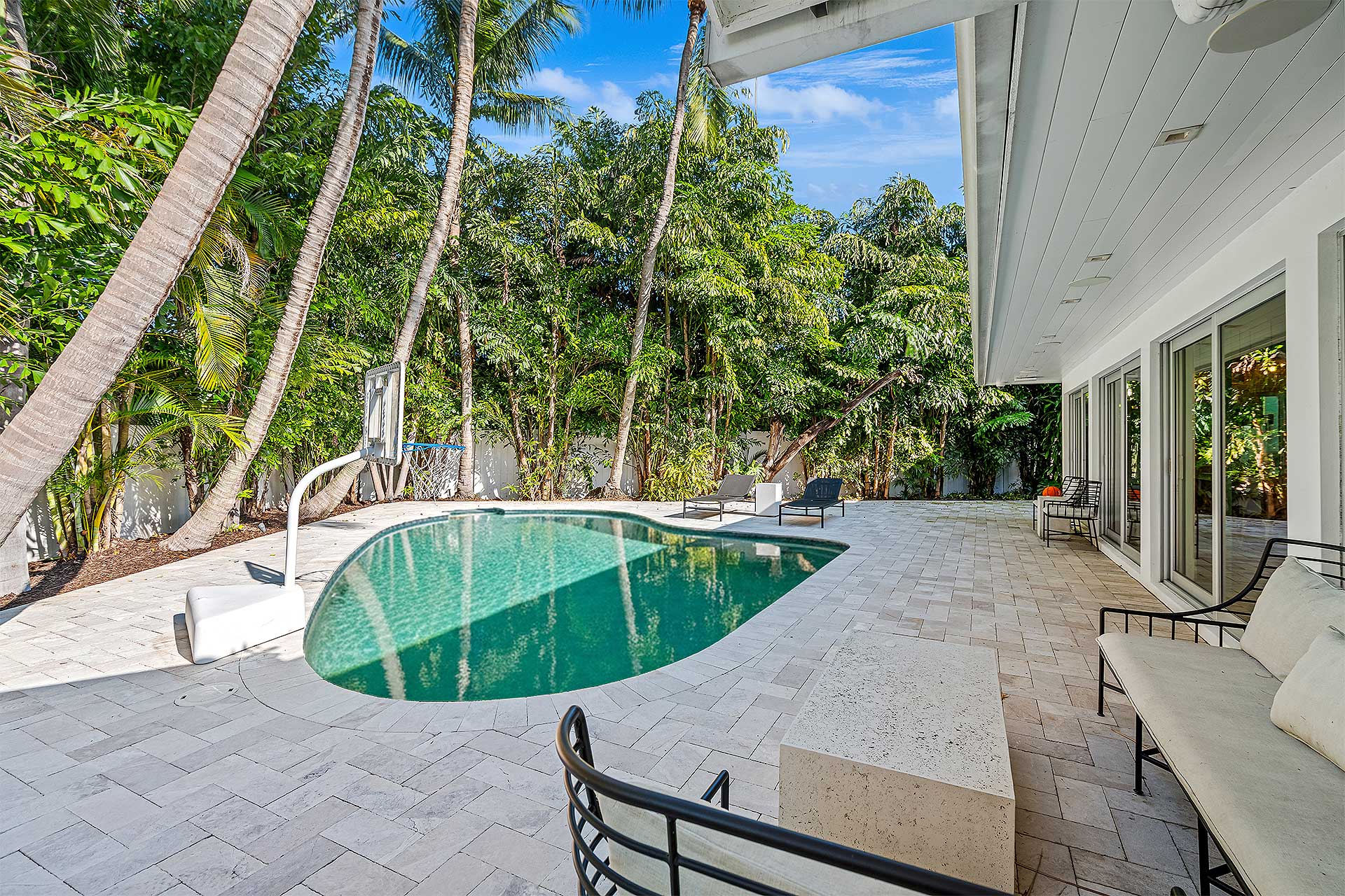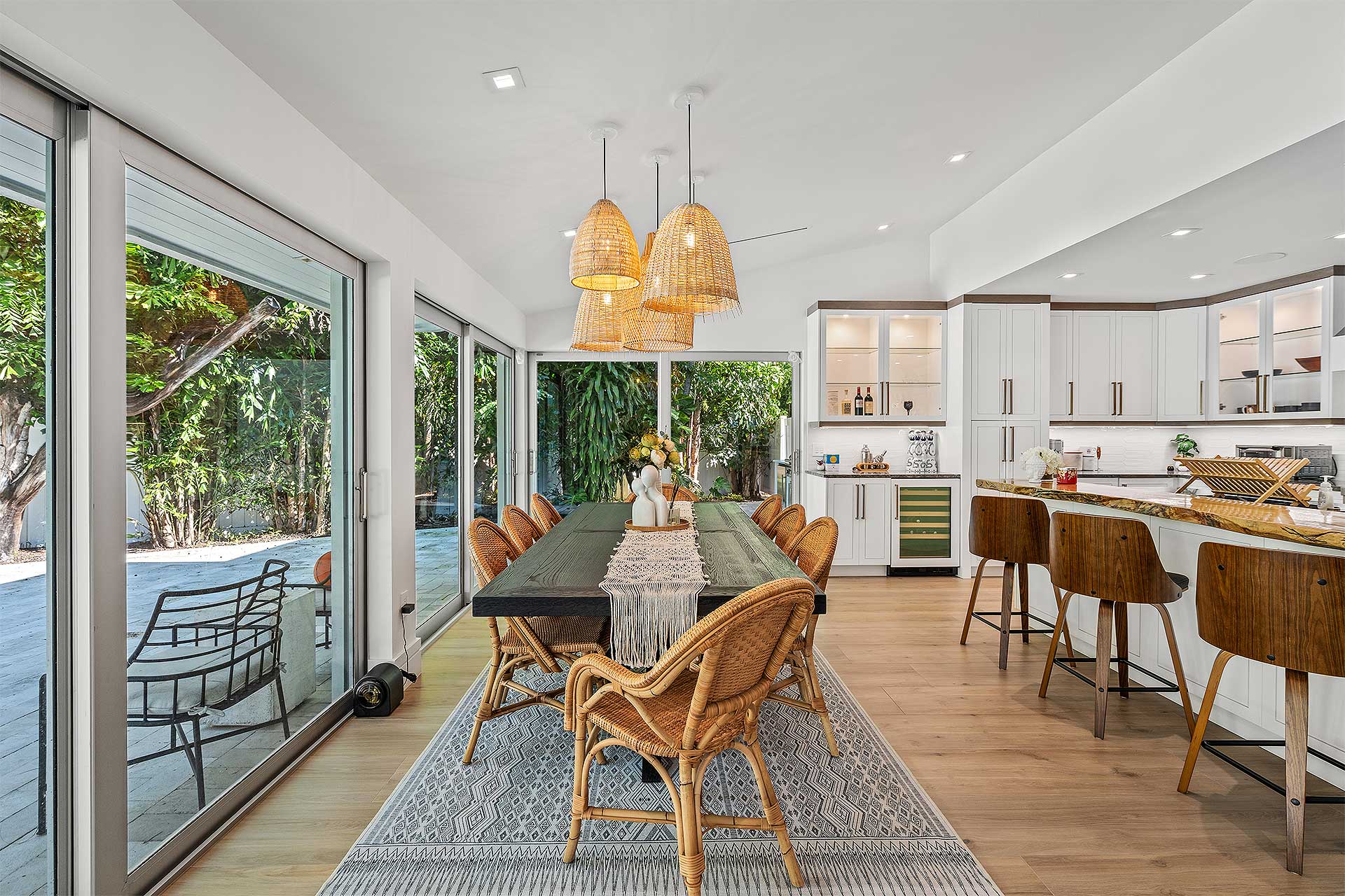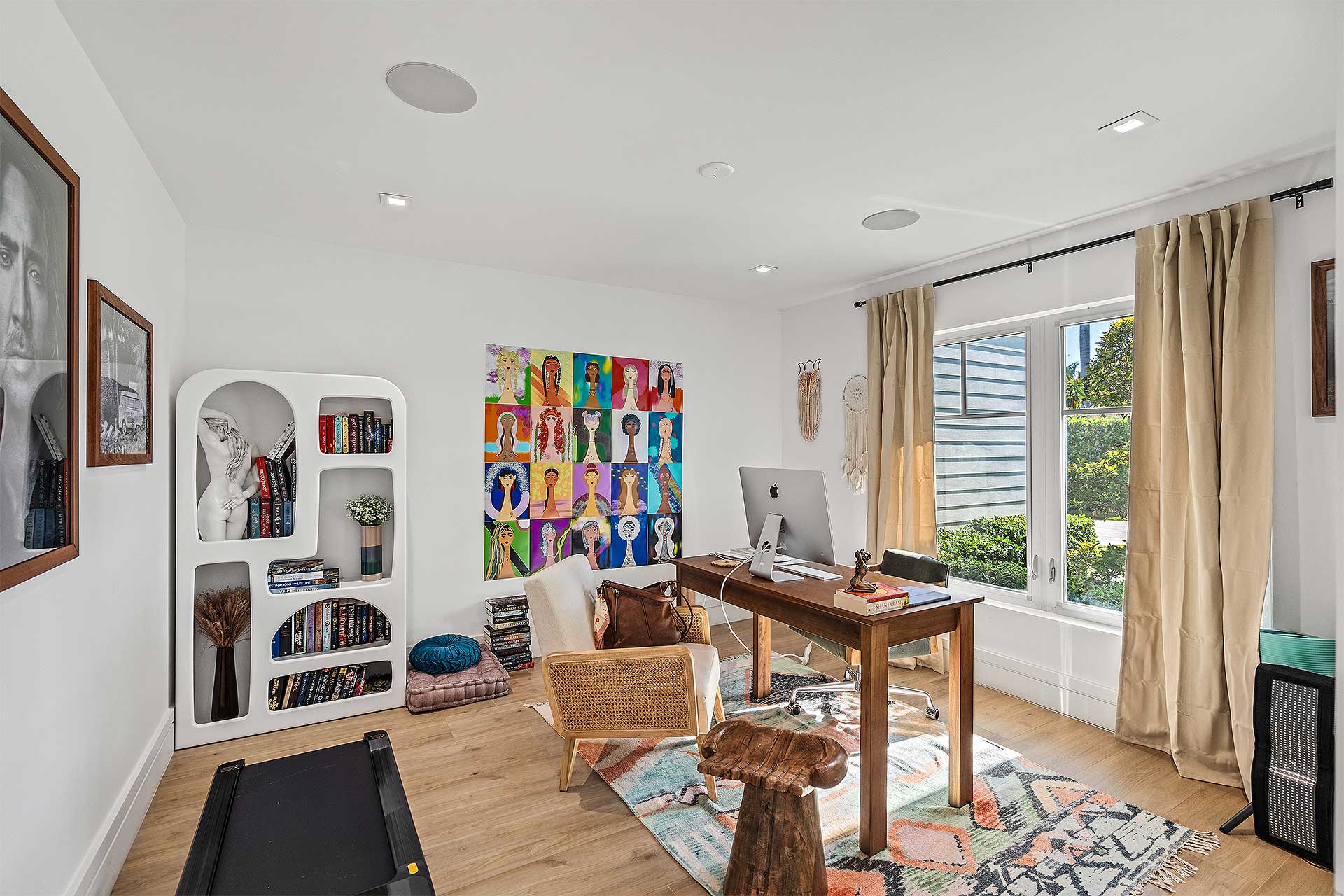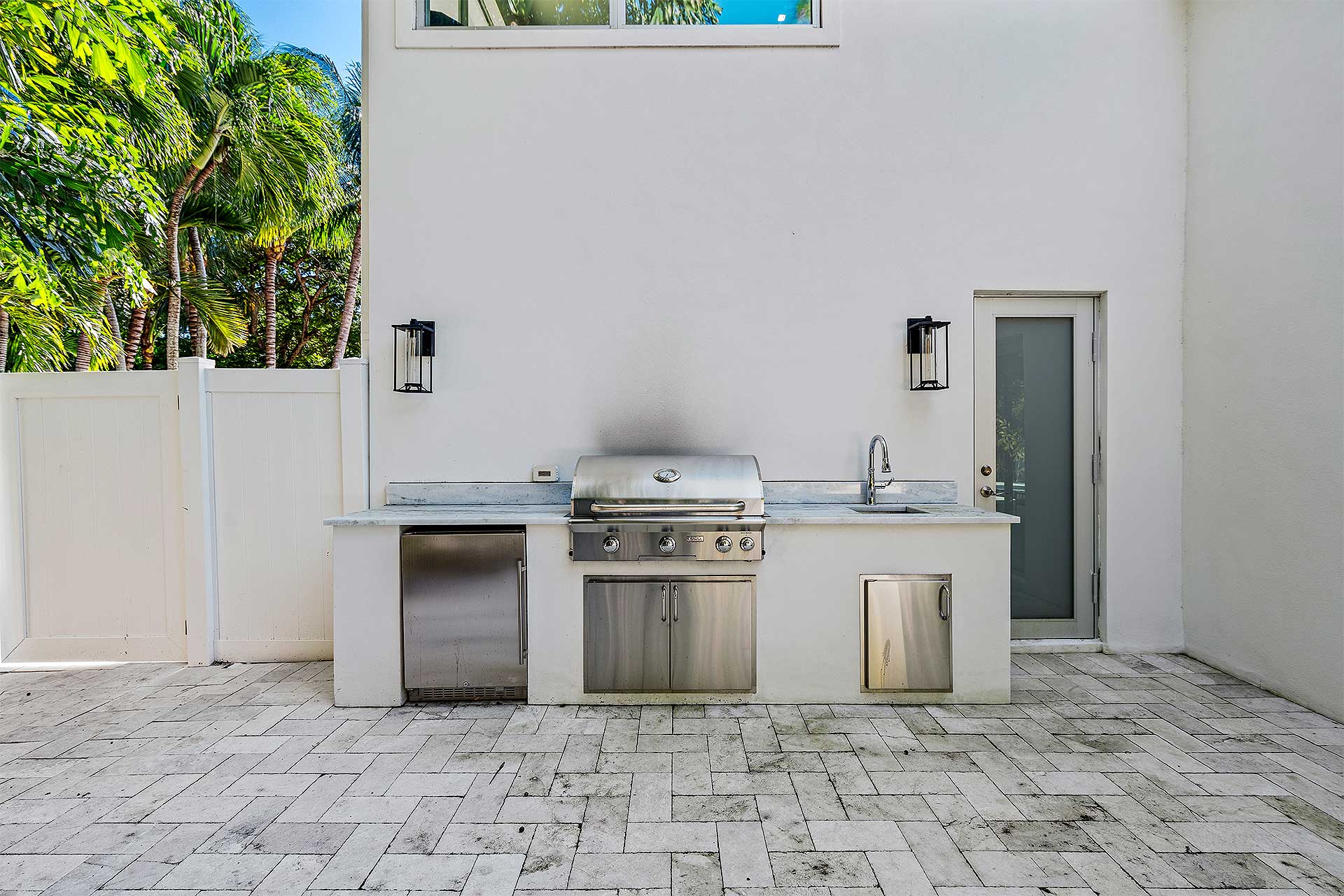 Secluded at the end of a cul-de-sac, this contemporary haven offers both privacy and a refined sense of place. In the lushly landscaped walled backyard oasis, the sun-splashed pool is set within a stone-paver patio, while enhancing opportunities for outdoor living, the fully equipped summer kitchen, with a grill and a refrigerator, invites alfresco gatherings.