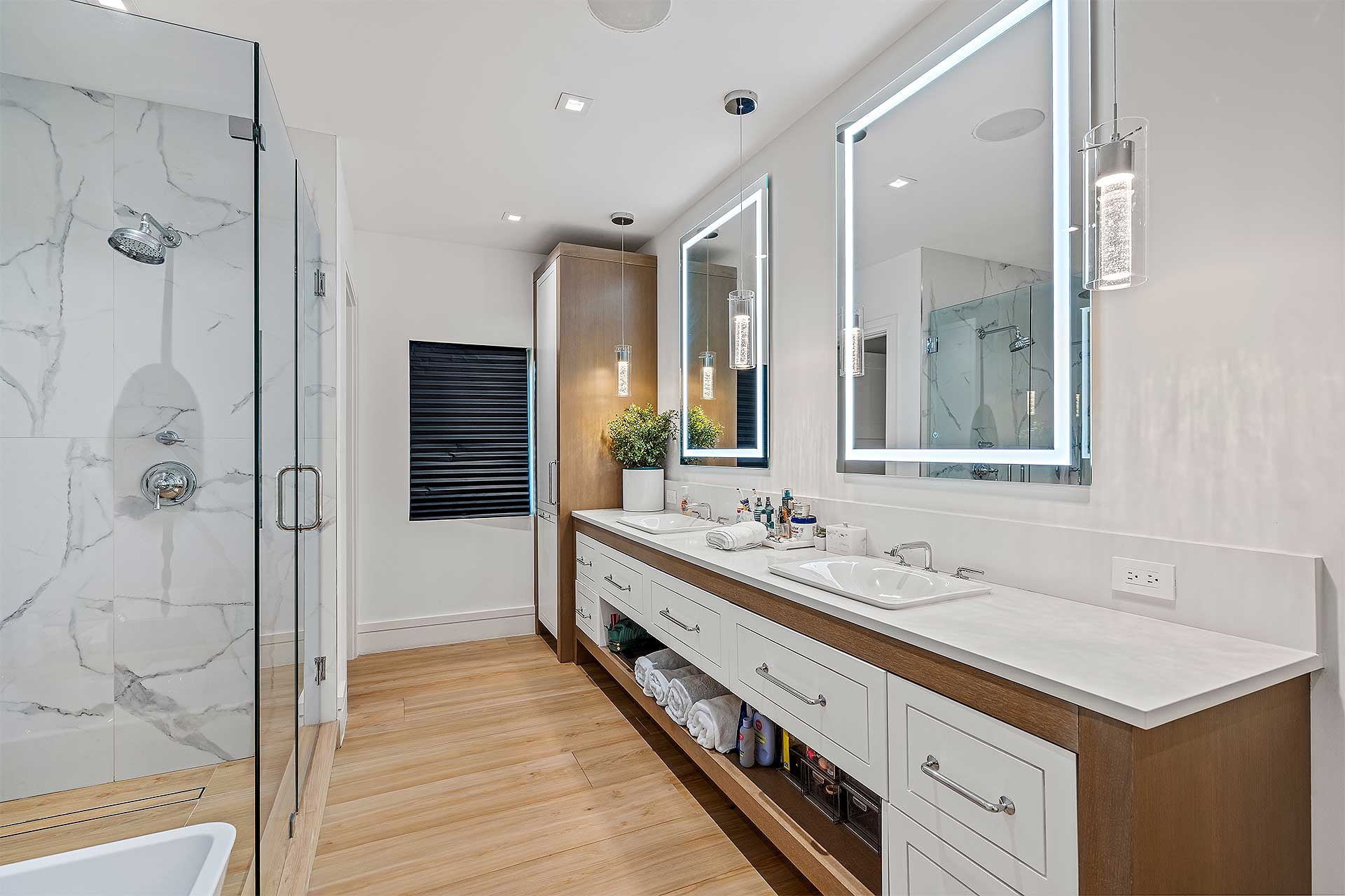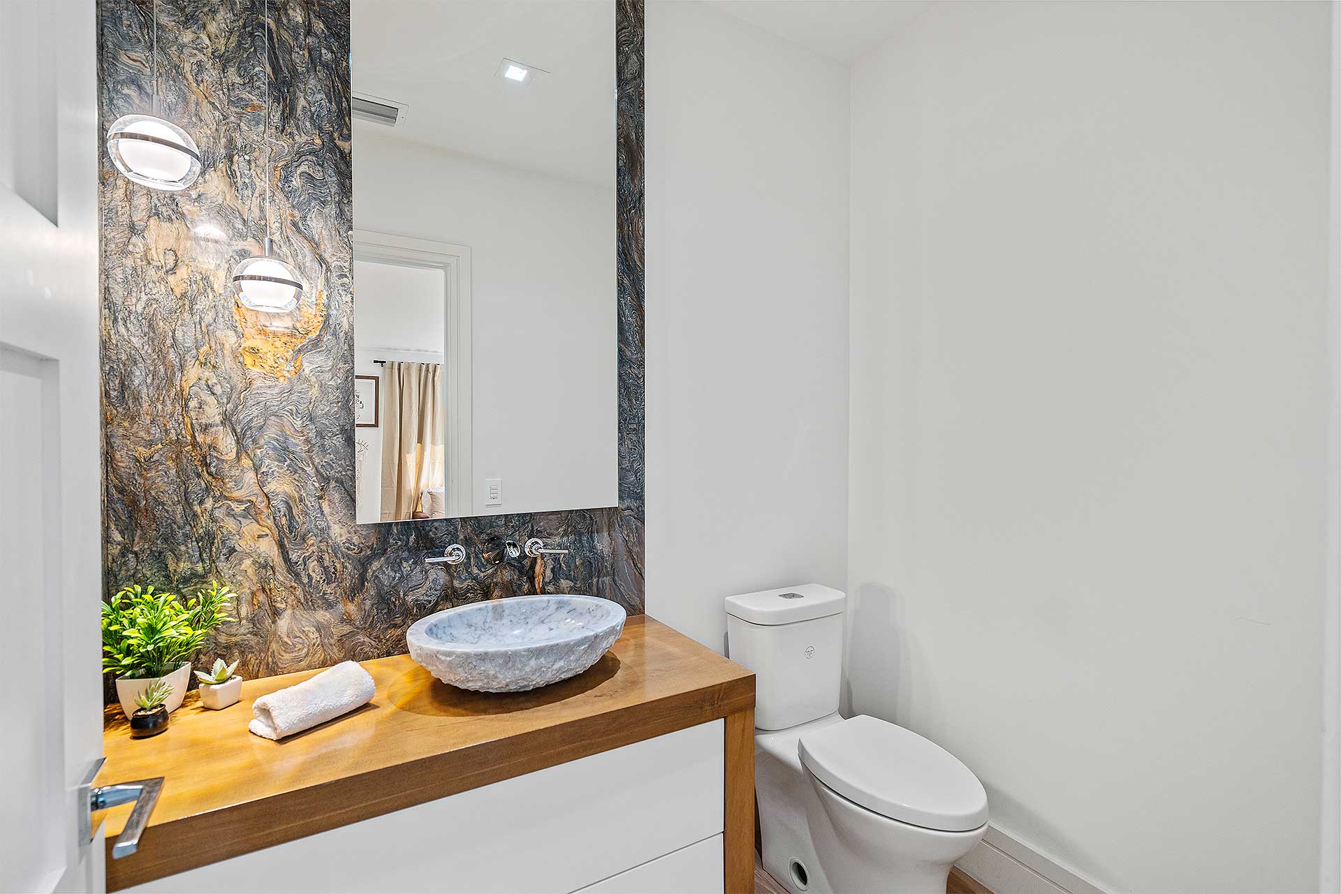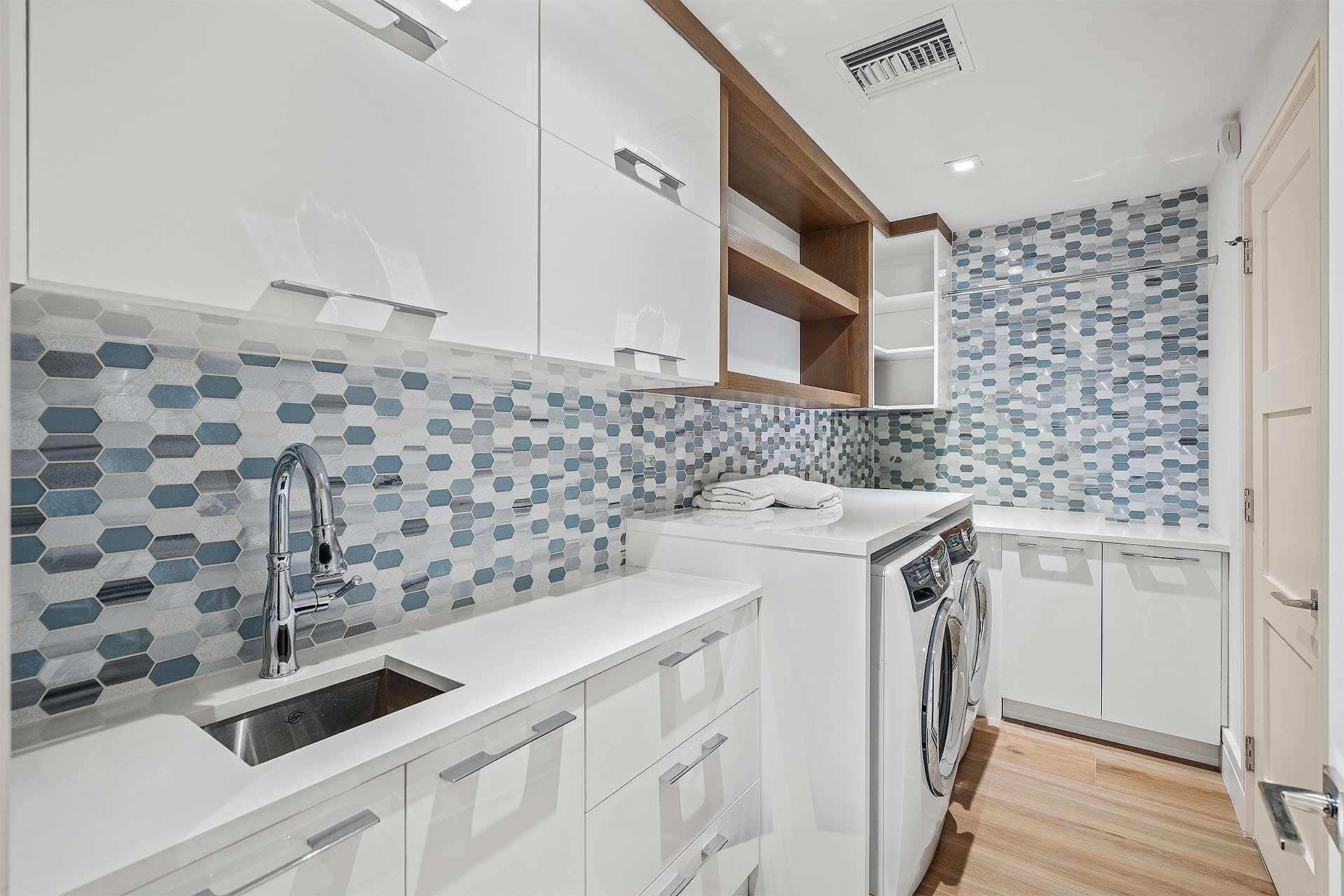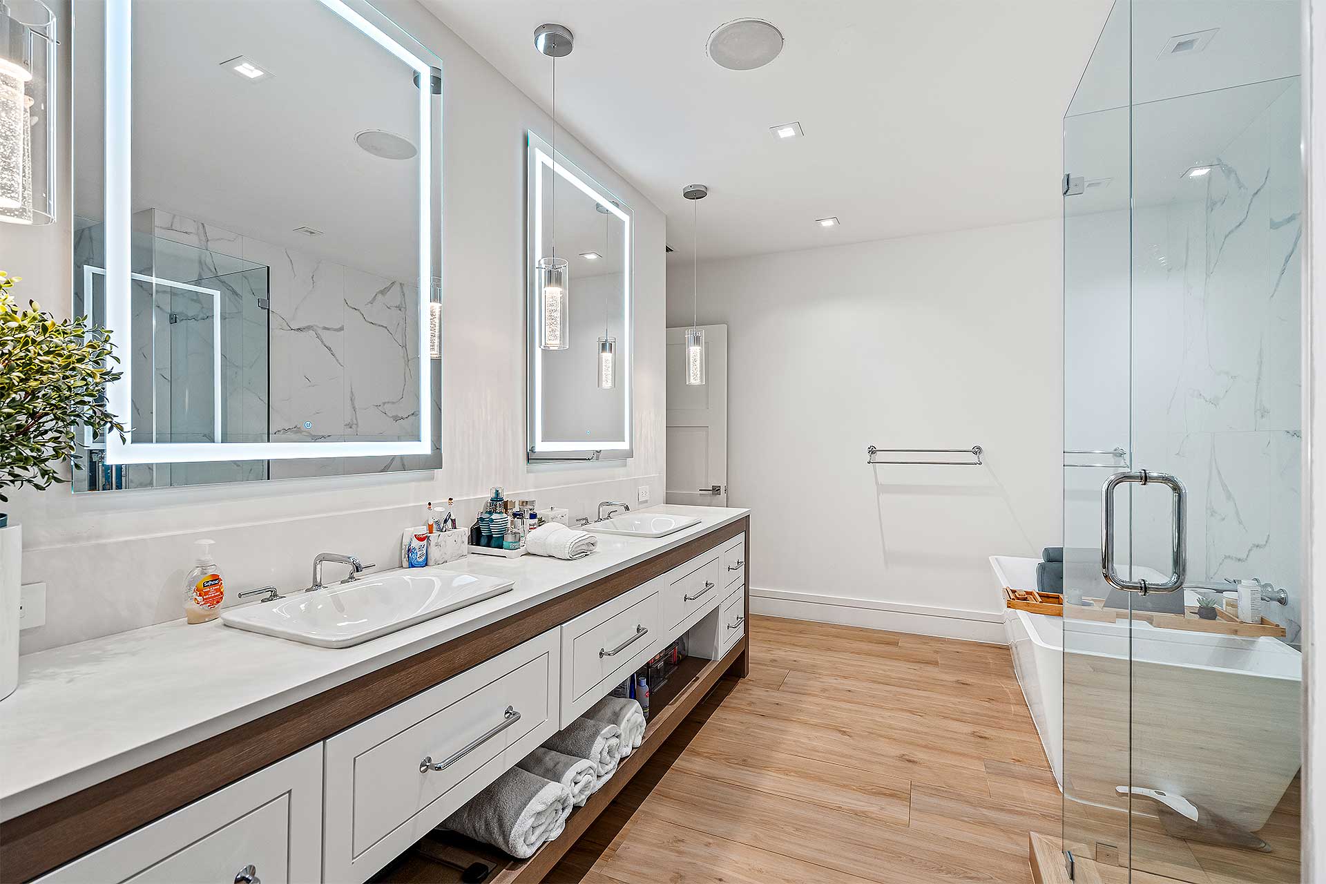 Secluded at the end of a cul-de-sac, this contemporary haven offers both privacy and a refined sense of place. In the lushly landscaped walled backyard oasis, the sun-splashed pool is set within a stone-paver patio, while enhancing opportunities for outdoor living, the fully equipped summer kitchen, with a grill and a refrigerator, invites alfresco gatherings.