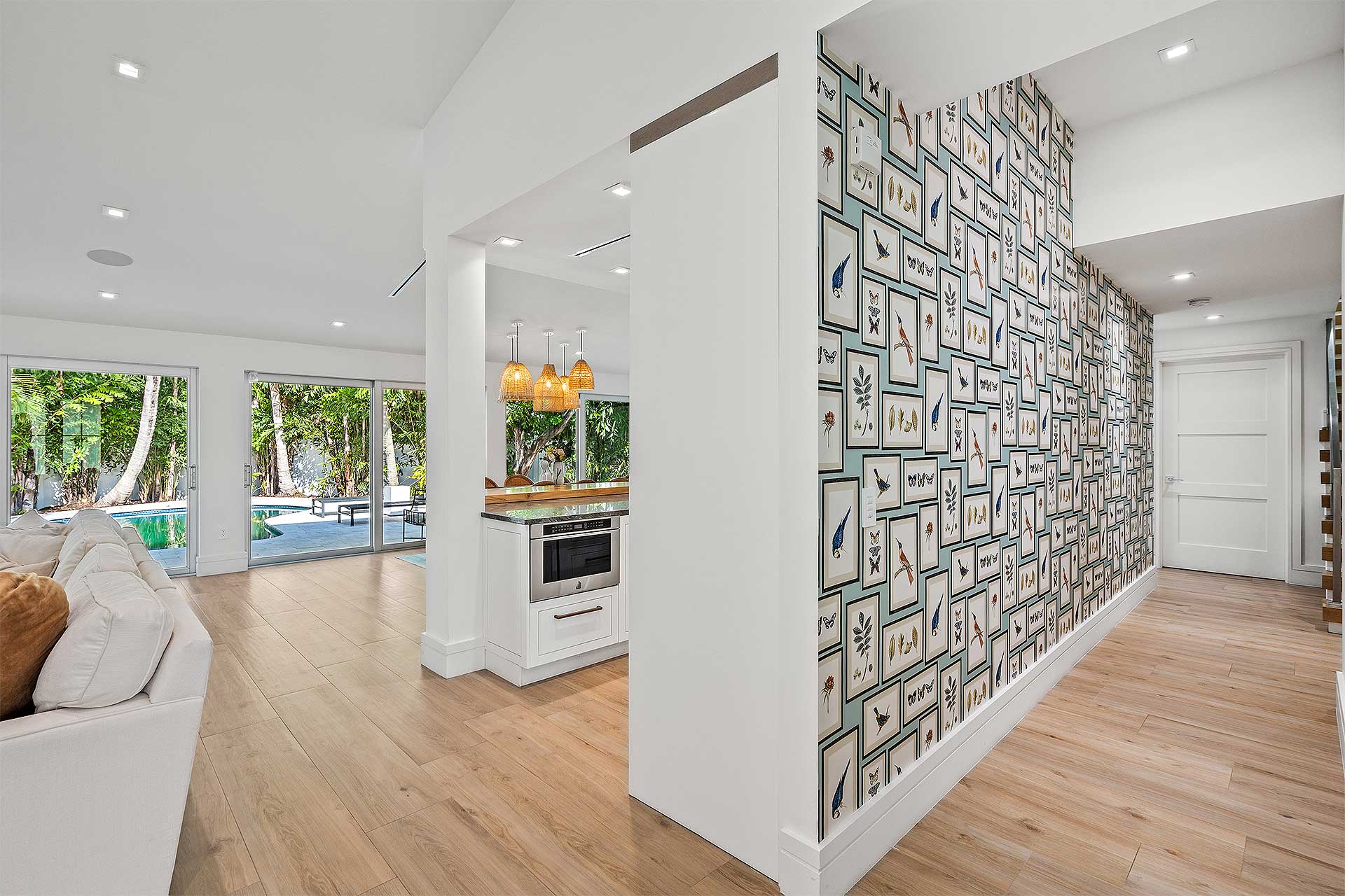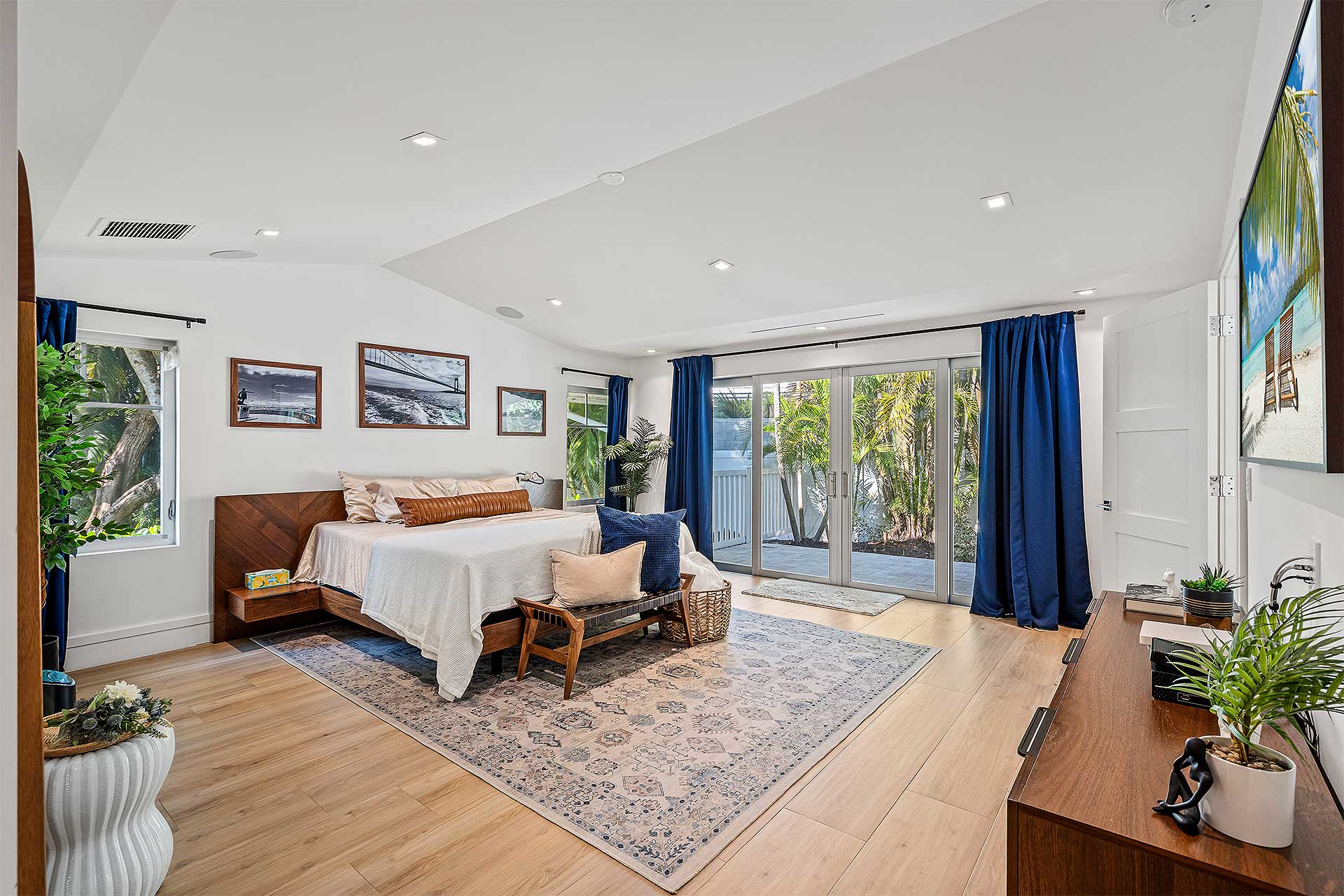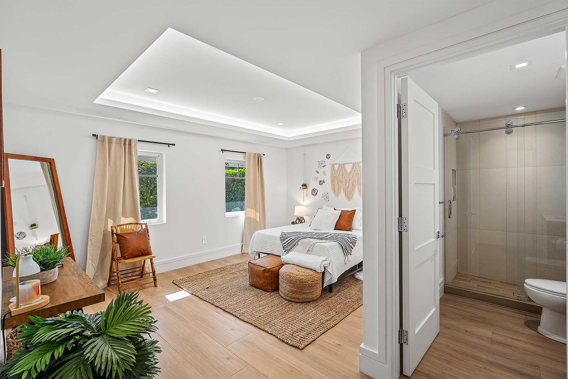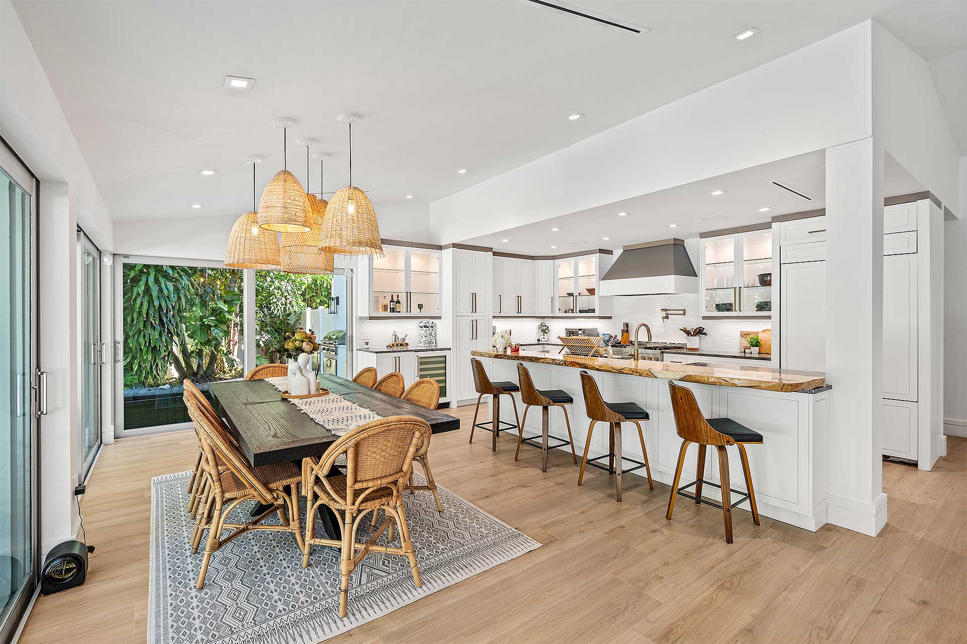 This coastal modern-style gem, built in 2020 by Bella Homes, exemplifies serene sophistication in a lushly landscaped private setting. Tucked within Delray Beach’s coveted Lake Ida enclave, the residence conveys a refined sense of contemporary calm, where light, texture and design come together in perfect balance. Inside, with five bedrooms and 4,383± total square feet, sunlit streamlined interiors showcase a pleasing white-on-white color palette complemented by pale wood-plank flooring and volume ceilings. The open-concept floor plan creates an effortless flow, with all major rooms opening to the lush tropically landscaped pool patio, engendering an ideal environment for indoor/outdoor entertaining as well as formal and casual living. The elegant reception room introduces the chic great room’s living and dining areas that blend seamlessly with the chef’s kitchen, all oriented to pool views. Combining artistry and utility, the chef’s kitchen is fitted with stainless-steel professional-grade appliances, custom contemporary cabinetry – with some illuminated and fronted by glass doors for display — and a handsome work island accented by a driftwood countertop extension that serves as a casual breakfast bar. The first-floor primary suite, a tranquil retreat, also opens to the pool area, and its spa-like bathroom is finished with a double sinks, a stand-alone soaking tub, a glass-enclosed walk-in shower and separate water closet. Completing the first-floor layout are two garden-view guest bedroom suites with one currently repurposed as an office, a cabana-bathroom, laundry room and two-car garage. Upstairs, the loft lounge connects two beautifully appointed guest bedroom suites, creating an ideal haven for visitors. Enhanced by thoughtful details, including a metal roof and decorative tilework in the bathrooms, this contemporary residence, on a beautiful parcel of land in a coveted neighborhood, captures the essence of coastal living.
