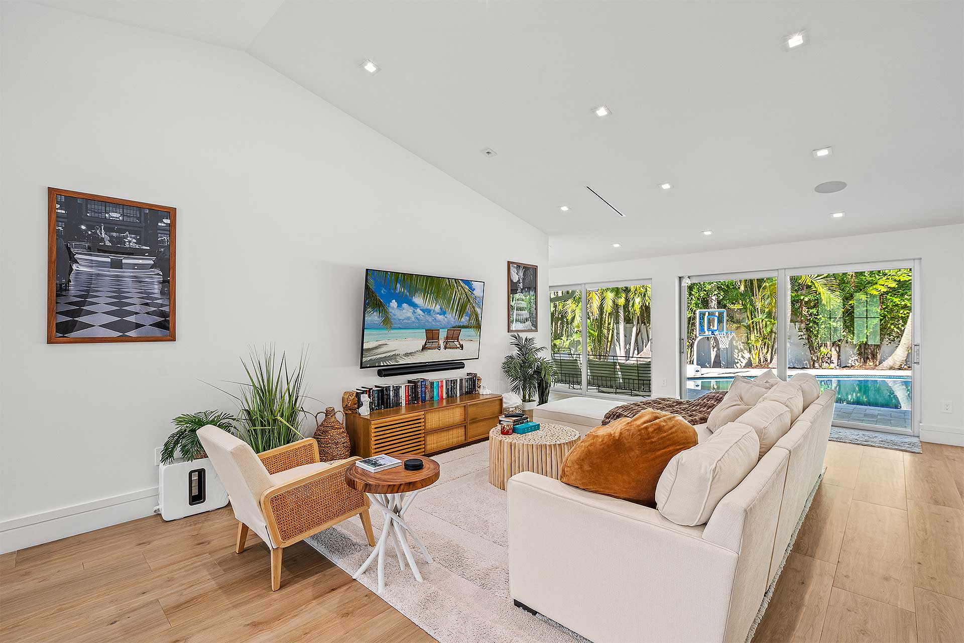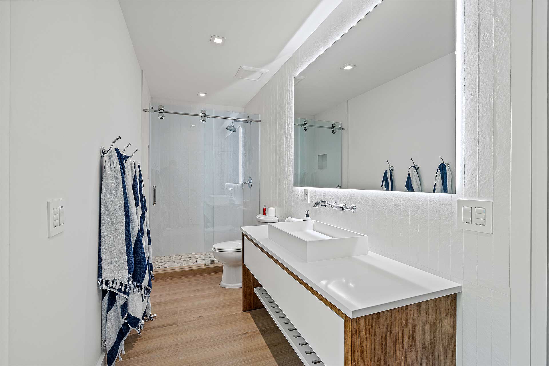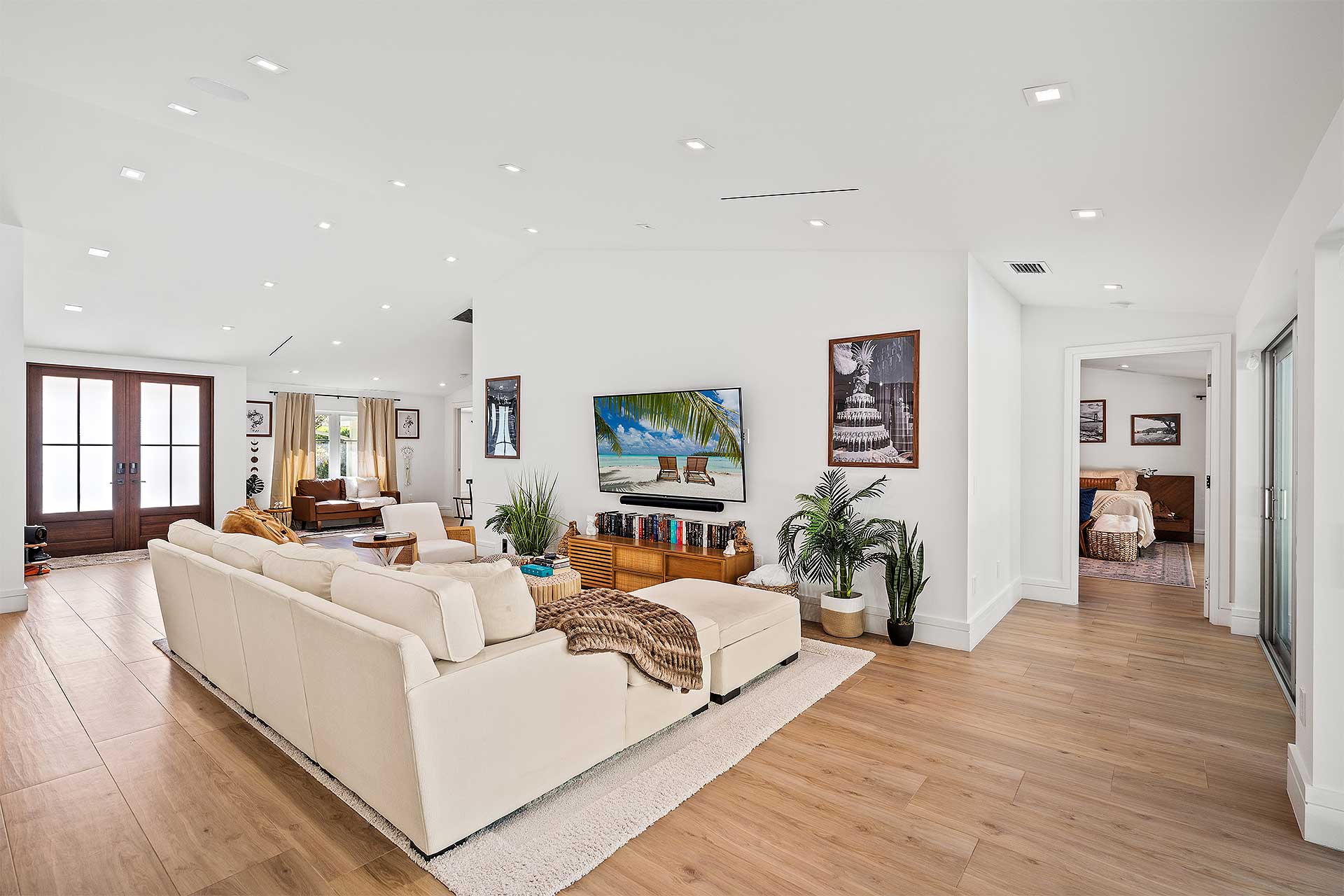 This coastal modern-style gem, built in 2020 by Bella Homes, exemplifies serene sophistication in a lushly landscaped private setting. Tucked within Delray Beach’s coveted Lake Ida enclave, the residence conveys a refined sense of contemporary calm, where light, texture and design come together in perfect balance. Inside, with five bedrooms and 4,383± total square feet, sunlit streamlined interiors showcase a pleasing white-on-white color palette complemented by pale wood-plank flooring and volume ceilings. The open-concept floor plan creates an effortless flow, with all major rooms opening to the lush tropically landscaped pool patio, engendering an ideal environment for indoor/outdoor entertaining as well as formal and casual living. The elegant reception room introduces the chic great room’s living and dining areas that blend seamlessly with the chef’s kitchen, all oriented to pool views. Combining artistry and utility, the chef’s kitchen is fitted with stainless-steel professional-grade appliances, custom contemporary cabinetry – with some illuminated and fronted by glass doors for display — and a handsome work island accented by a driftwood countertop extension that serves as a casual breakfast bar. The first-floor primary suite, a tranquil retreat, also opens to the pool area, and its spa-like bathroom is finished with a double sinks, a stand-alone soaking tub, a glass-enclosed walk-in shower and separate water closet. Completing the first-floor layout are two garden-view guest bedroom suites with one currently repurposed as an office, a cabana-bathroom, laundry room and two-car garage. Upstairs, the loft lounge connects two beautifully appointed guest bedroom suites, creating an ideal haven for visitors. Enhanced by thoughtful details, including a metal roof and decorative tilework in the bathrooms, this contemporary residence, on a beautiful parcel of land in a coveted neighborhood, captures the essence of coastal living.