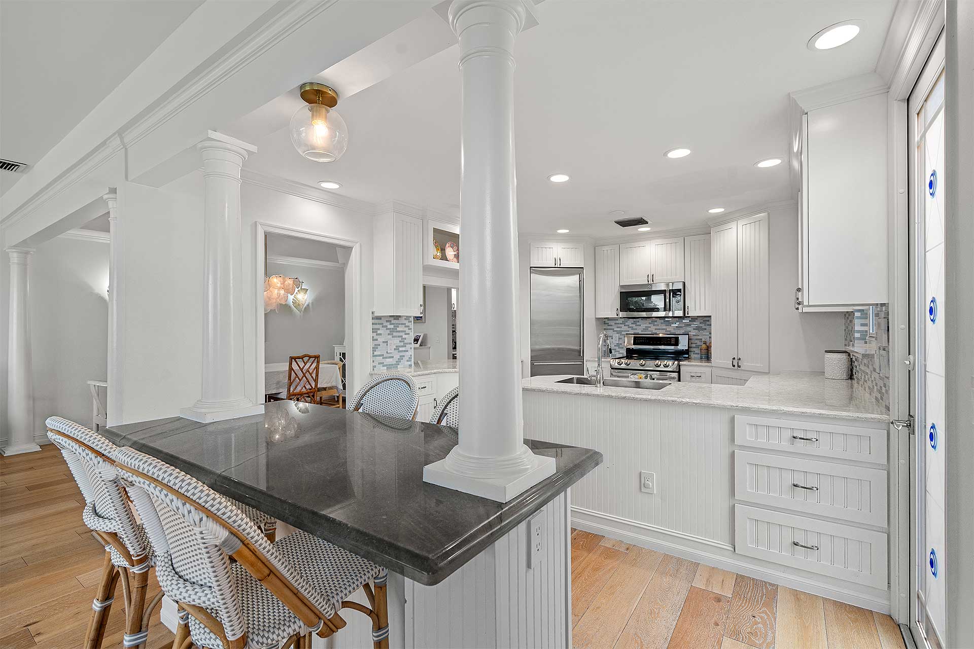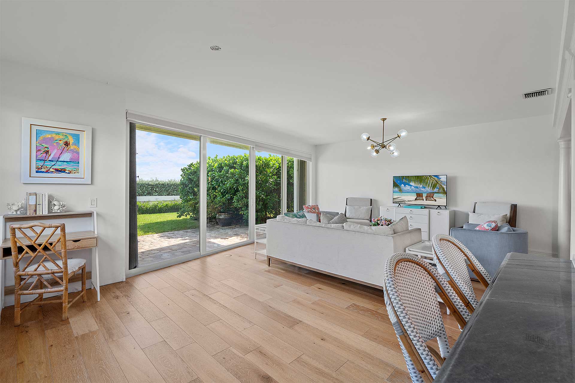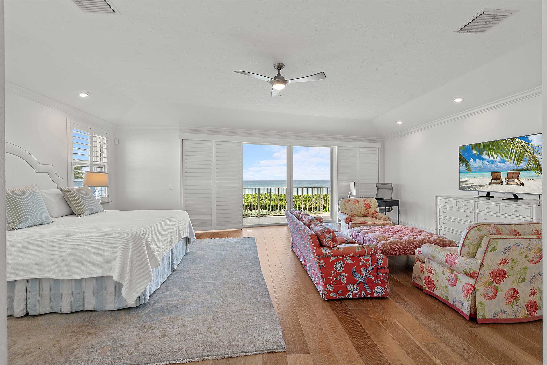 This sophisticated/beach chic oceanfront townhouse in Ocean Ridge offers the utmost in contemporary coastal living. With three bedrooms and boasting 3,658± total square feet designed in an open-concept plan, the living room, fronted by a window-wall of glass sliding doors opening to the patio and ocean, flows seamlessly with the dining area, wet bar, breakfast bar and kitchen. The gourmet kitchen is finished with custom cabinets, Cambria Quartz counters, glass backsplashes, high-end appliances and a passe-plat for easy service. On the second floor, along with the large ensuite guest bedroom is the primary suite, a serene sanctuary with sliding doors leading out to a private balcony delivering awe-inspiring ocean views. The suite comprises two custom-fitted walk-in closets and a tiled spa-like bathroom. Completing the layout is a first-floor guest bedroom suite, laundry room and garage parking for one car with an adjacent uncovered dedicated parking space. Amenities include wood flooring, impact windows and doors and a central vacuum system, with details that include a new roof, new exterior painting, two new air-conditioners and new washer and dryer.