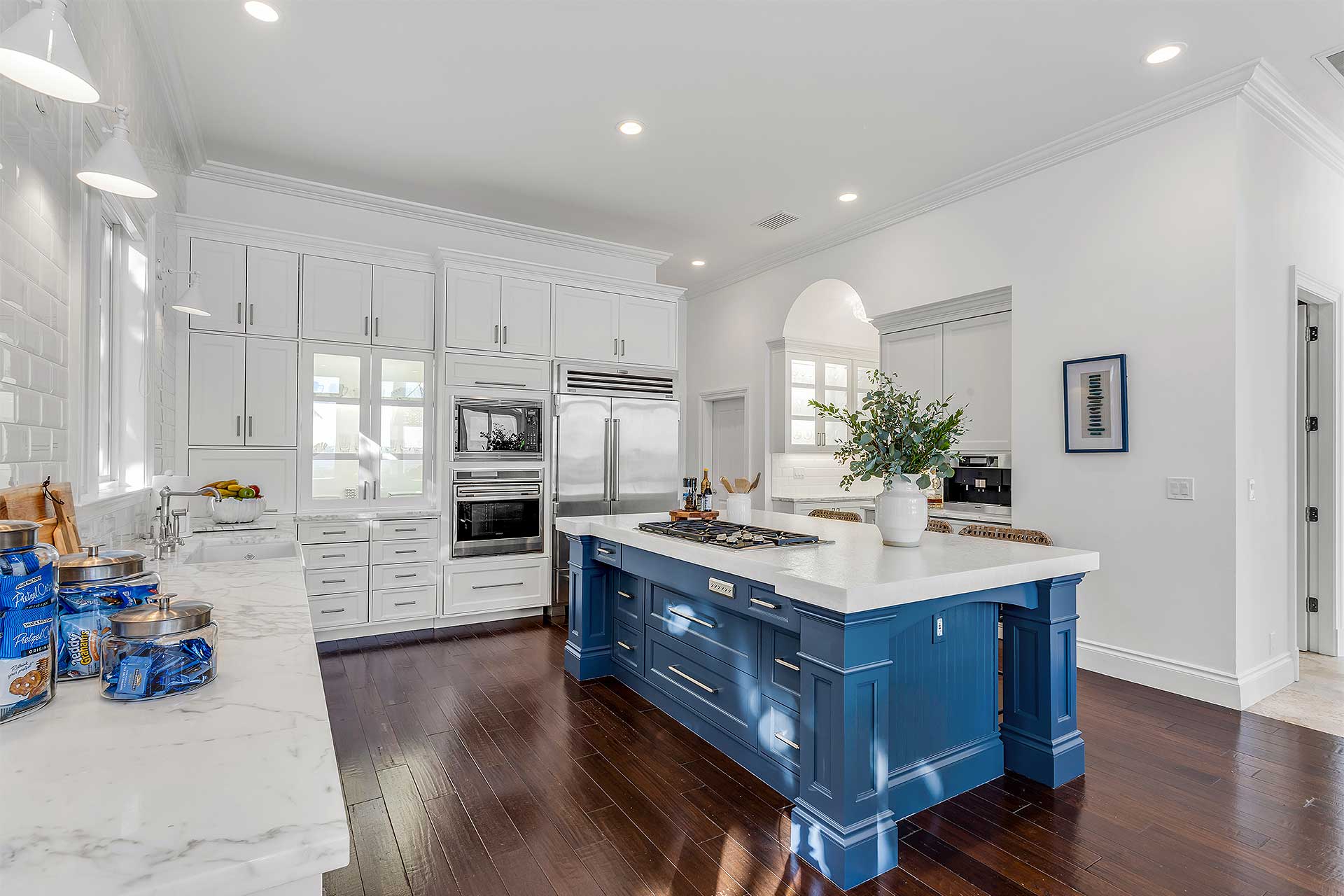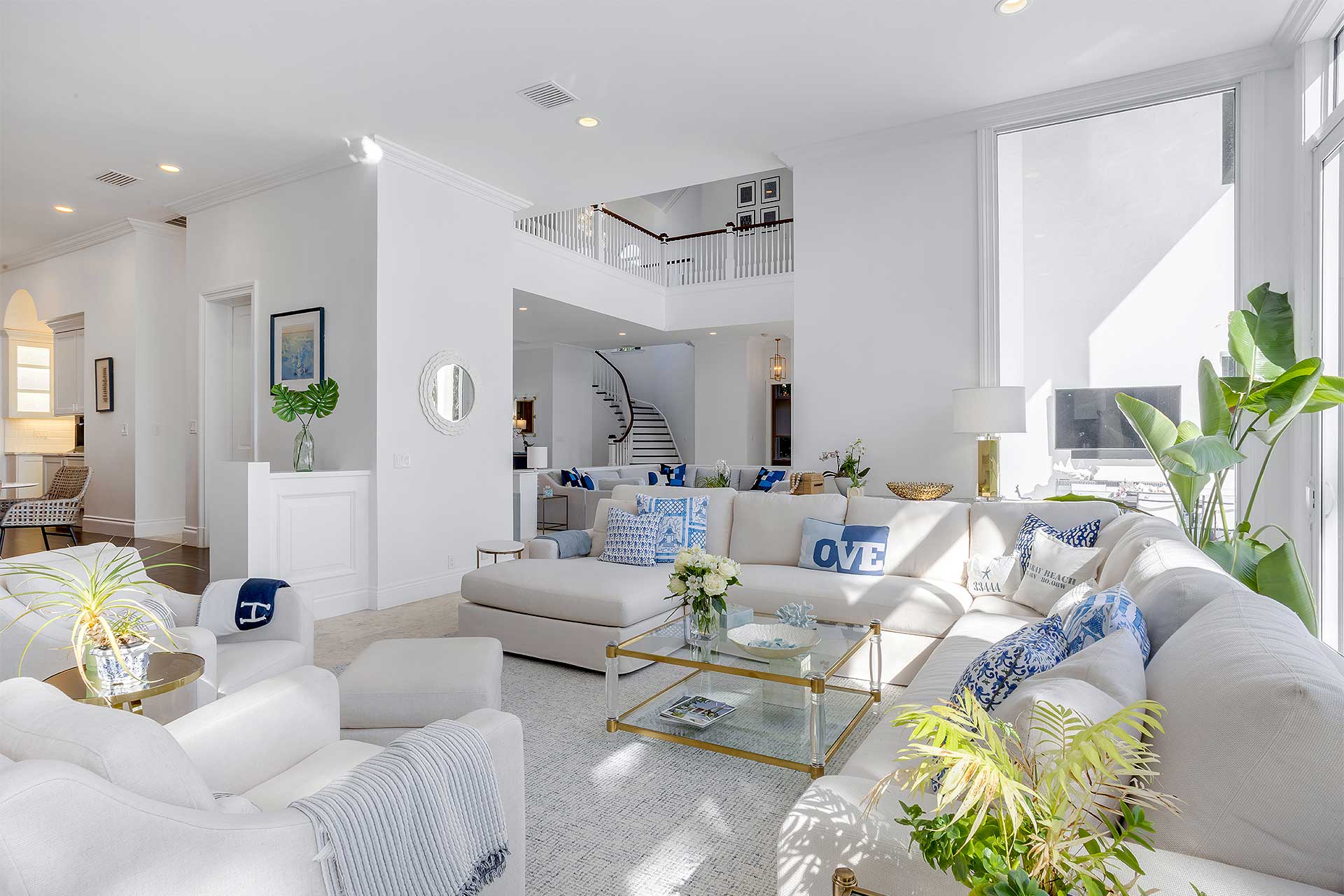 This beautifully furnished estate is designed with a thoughtful layout comprising eight bedrooms, seven bathrooms is 8,448± total square feet. The elegant living room with soaring ceilings and open layout of the main floor offers sweeping picturesque views of the pool and the ocean beyond. Banks of sliding doors in both the living room and family room create a seamless flow to the loggia. Open to the living room is the formal dining room. The family room which is anchored by a gas fireplace flows effortlessly to the breakfast area and kitchen. The newly updated kitchen is fitted with marble and Quartz Crystale countertops, custom cabinetry and high-end appliances that include two Miele dishwashers, Wolf wall oven, convection microwave, cook top and SubZero refrigerator and freezer, wine refrigerator, and beverage drawers. Off the kitchen is a laundry room and access to the attached three car garage. A downstairs guest bedroom, with a closet and an ensuite bathroom that doubles as a cabana bath, currently serves as a gym and office with a built-in desk and storage cabinets. The other first-floor guest bedroom, with a custom-fitted closet and a bathroom, features wood flooring. On the second floor, a chic informal living area and media area with built-in cabinetry offers a second story breathtaking vantage point of the coastline. The completely renovated primary suite’s bedroom opens to an ocean-view balcony with glass-paneled railings, an expansive walk-in closet, and a renovated spa-like bathroom with dual sinks, jetted tub, walk-in glass-enclosed multi-head shower, a vanity table, linen closet, and a water closet enclosing the automatic bidet toilet. Four of the second-floor bedrooms are completed with custom-fitted closets, with each set of bedrooms sharing a bathroom. Off the back staircase is an additional ensuite bedroom in its own section that can serve as staff quarters and a laundry room with custom cabinetry. New amenities include a 2022 concrete tile roof, renovated primary suite, an updated kitchen 2025, new jetted spa and replastered pool, new pool equipment, new front gate, outdoor grill, water softener, and washer and dryer in the upstairs laundry. Additional enhancements include impact-rated windows and doors, natural gas accommodation and four air conditioners.